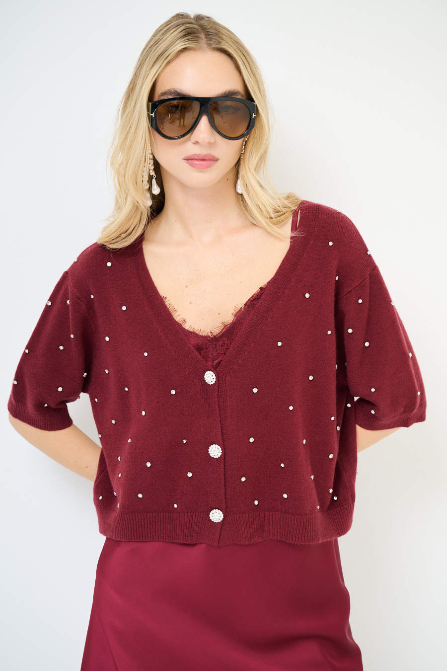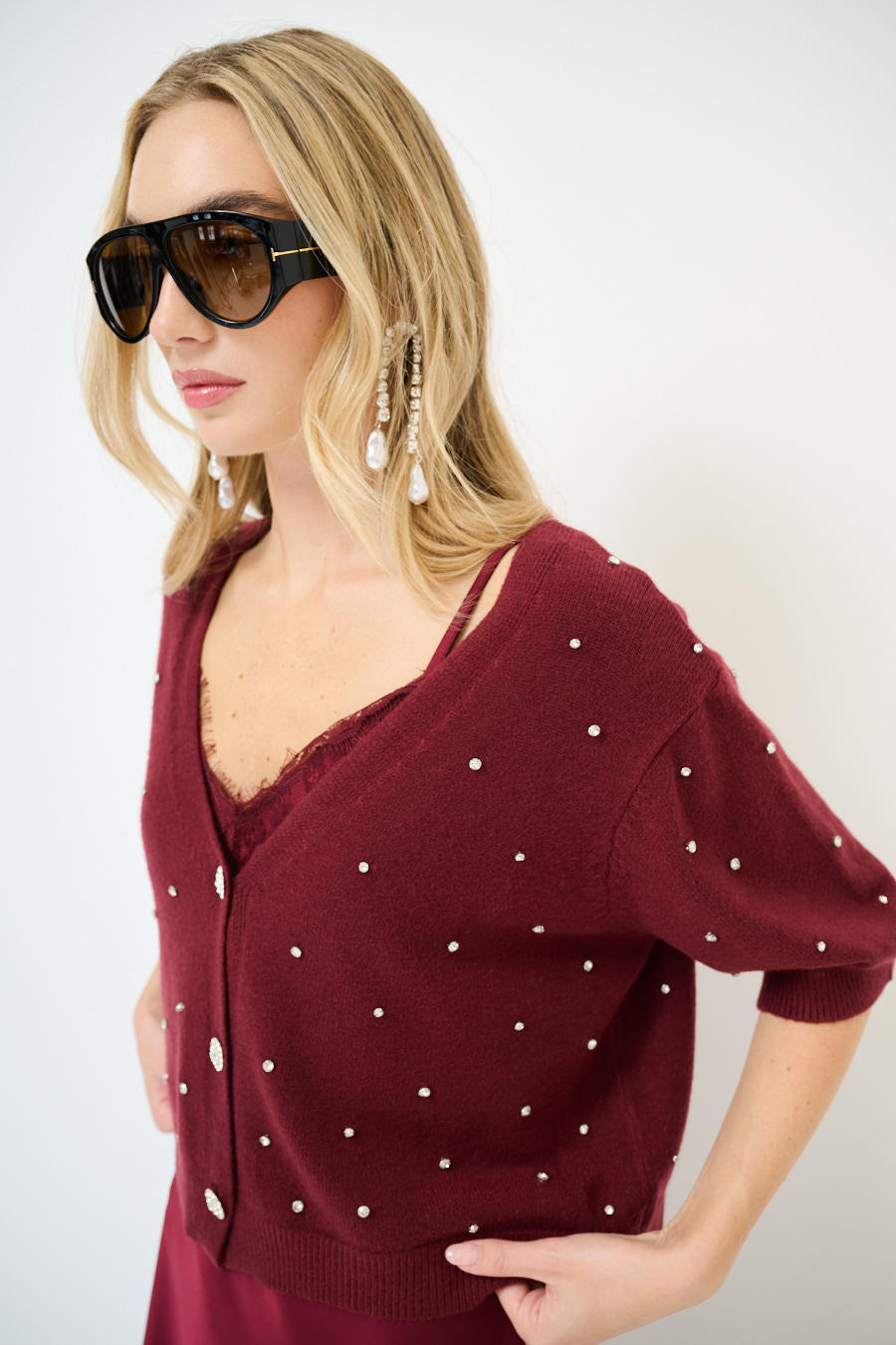Cardigan con mezza manica e bottoni gioiello, applicazioni strass all over.