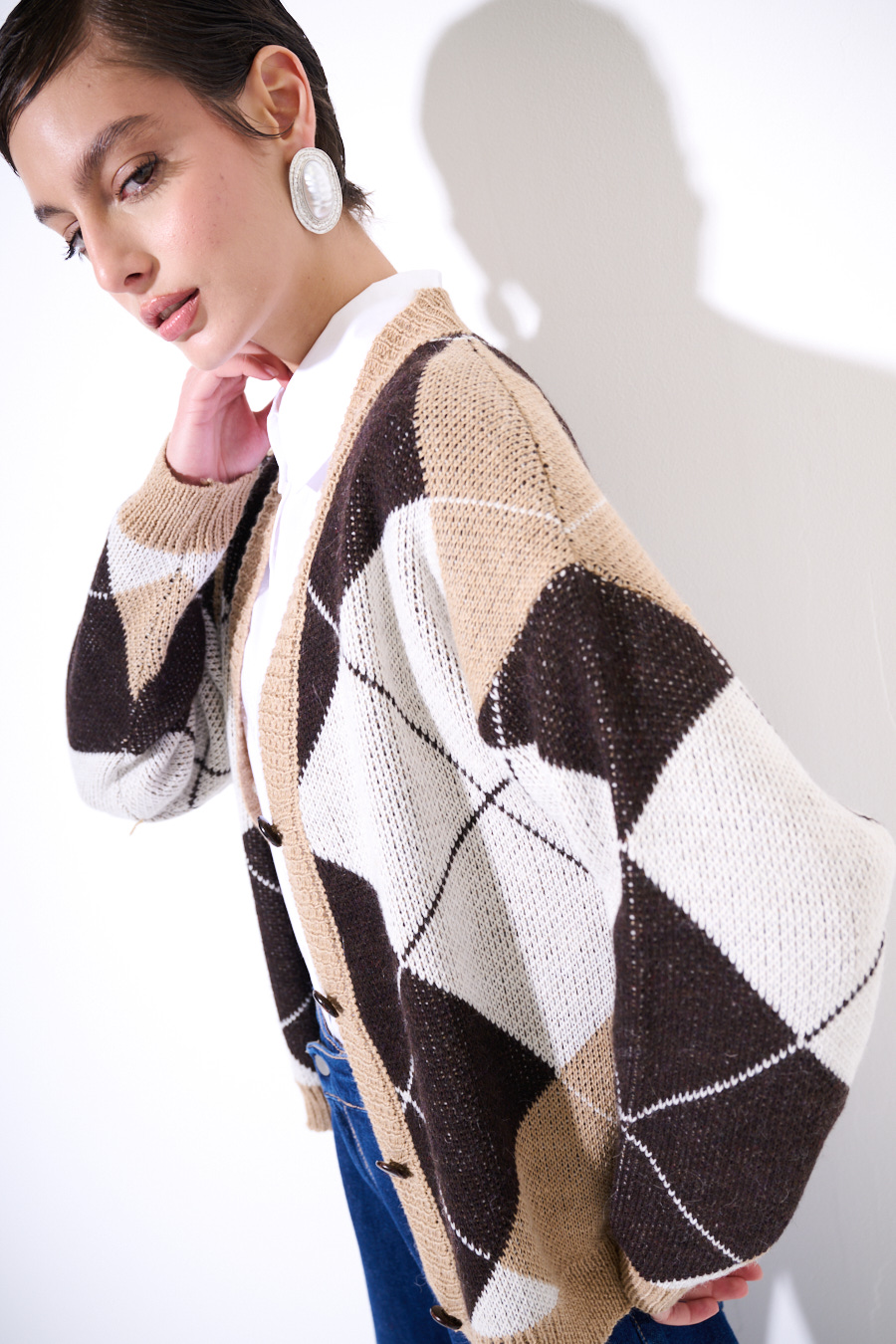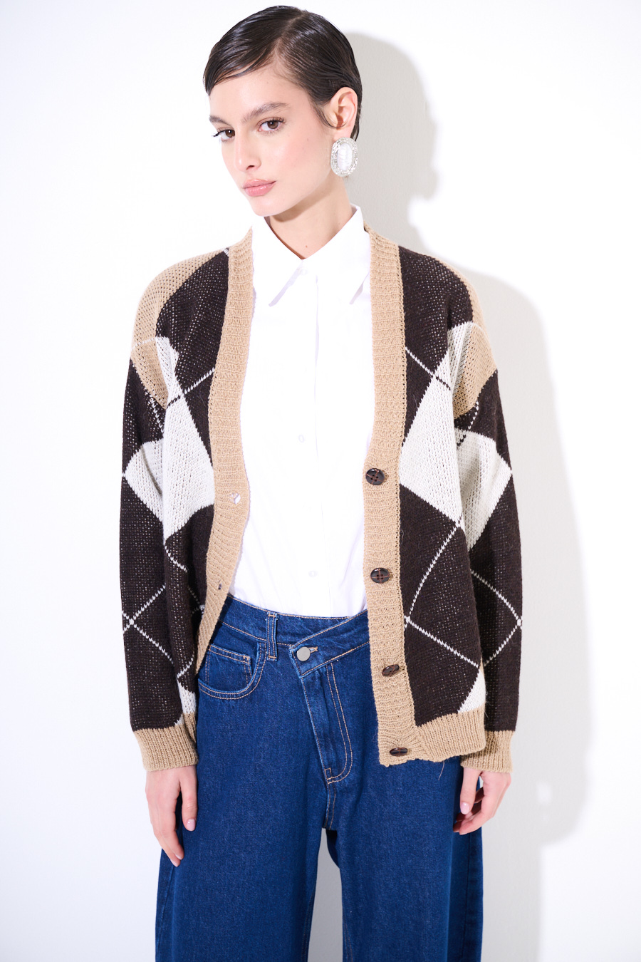 Cardigan over con disegno rombi, con scollo a v, chiusura con bottoni.