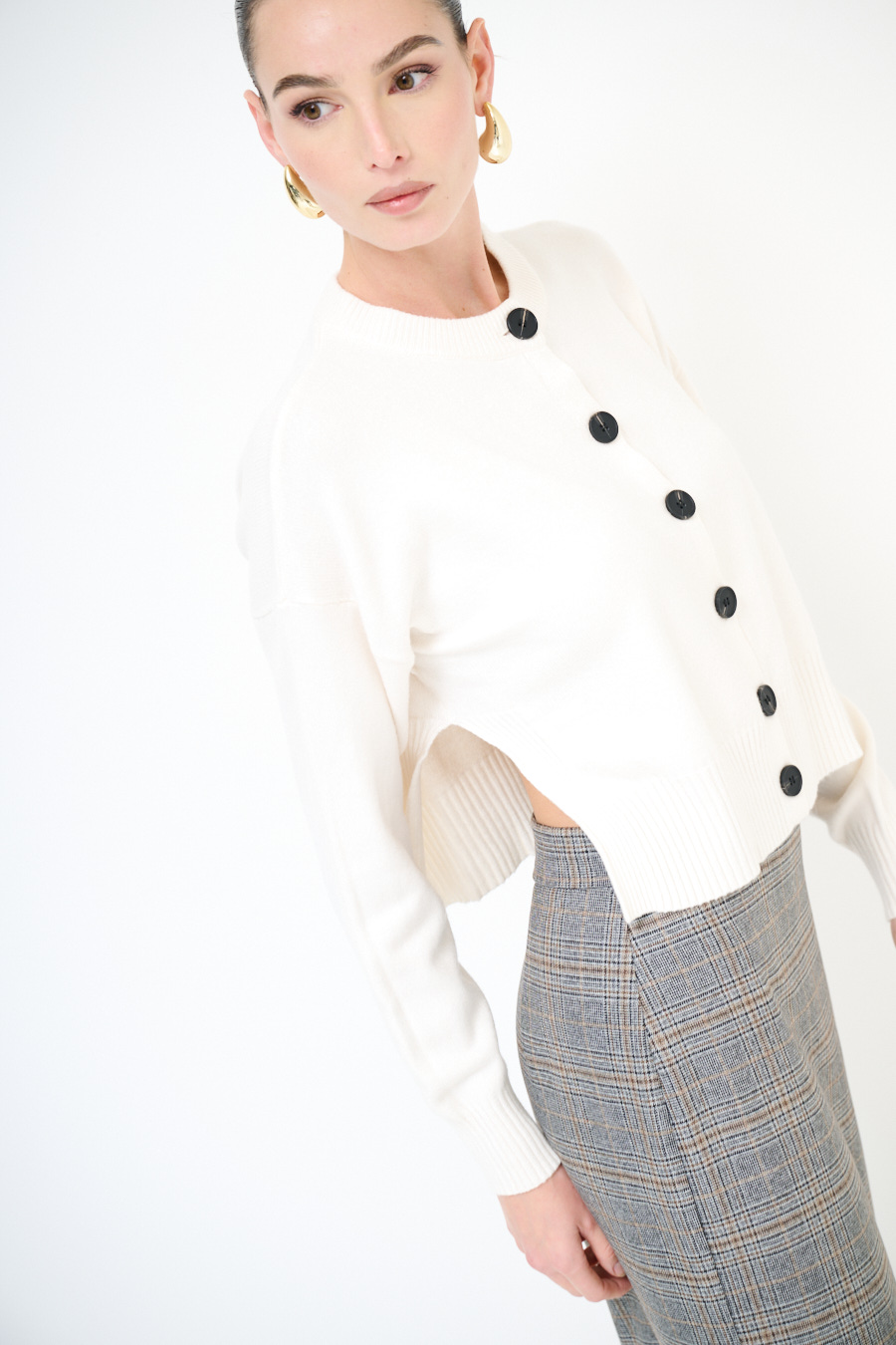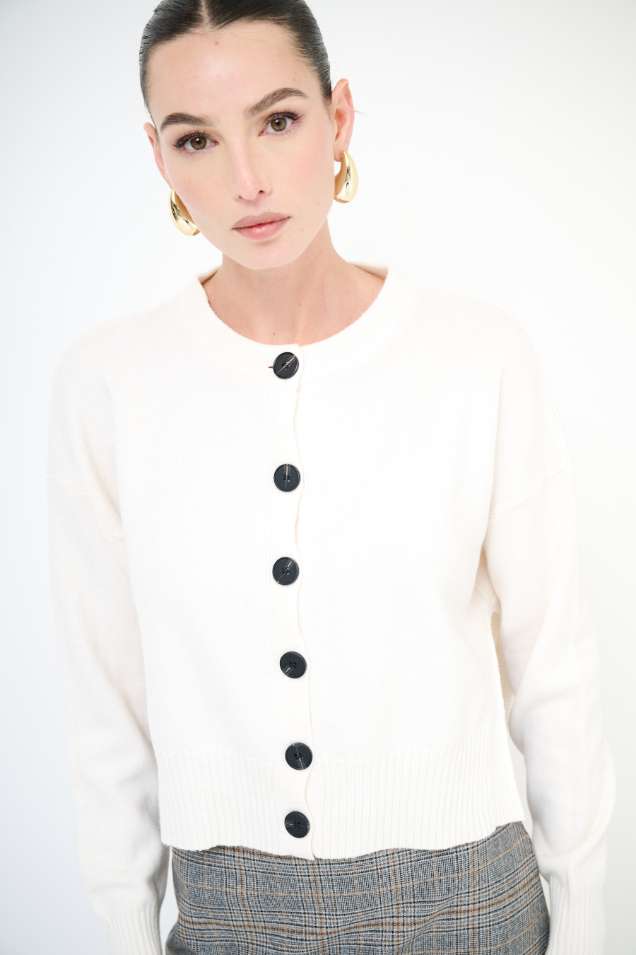 Cardigan paricollo con profili a coste alta su polsino e fondo e abbottonatura centrale.