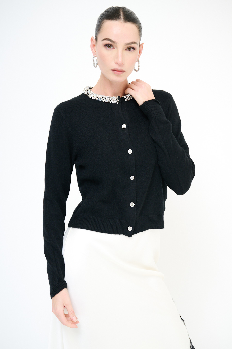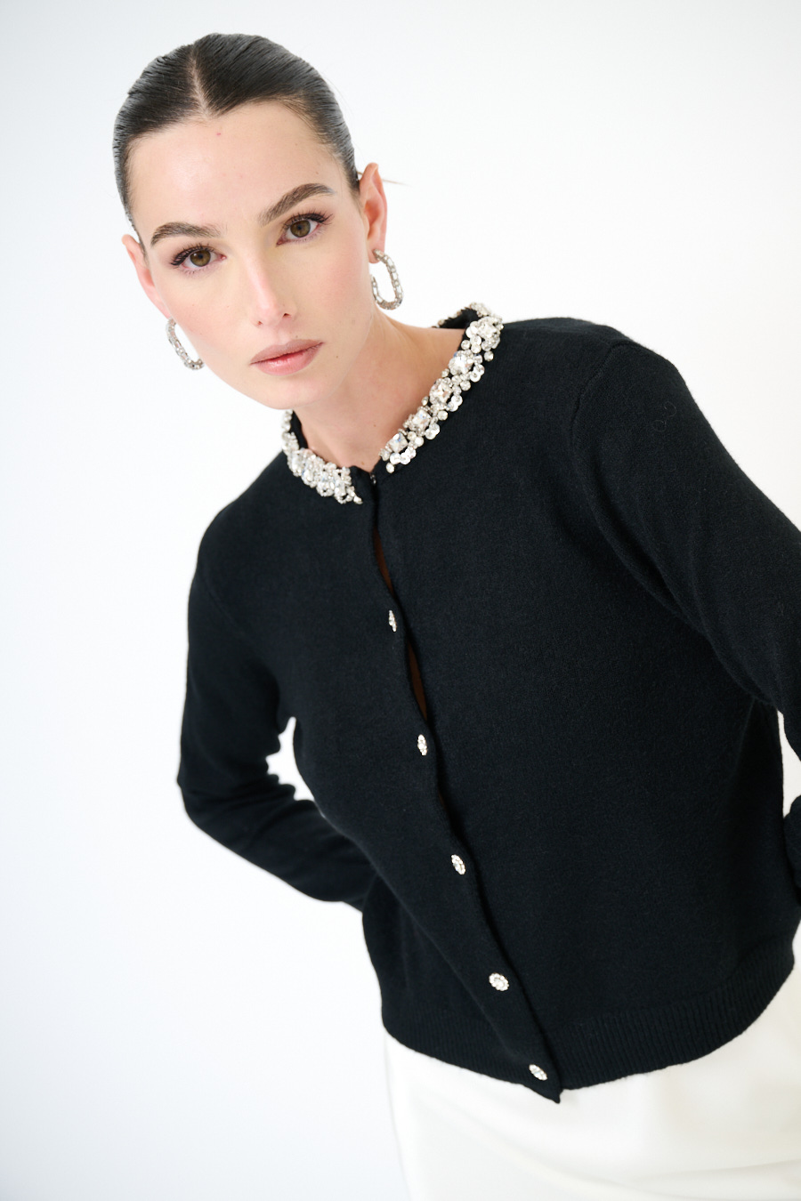 Cardigan paricollo con bottoni gioiello e applicazione strass intorno al collo.