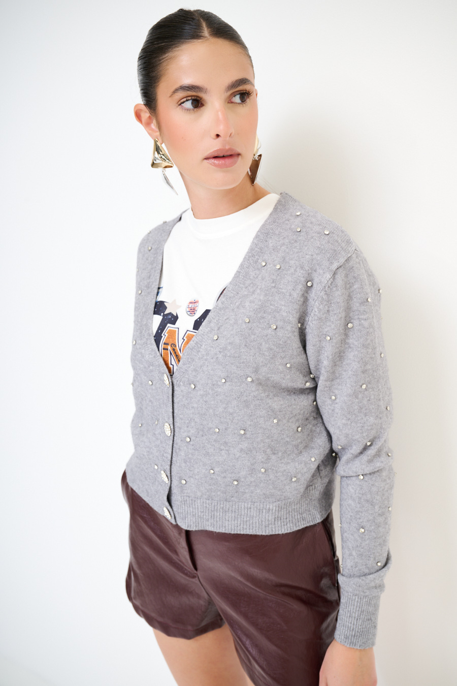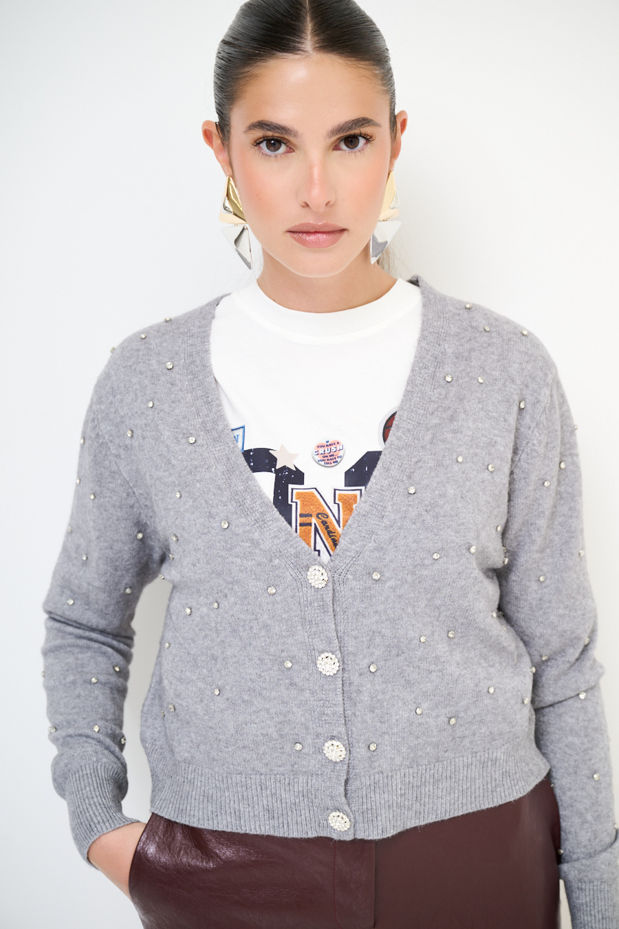 CARDIGAN SCOLLO V STRASS GRIGIO MEDIO