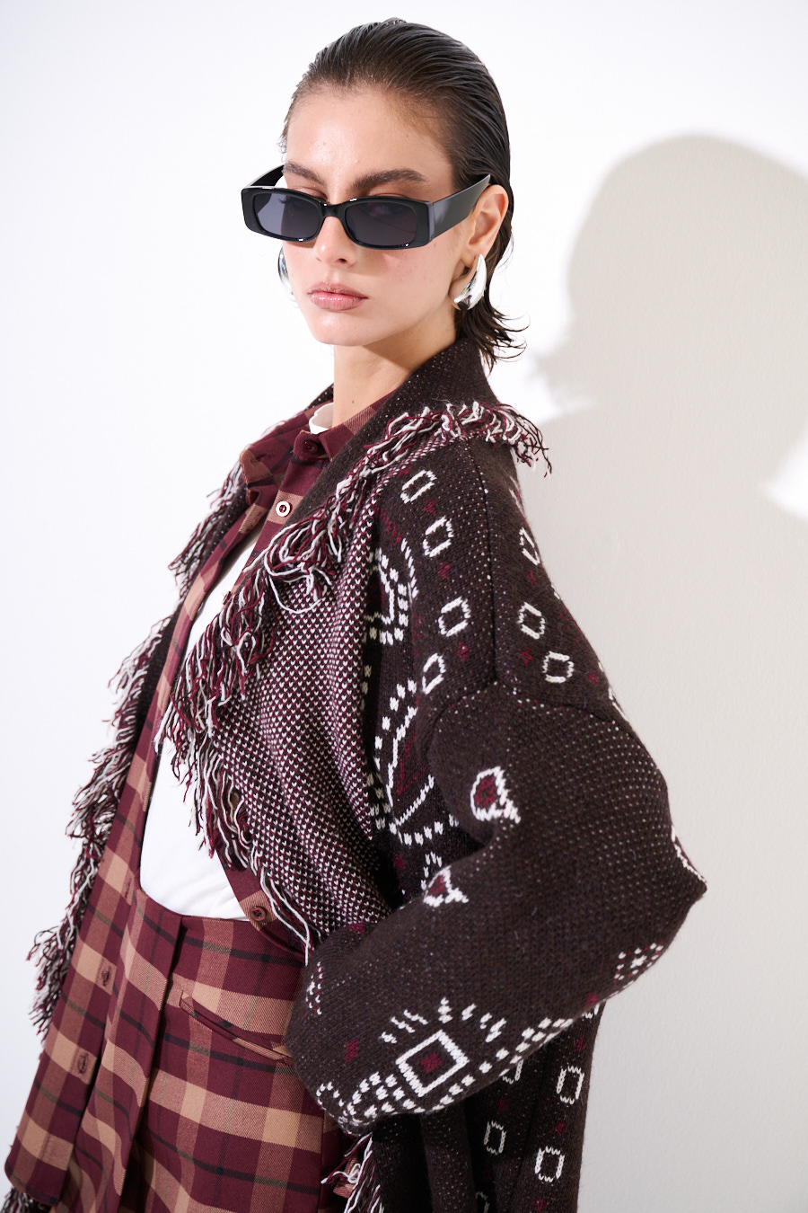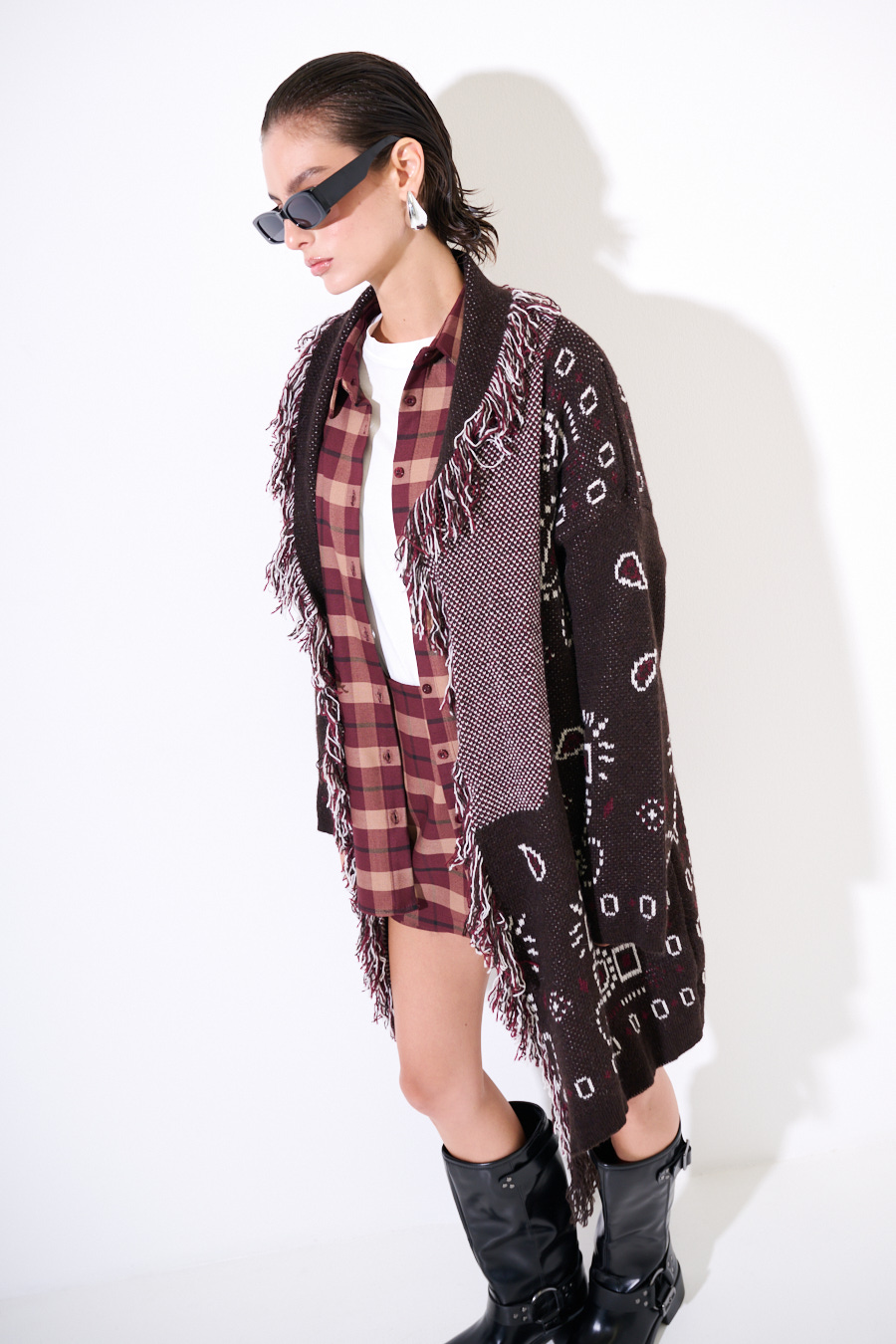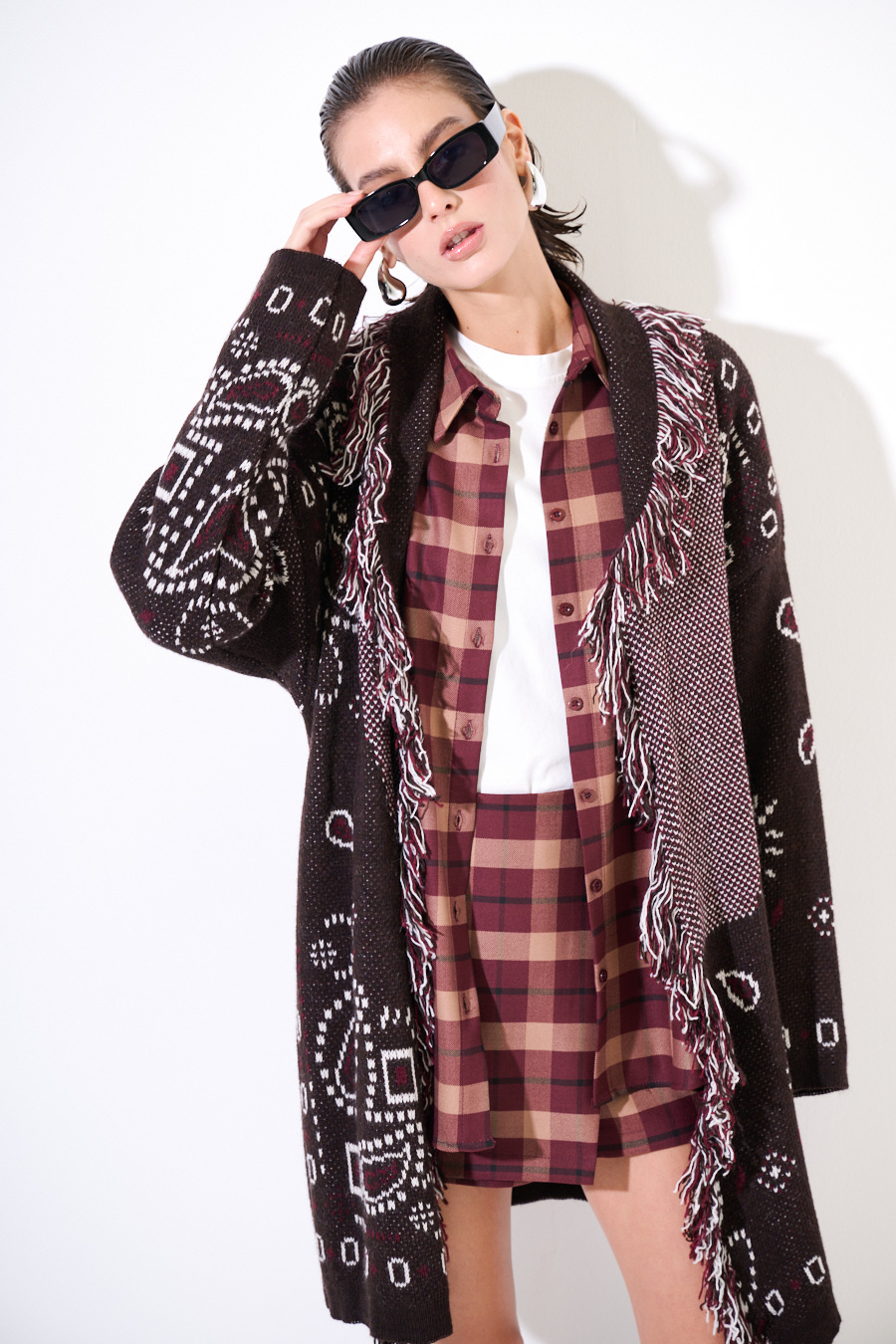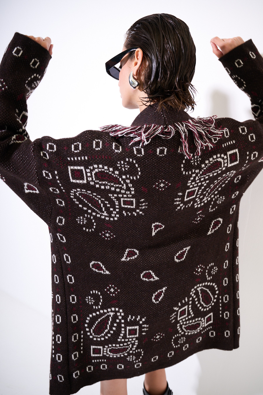 Giacca kimono lunga in maglia con disegno paisley bandana, con cintura in vita e sfrangiato davanti.