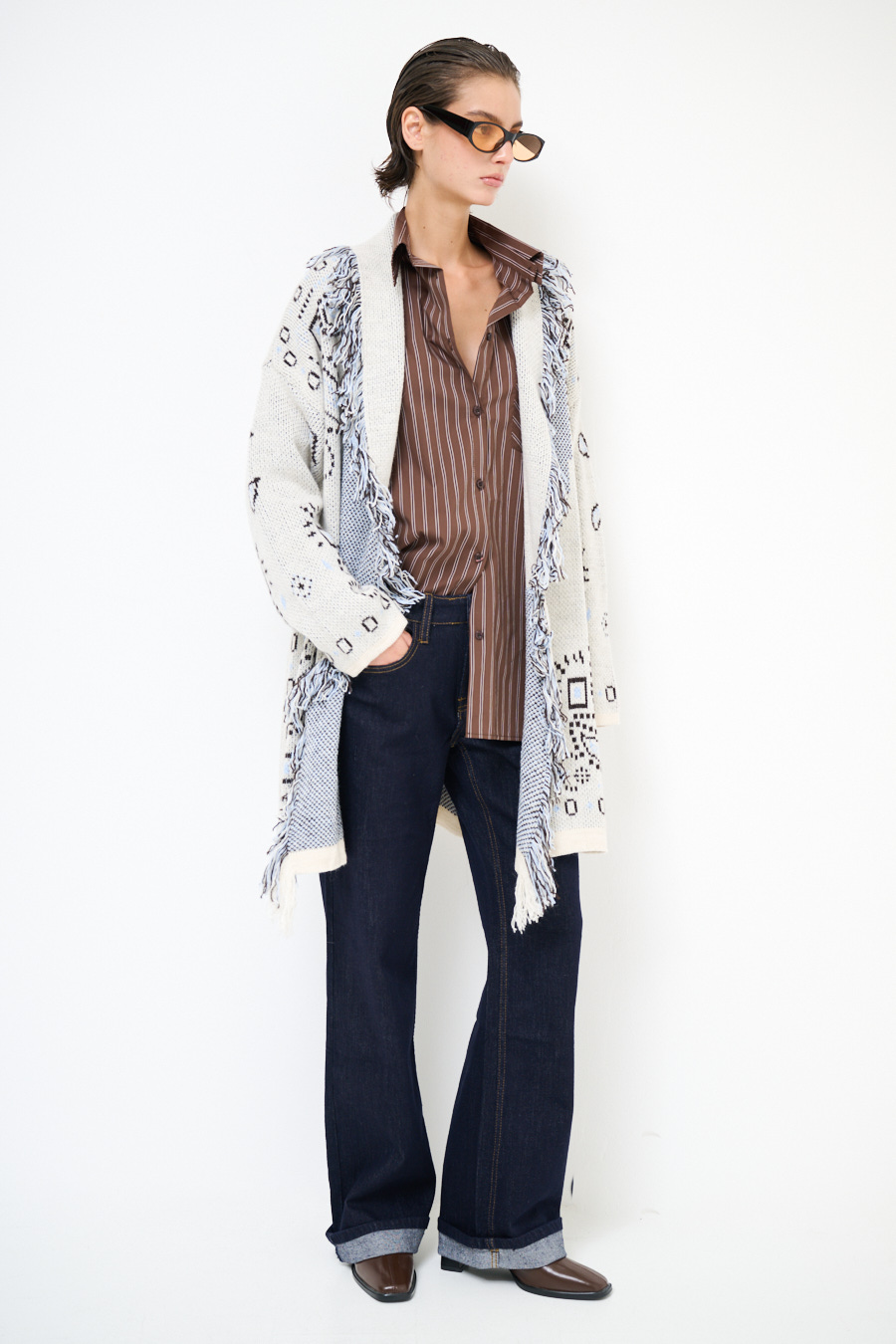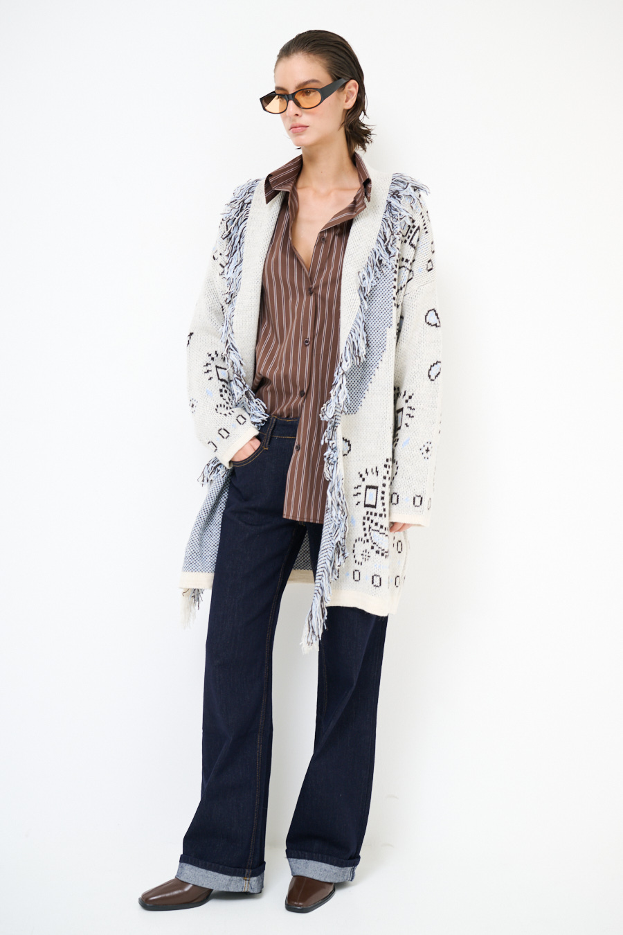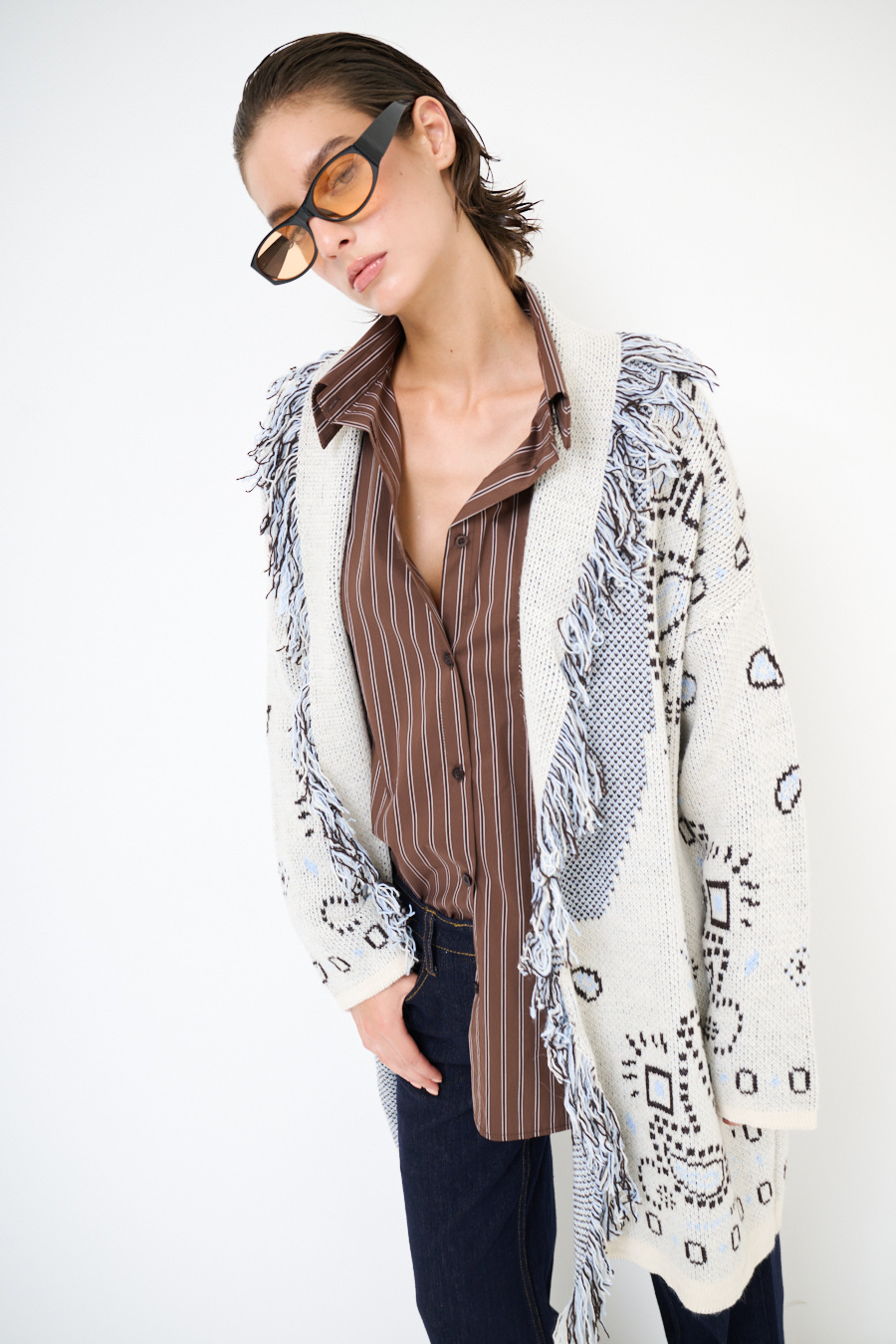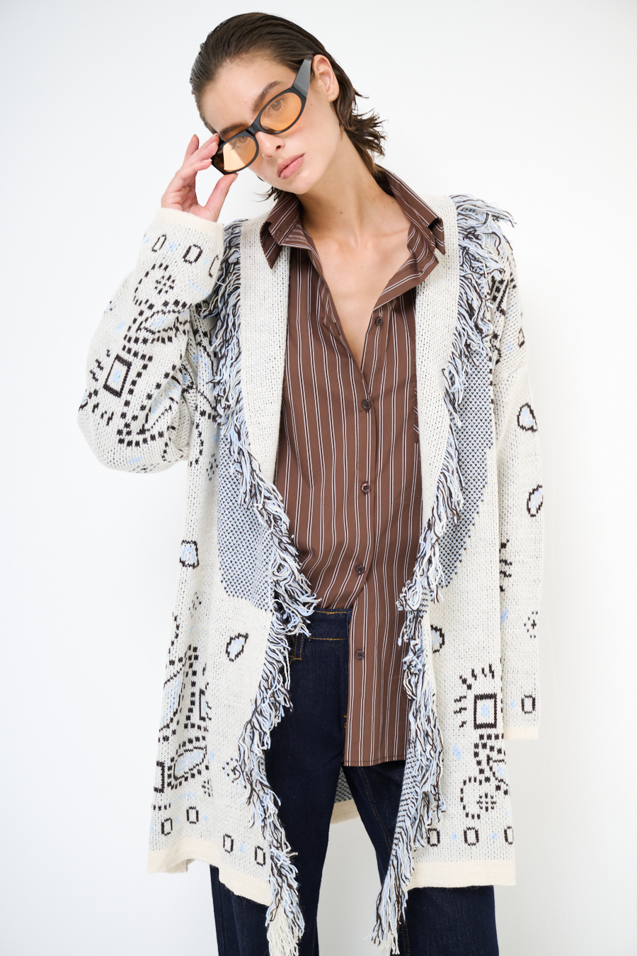 Giacca kimono lunga in maglia con disegno paisley bandana, con cintura in vita e sfrangiato davanti.