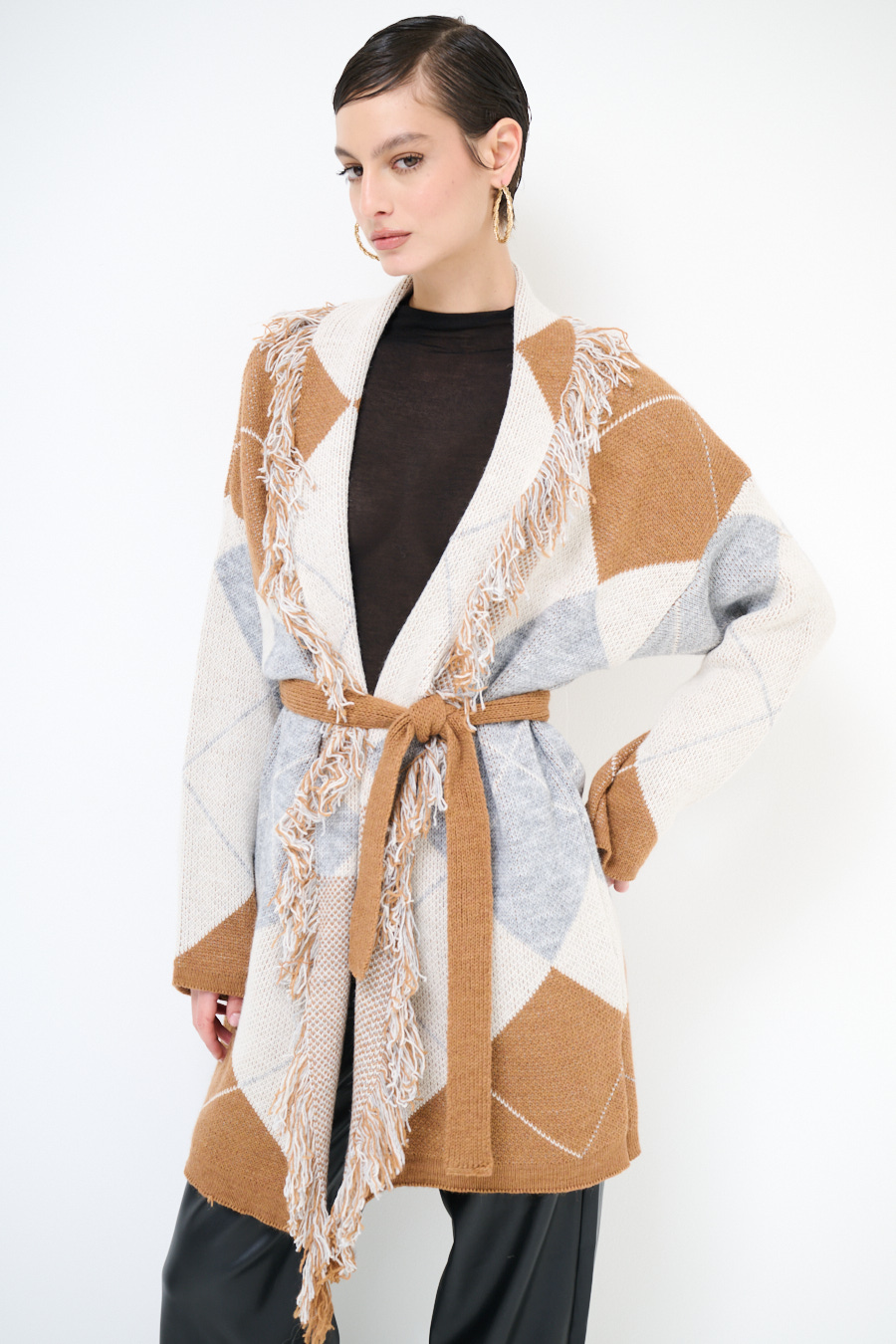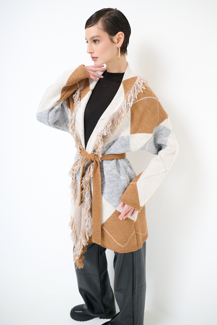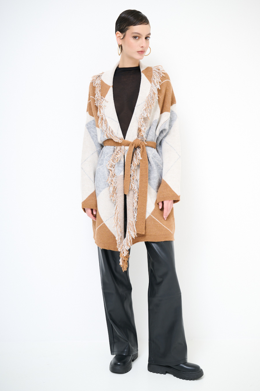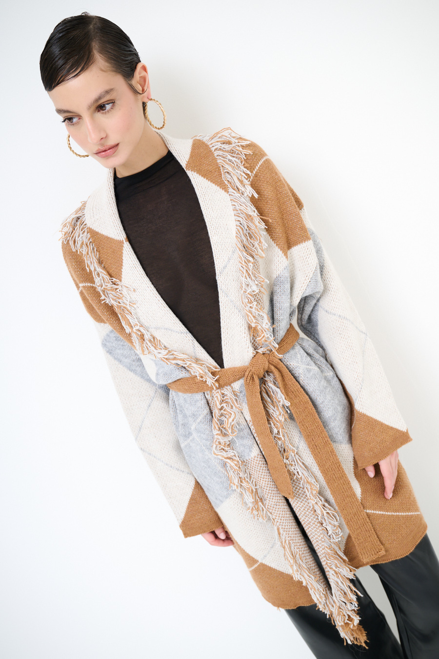 Cardigan aperto con disegno rombi, sfrangiato sul profilo, e con cintura in vita.