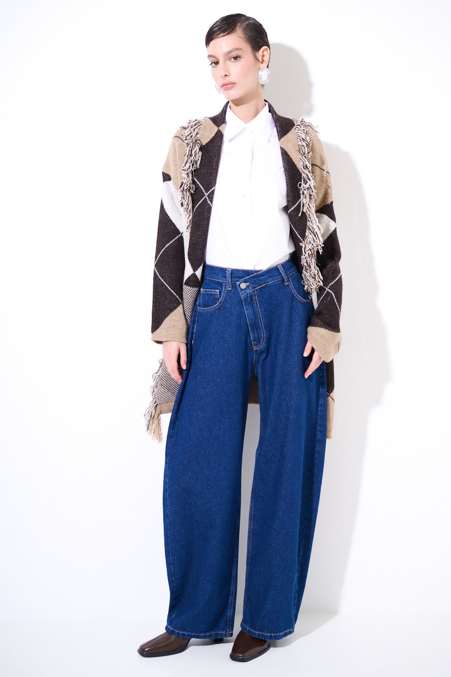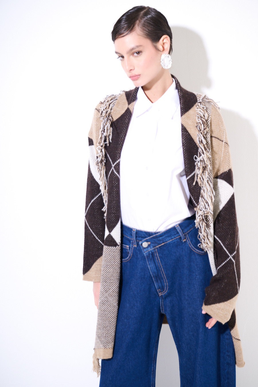 Cardigan aperto con disegno rombi, sfrangiato sul profilo, e con cintura in vita.