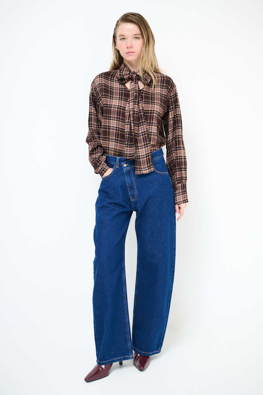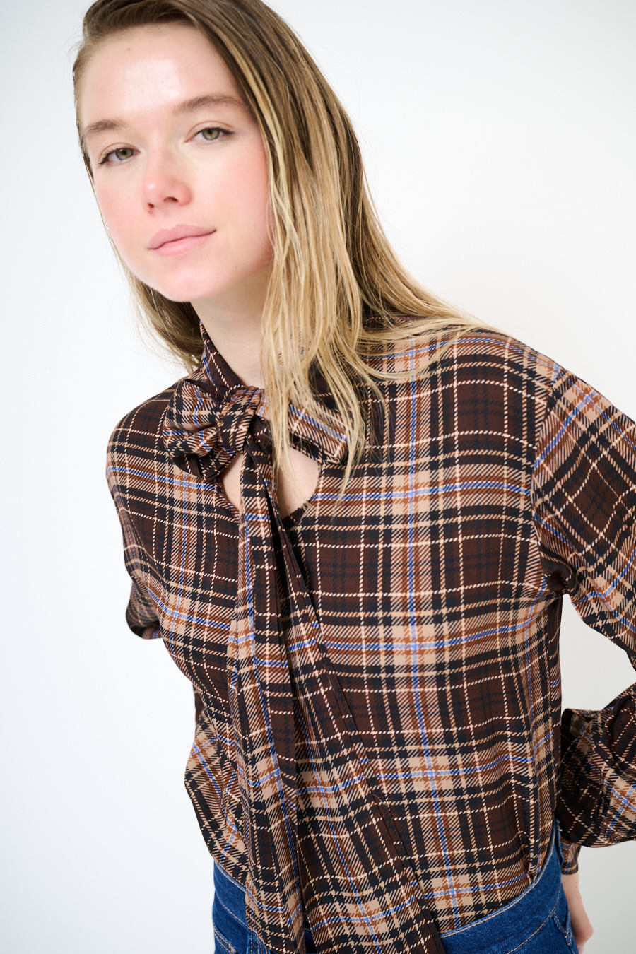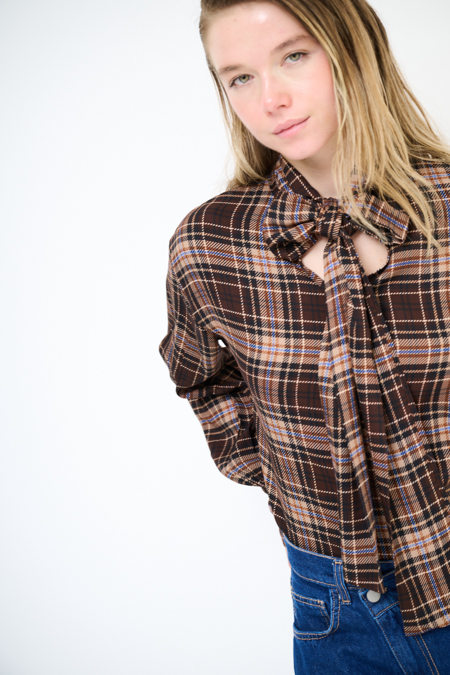 Blusa oversize a quadri annodata al collo con fiocco, con manica lunga ampia.