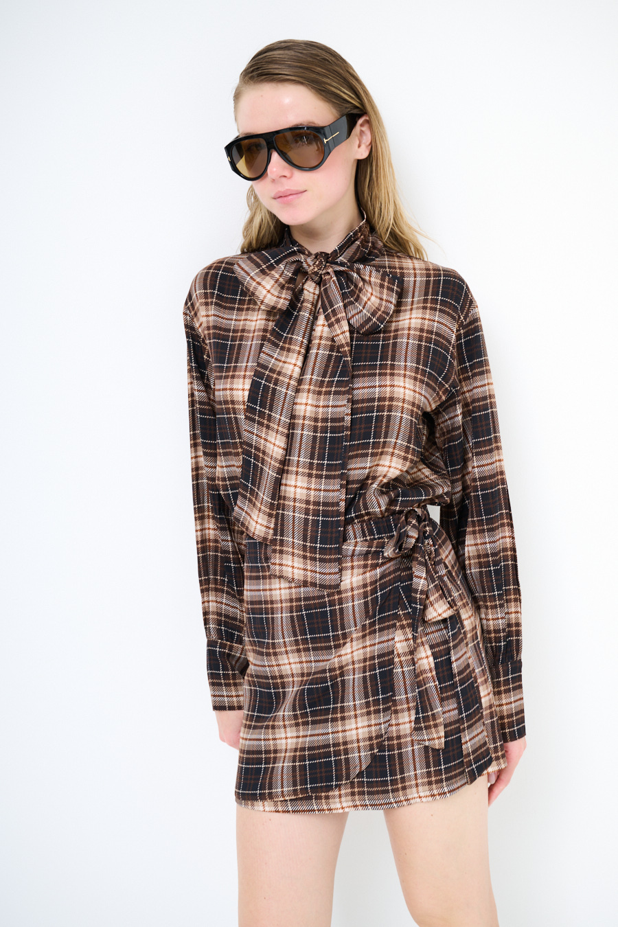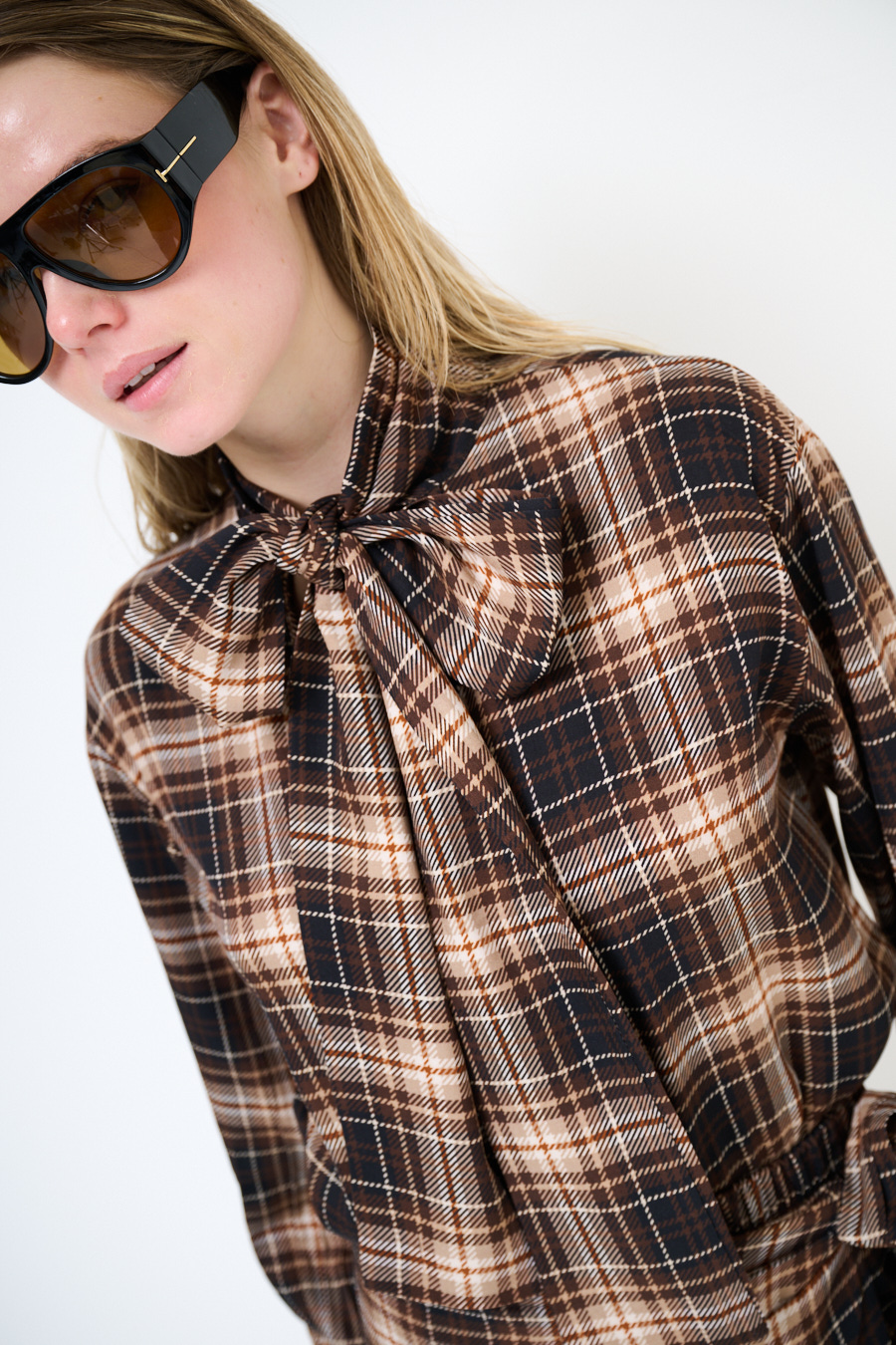 Blusa oversize a quadri annodata al collo con fiocco, con manica lunga ampia.