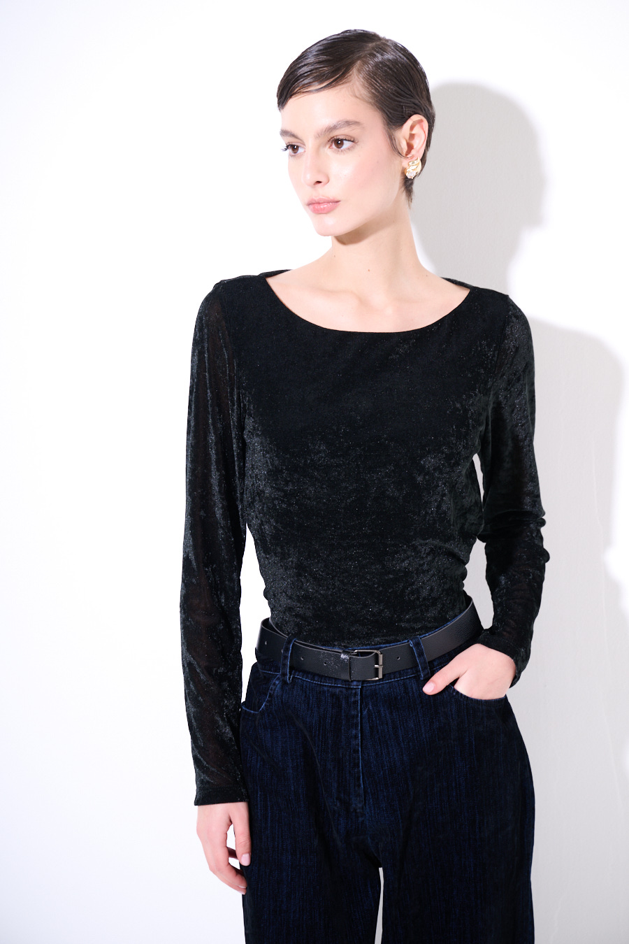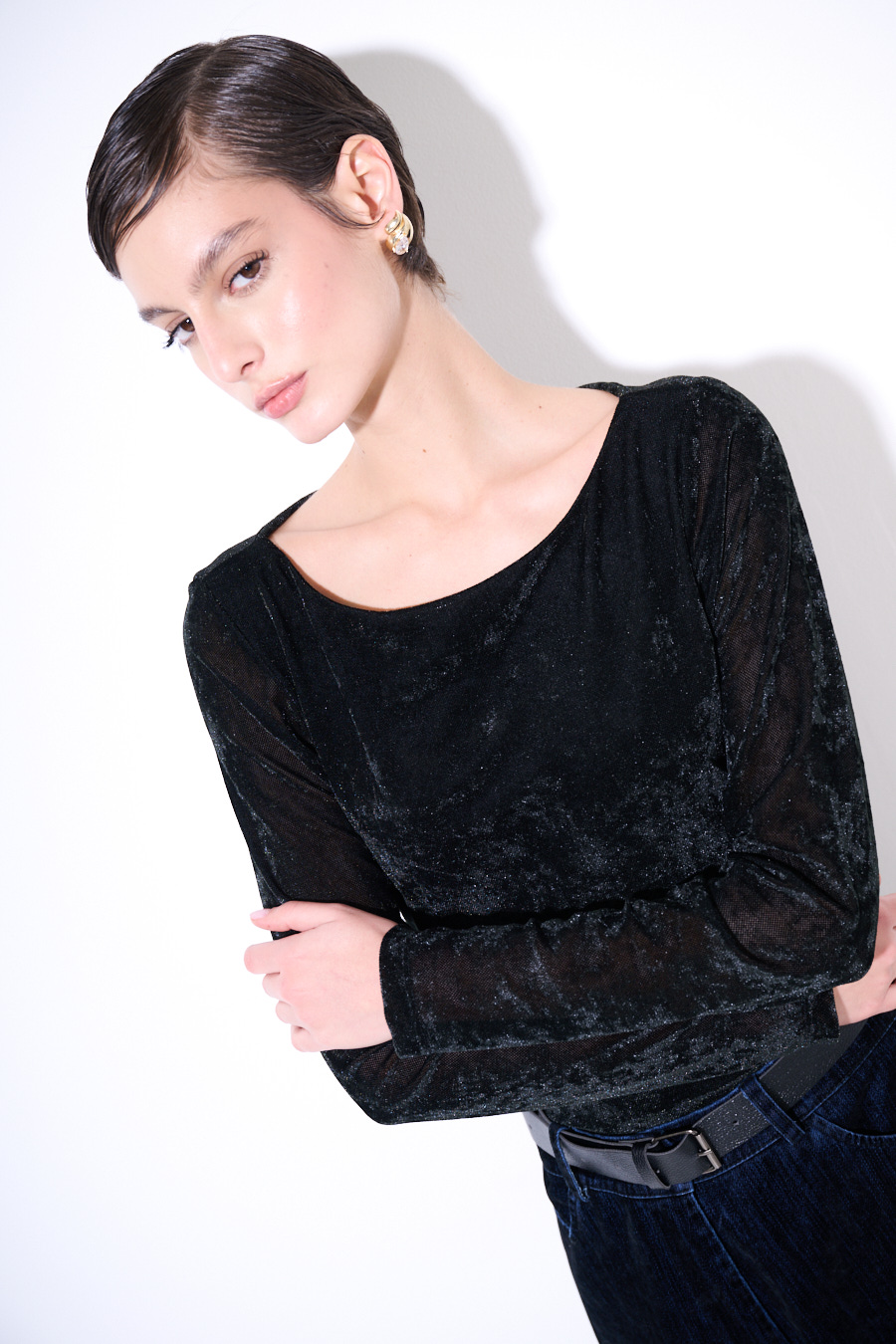 Casacca floccata in ciniglia con manica semitrasparente e con scollo a barca, interno foderato.
