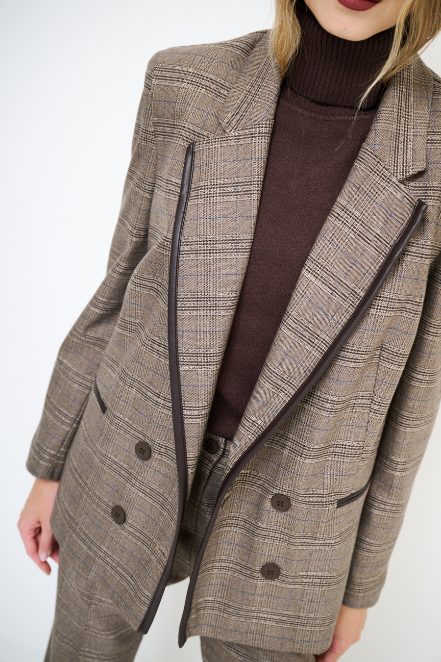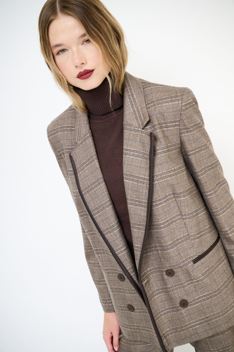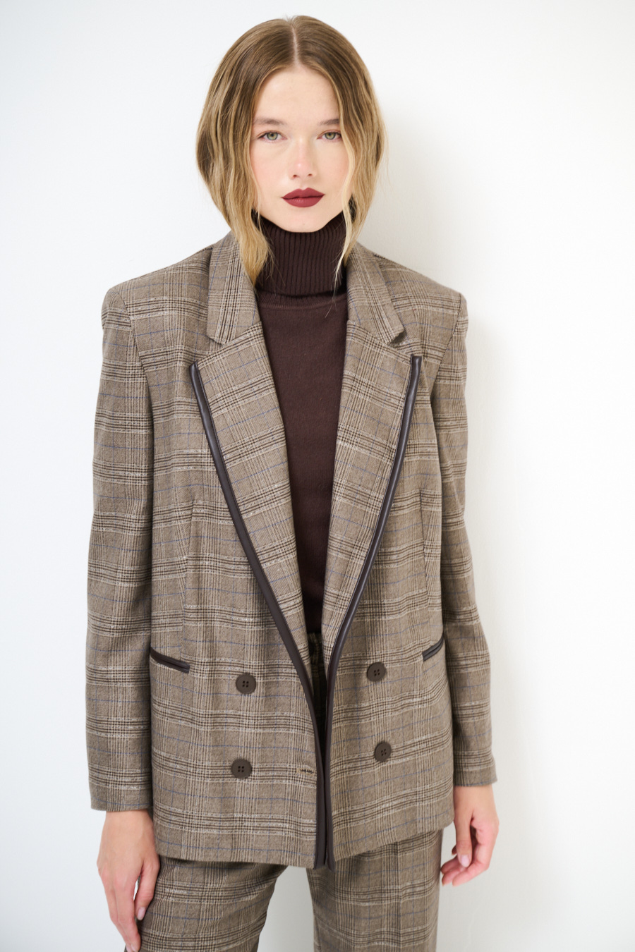 Giacca a quadri con abbottonatura a doppio petto, inserto in ecopelle sul profilo del collo rever e taschine a filetto, foderata internamente e con spalline imbottite.