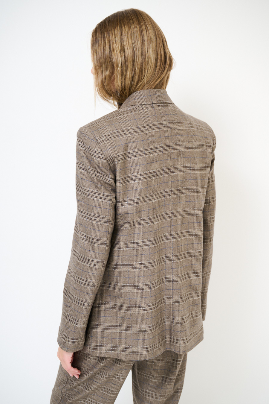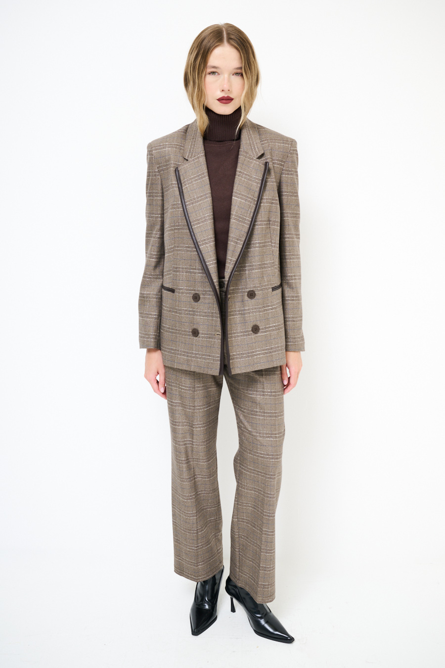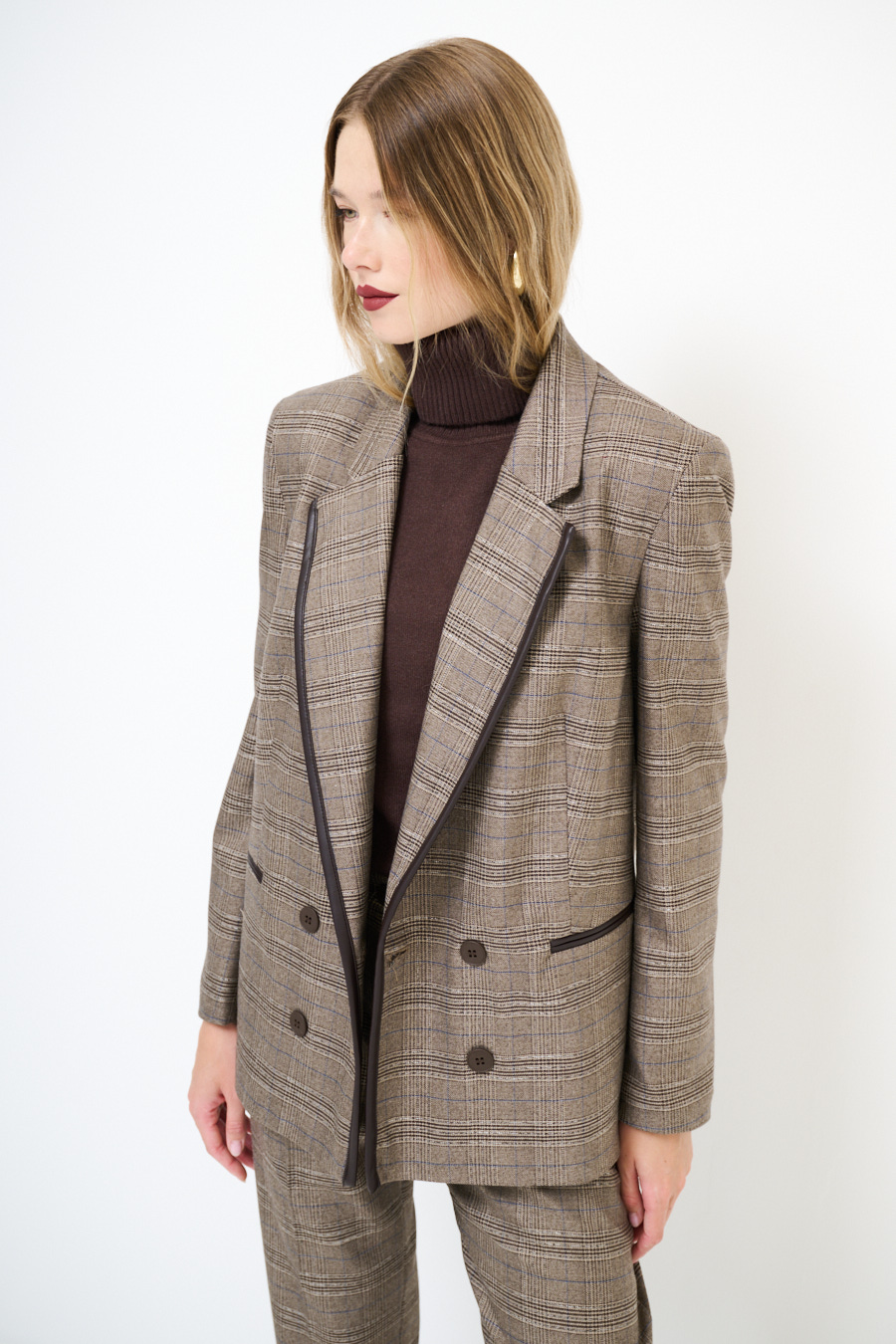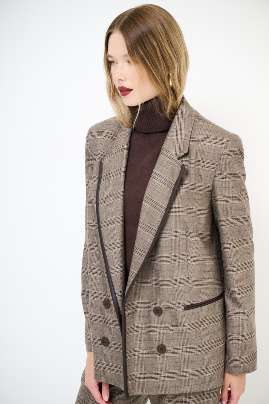 Giacca a quadri con abbottonatura a doppio petto, inserto in ecopelle sul profilo del collo rever e taschine a filetto, foderata internamente e con spalline imbottite.