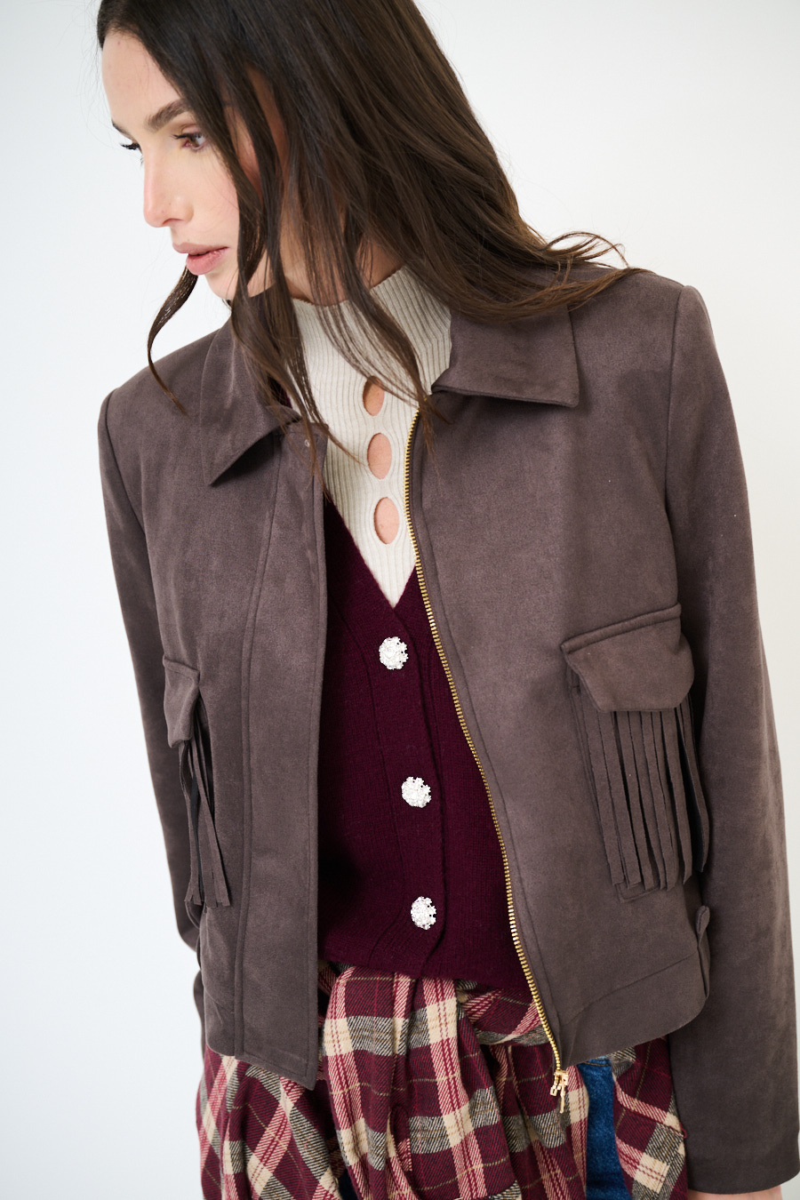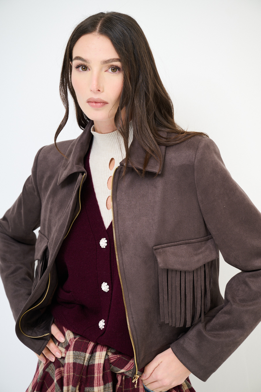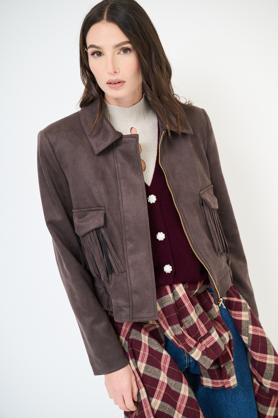 Giacca corta in dainetto con chiusura con zip coperta da patta, tasconi frontali con frange e colletto.