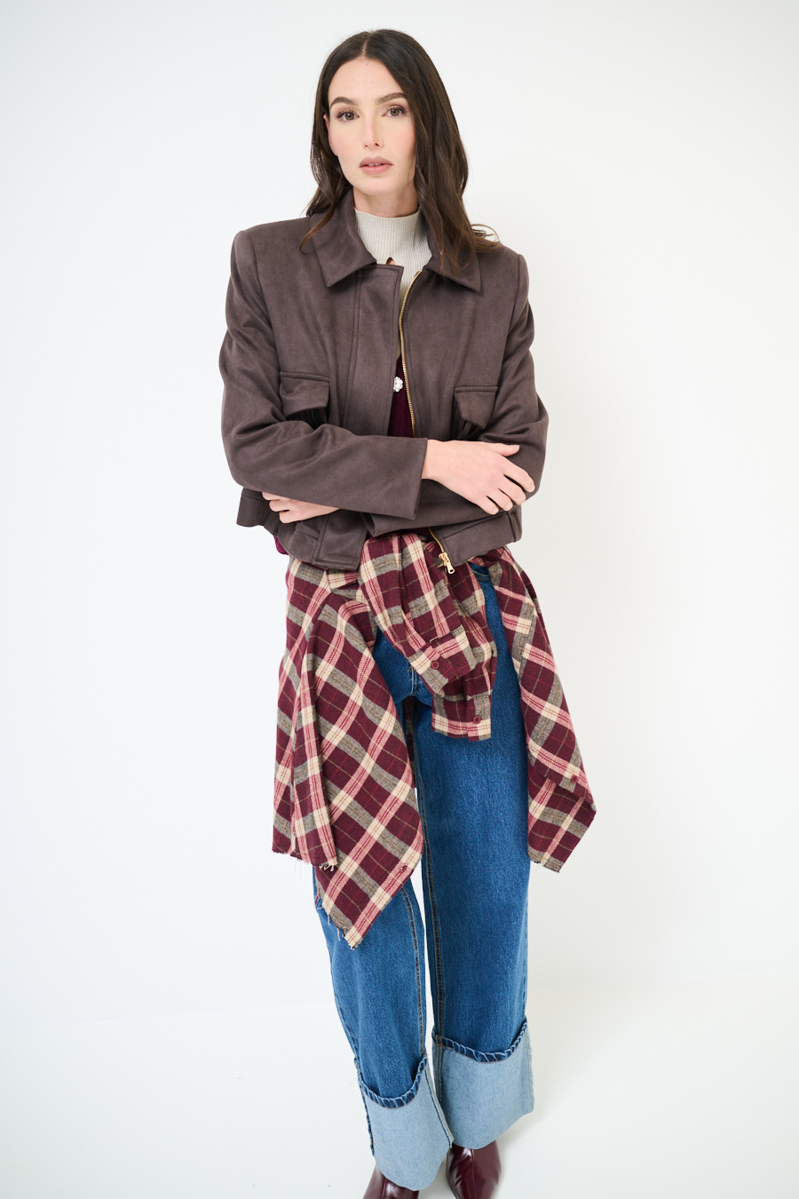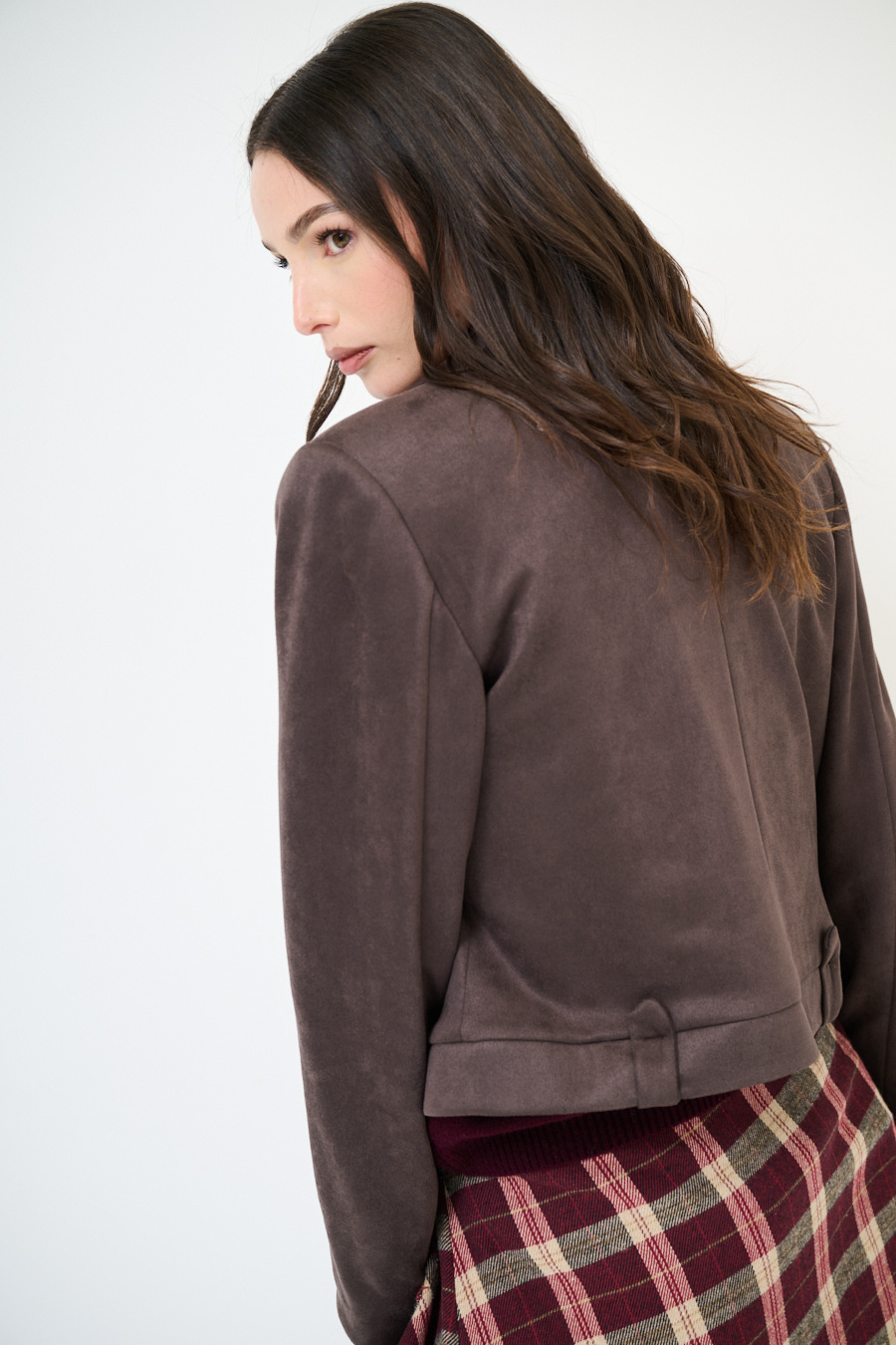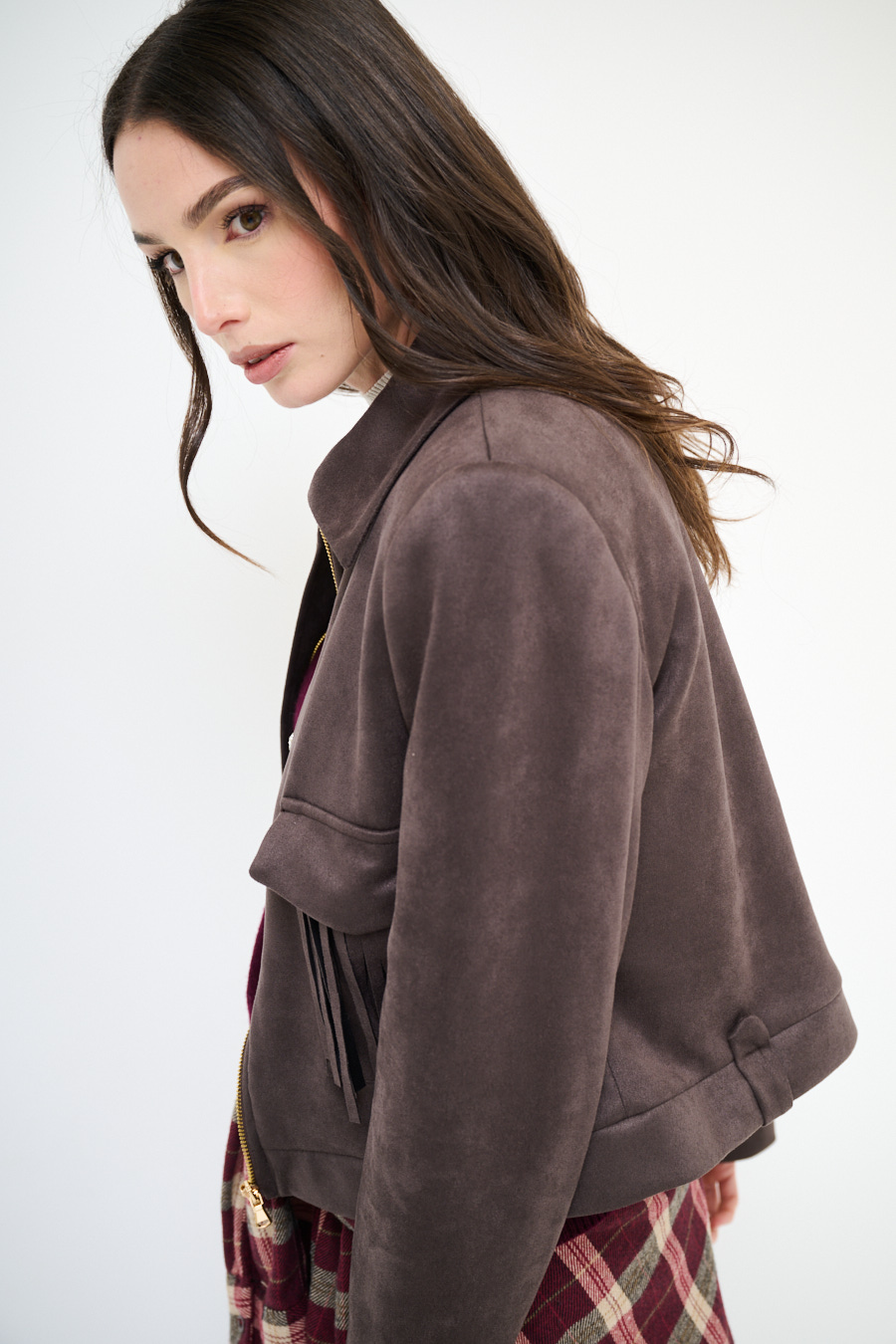 Giacca corta in dainetto con chiusura con zip coperta da patta, tasconi frontali con frange e colletto.