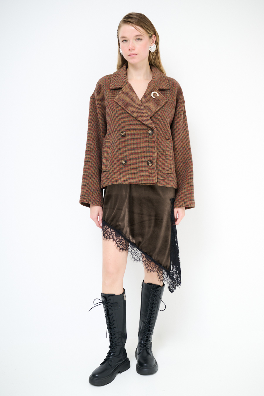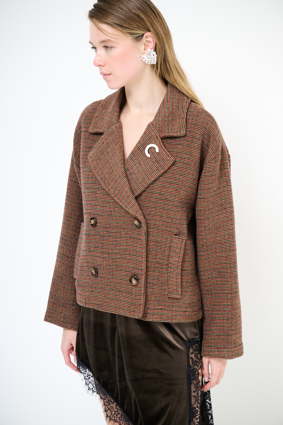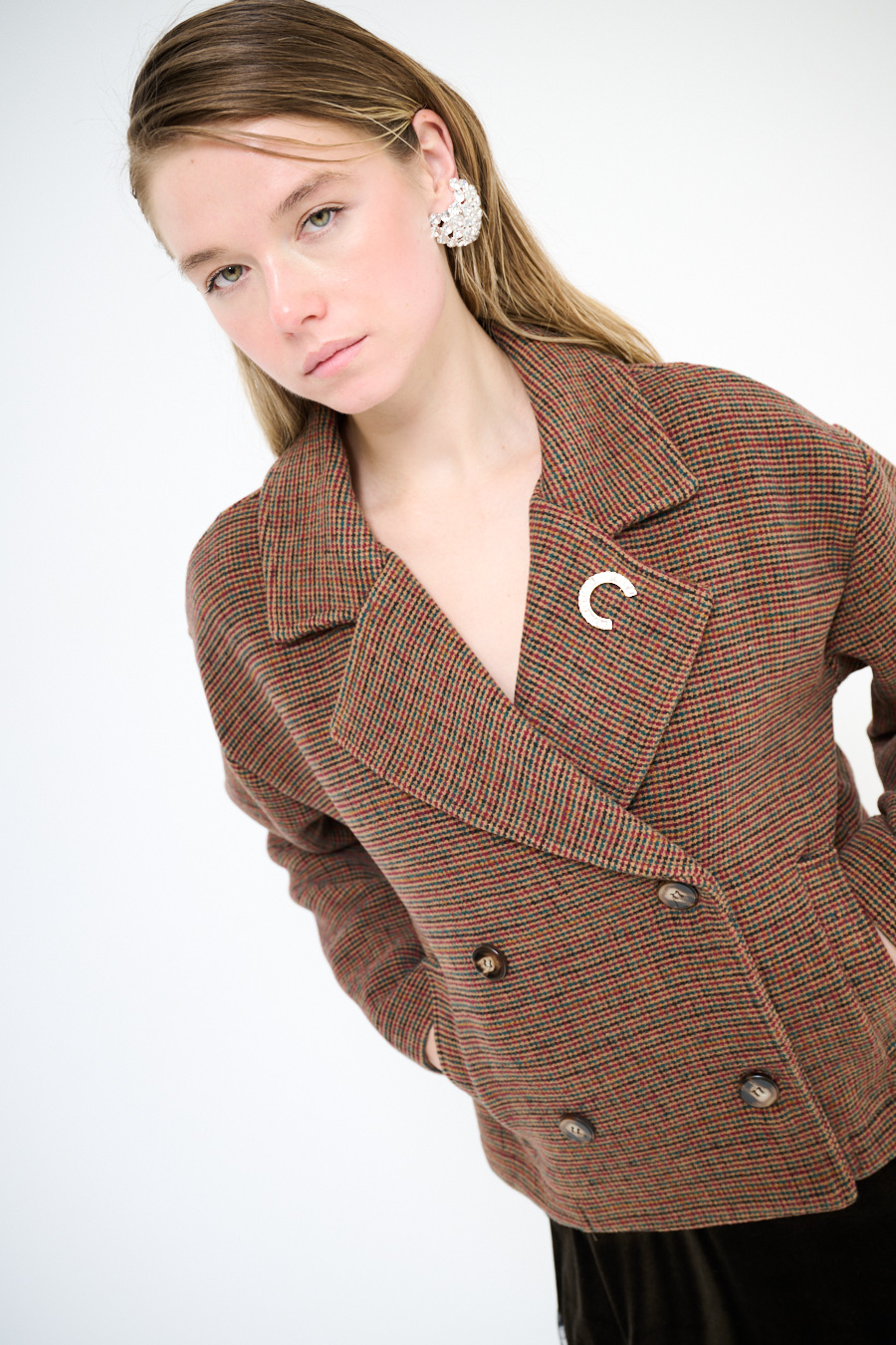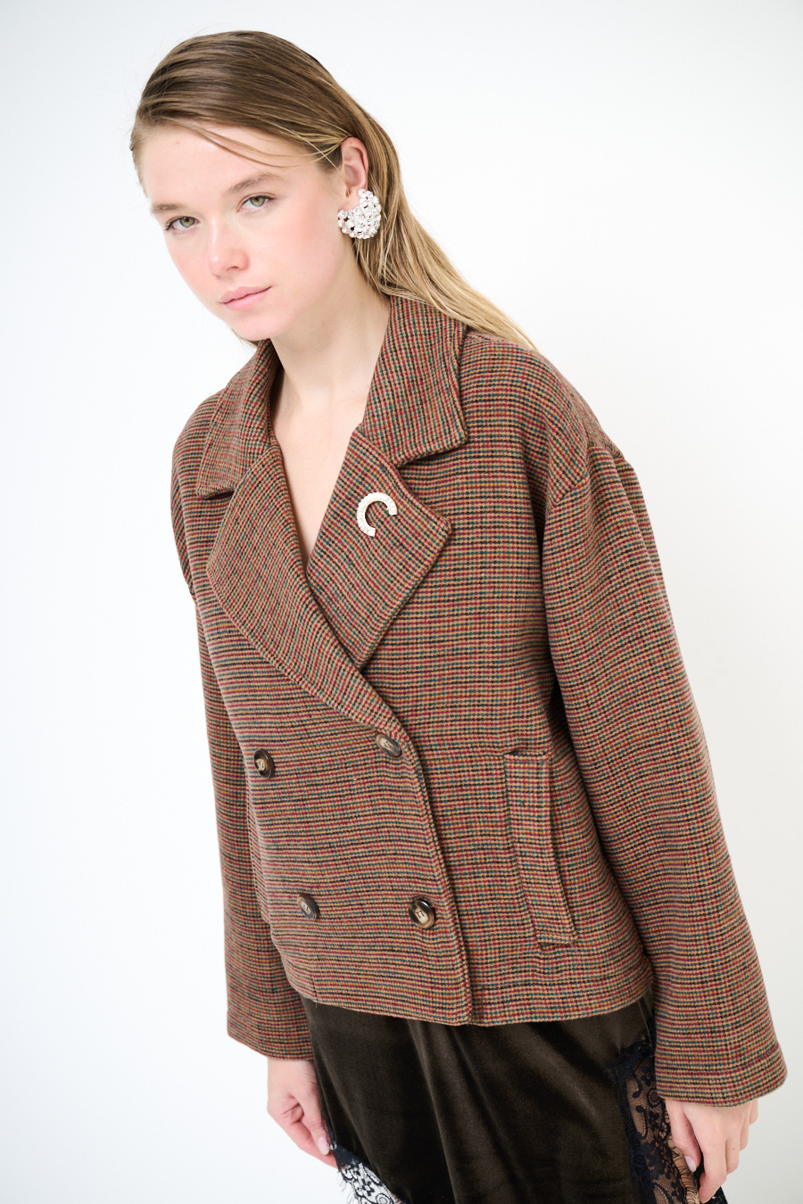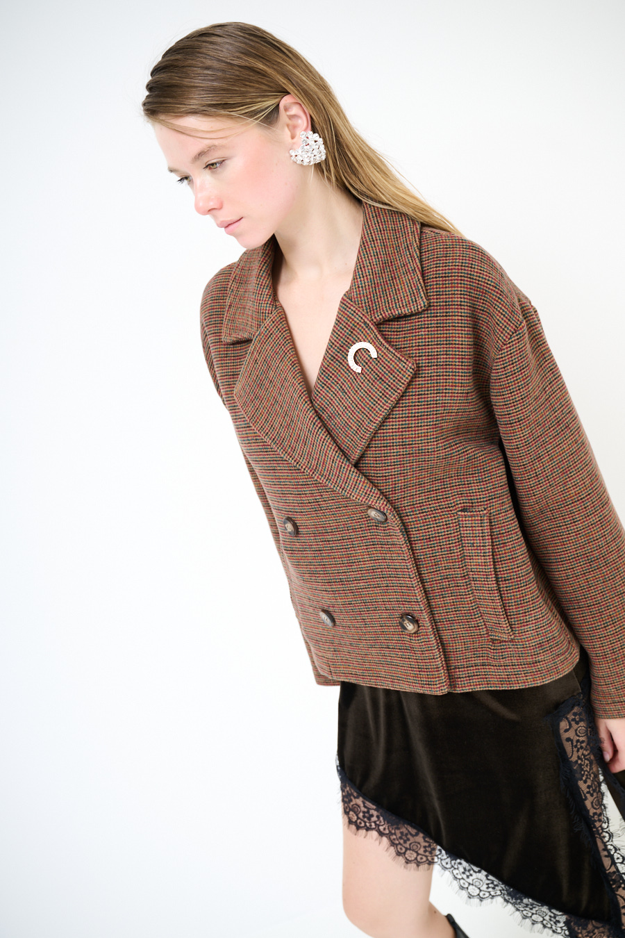 Cappottino corto a doppiopetto con disegno micro pied de poule e con spilla applicata sul collo rever.