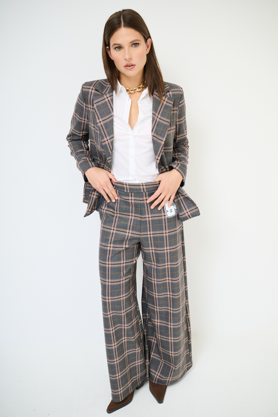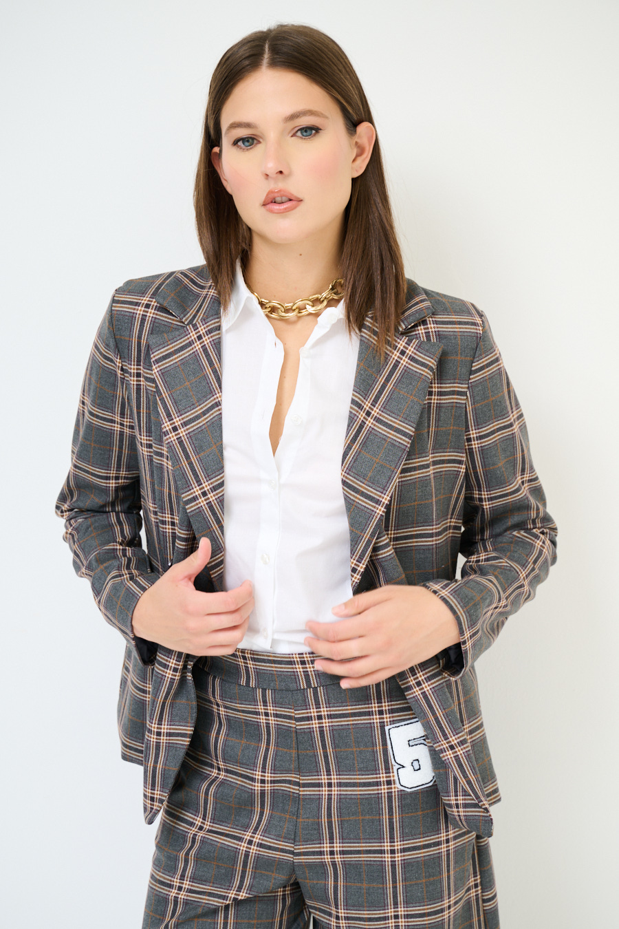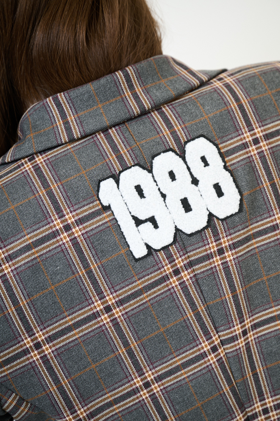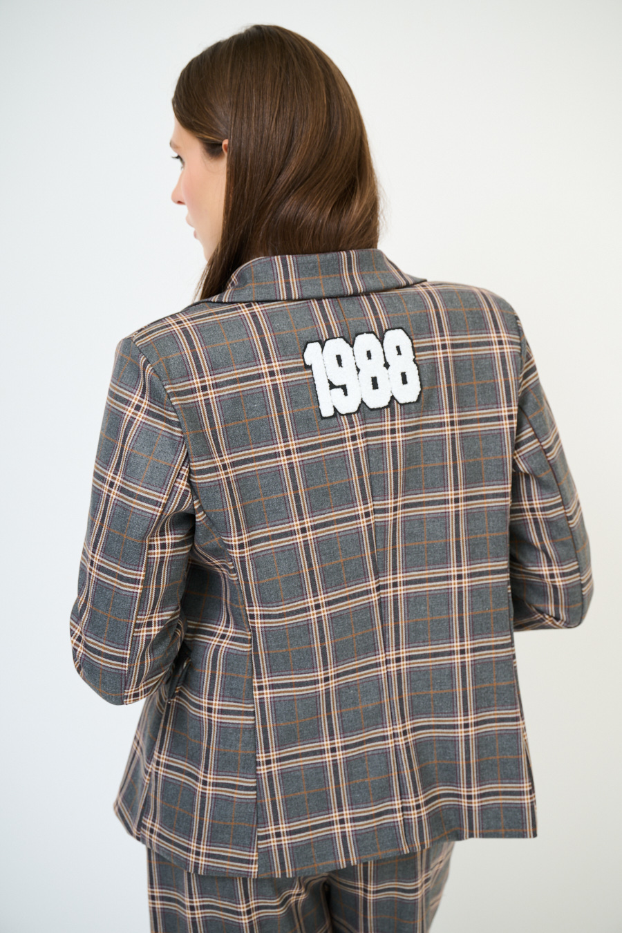 Giacca doppiopetto a quadri con spalline imbottita e patch 1988 sul retro, con fodera interna.