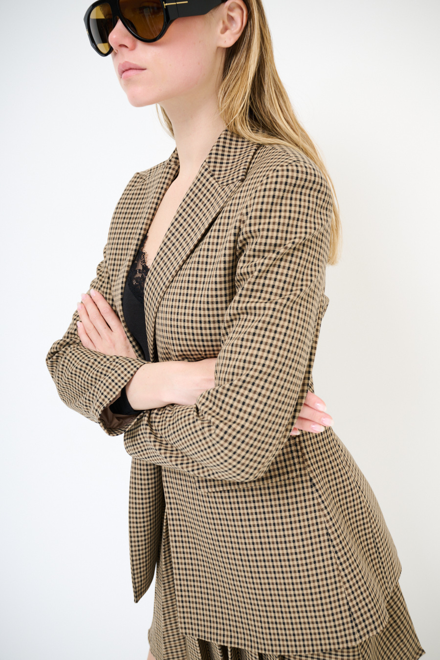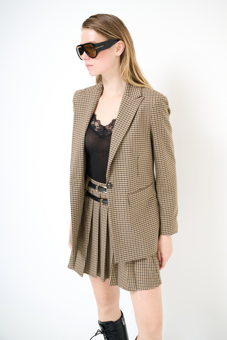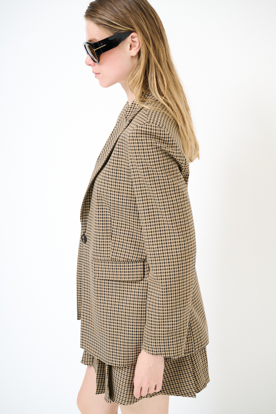 GIACCA MONOPETTO CON PATTINE MANO LANA QUADRI MORO