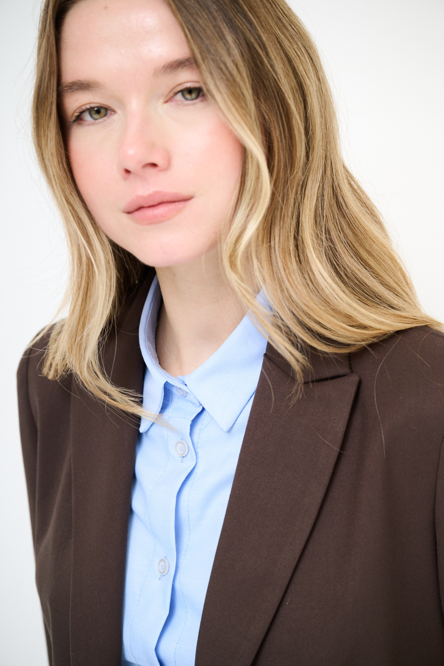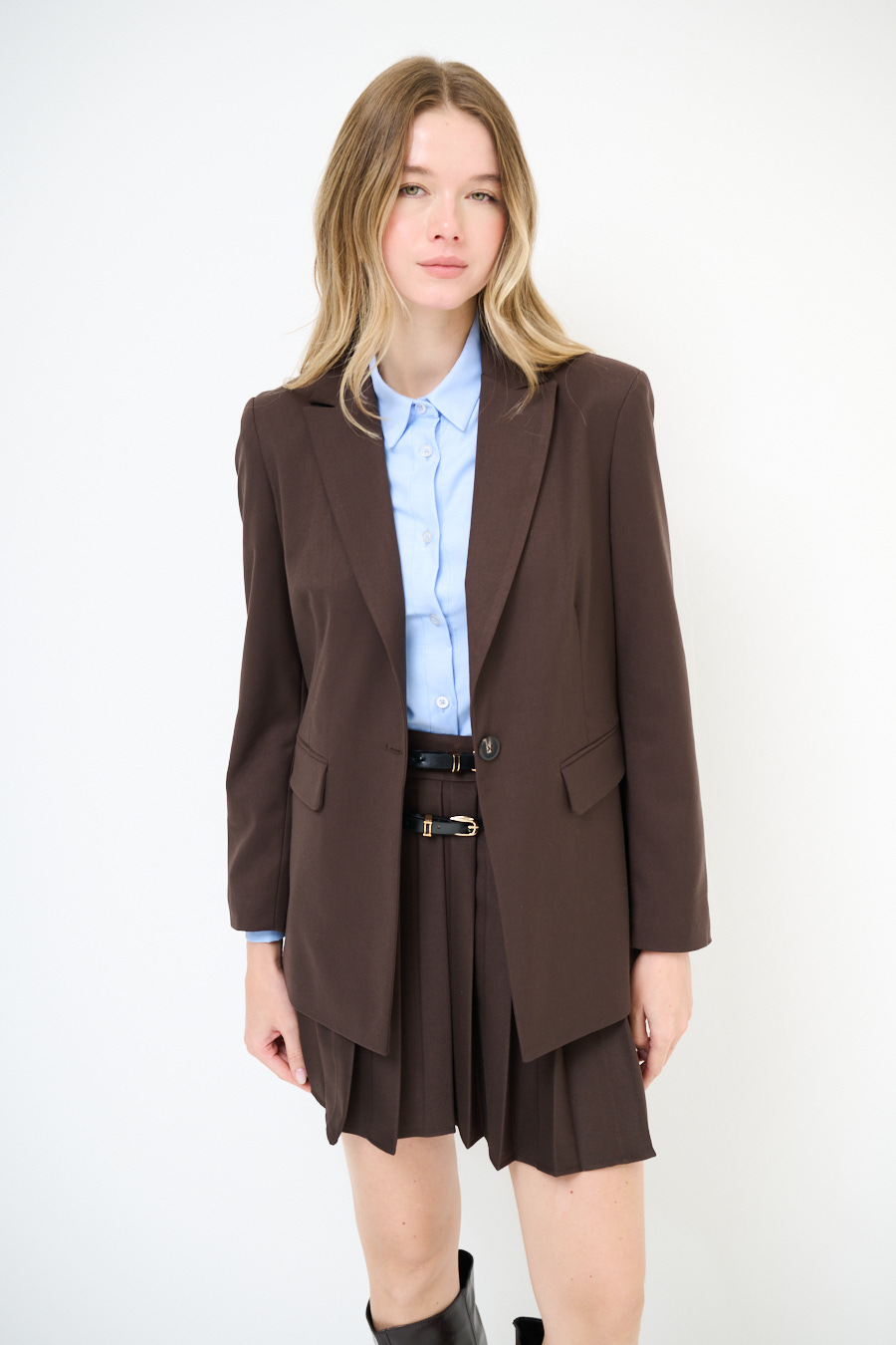 Giacca a un bottone con pattine, collo rever e spalline imbottite, foderata internamente.