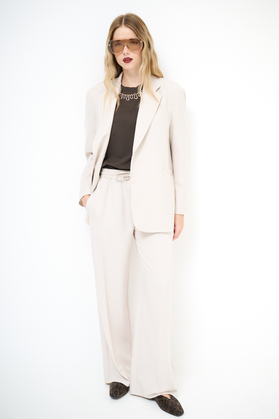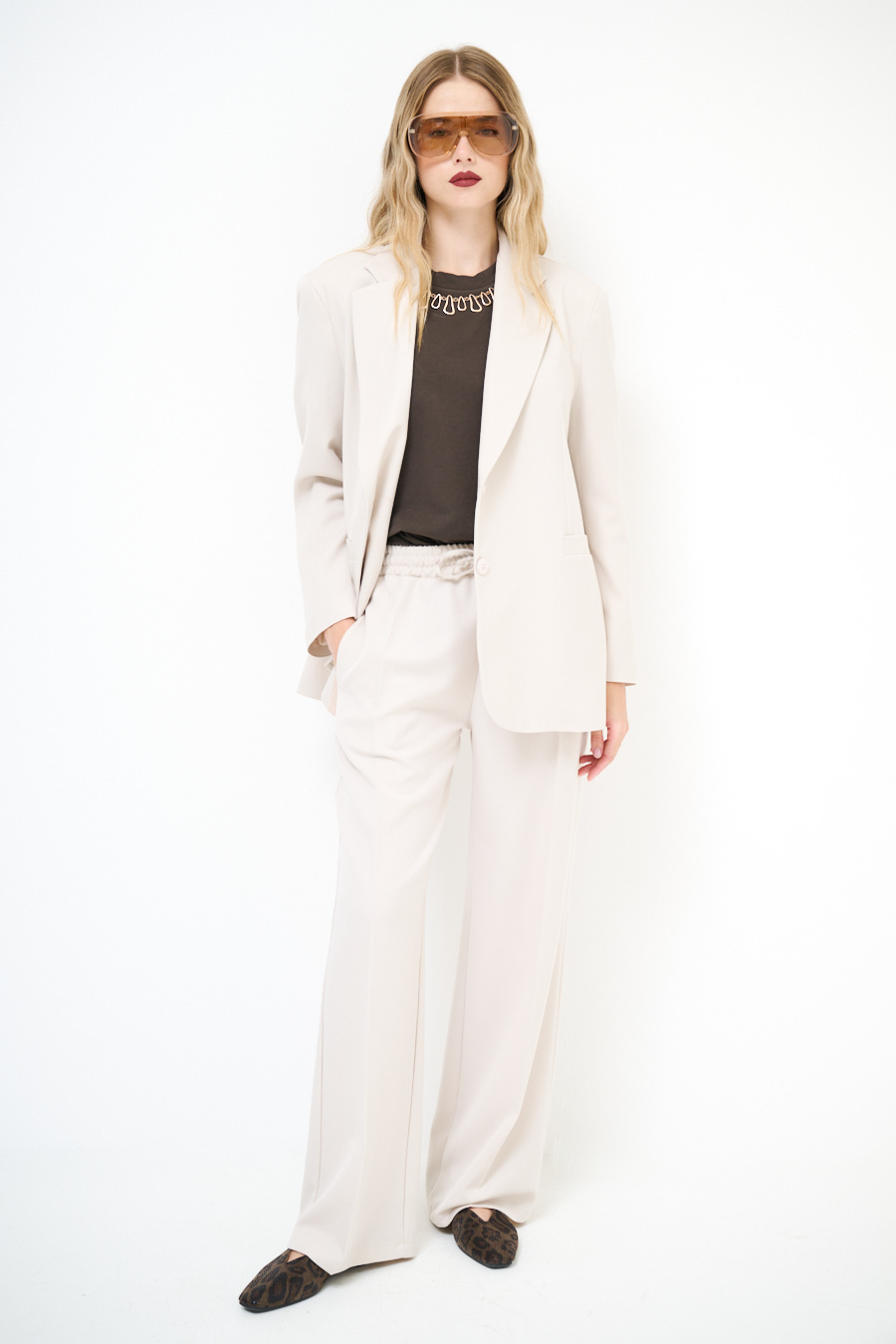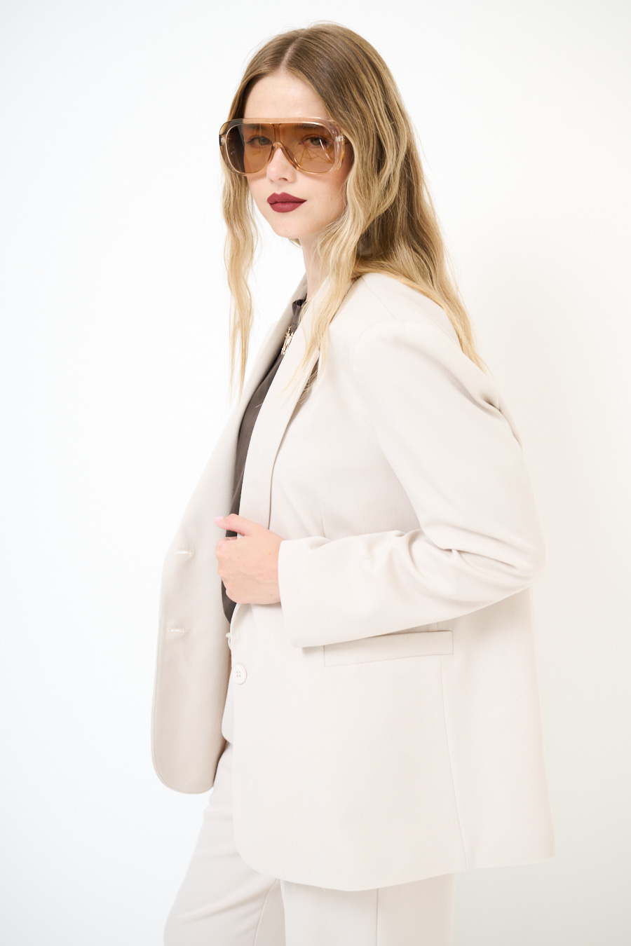 Giacca oversize a due bottoni in tinta, collo rever ampio a punta, spalline imbottite e foderata internamente.