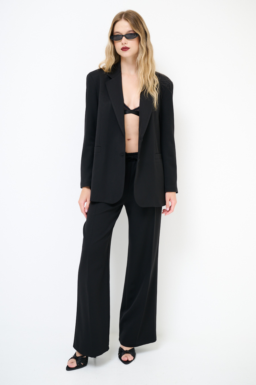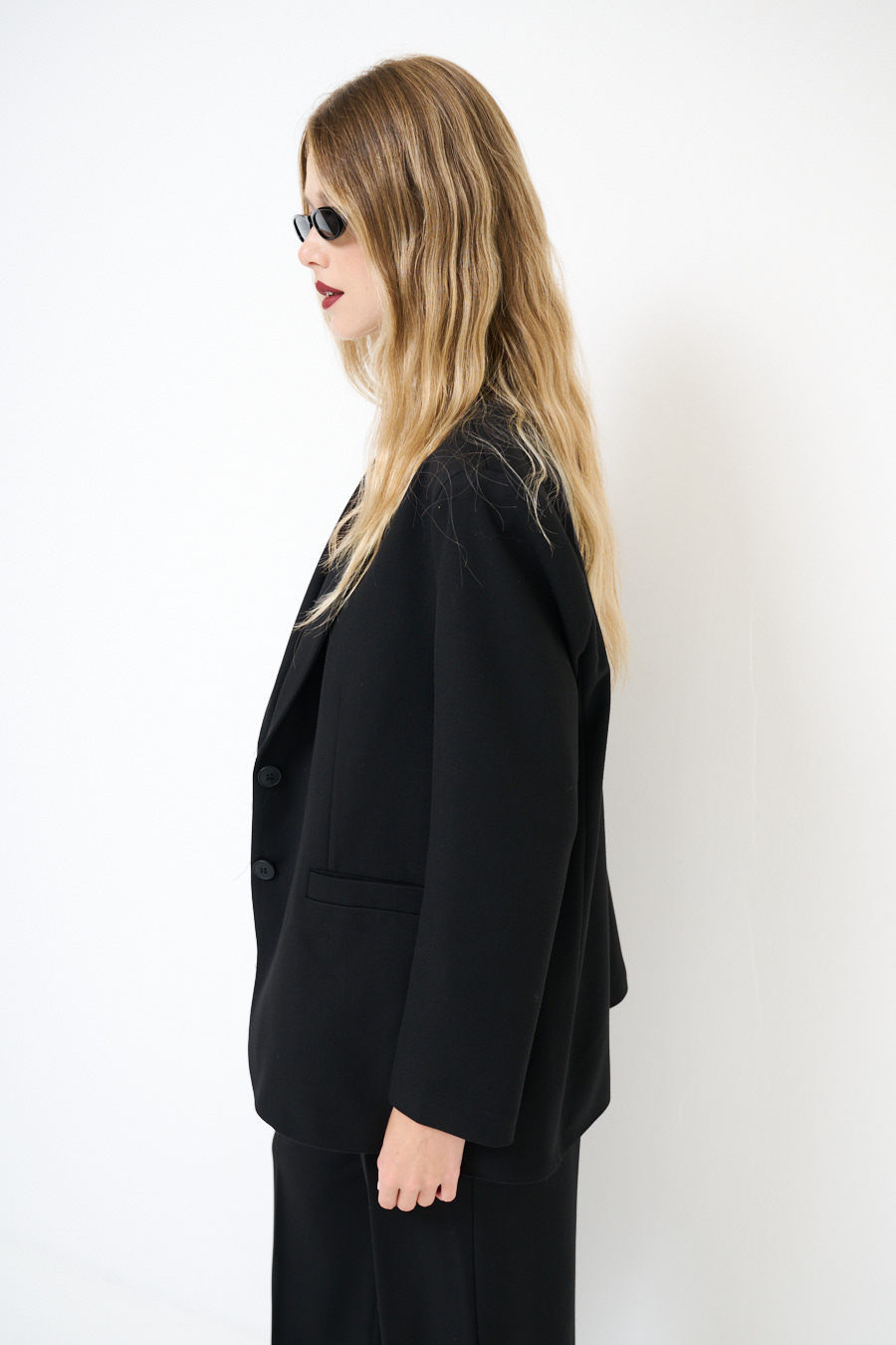 Giacca oversize a due bottoni in tinta, collo rever ampio a punta, spalline imbottite e foderata internamente.
