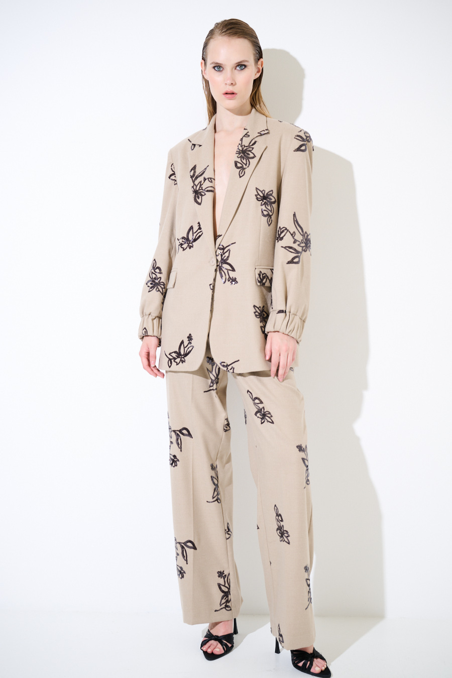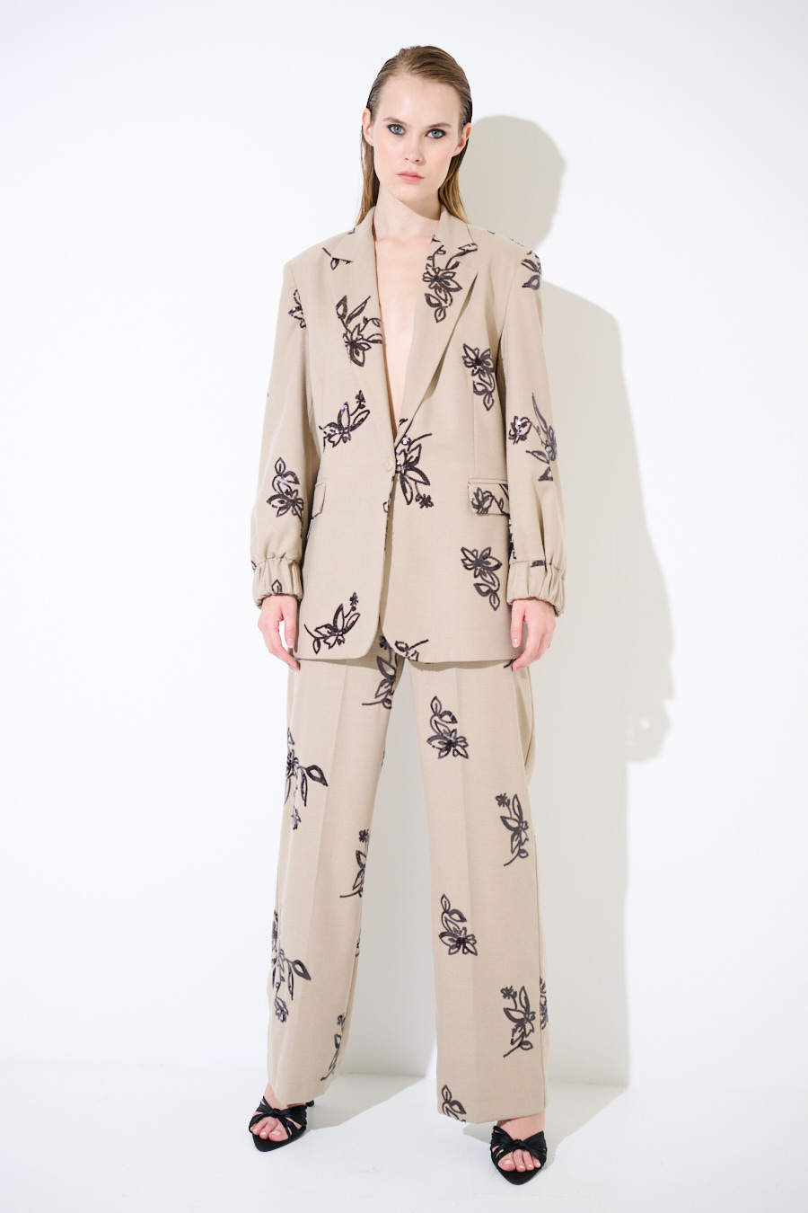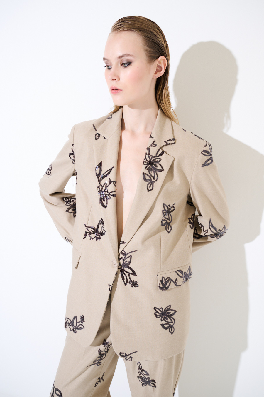 Giacca oversize con ricamo in paillettes floreale, con ampio collo rever, spallina leggermente imbottita, fondo manica con elastico, foderata internamente e chiusura a un bottone.