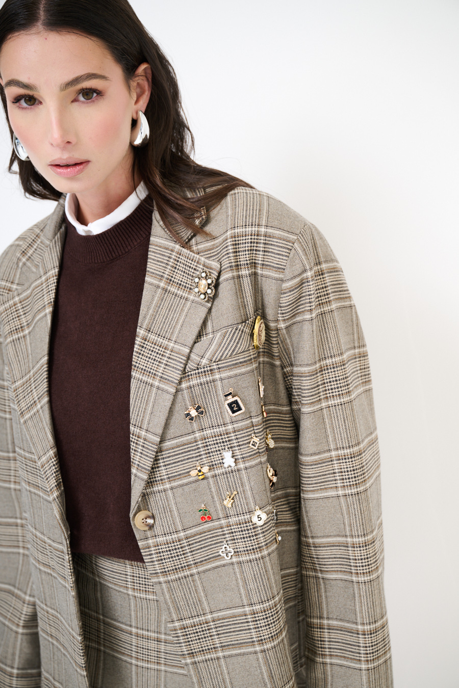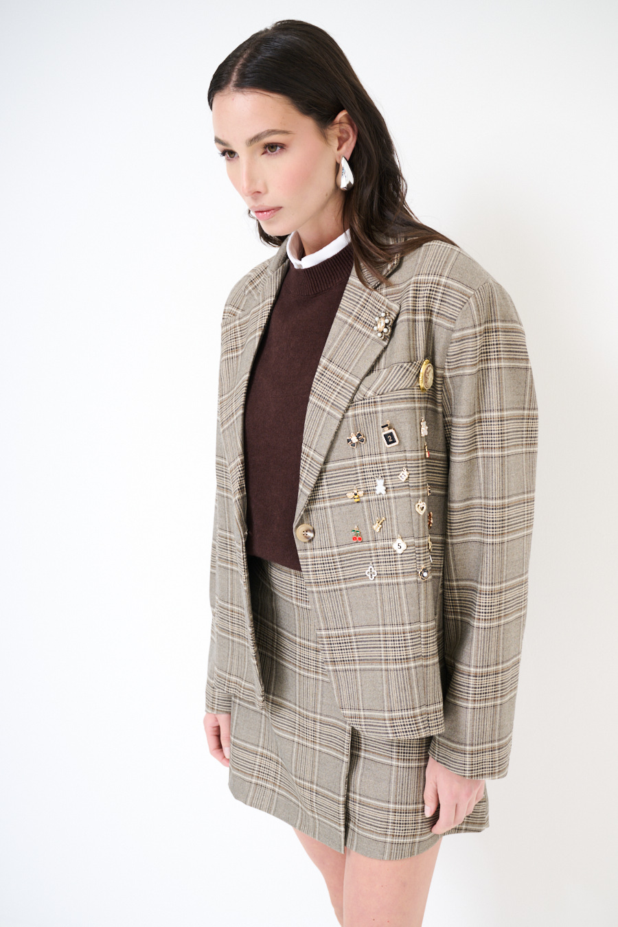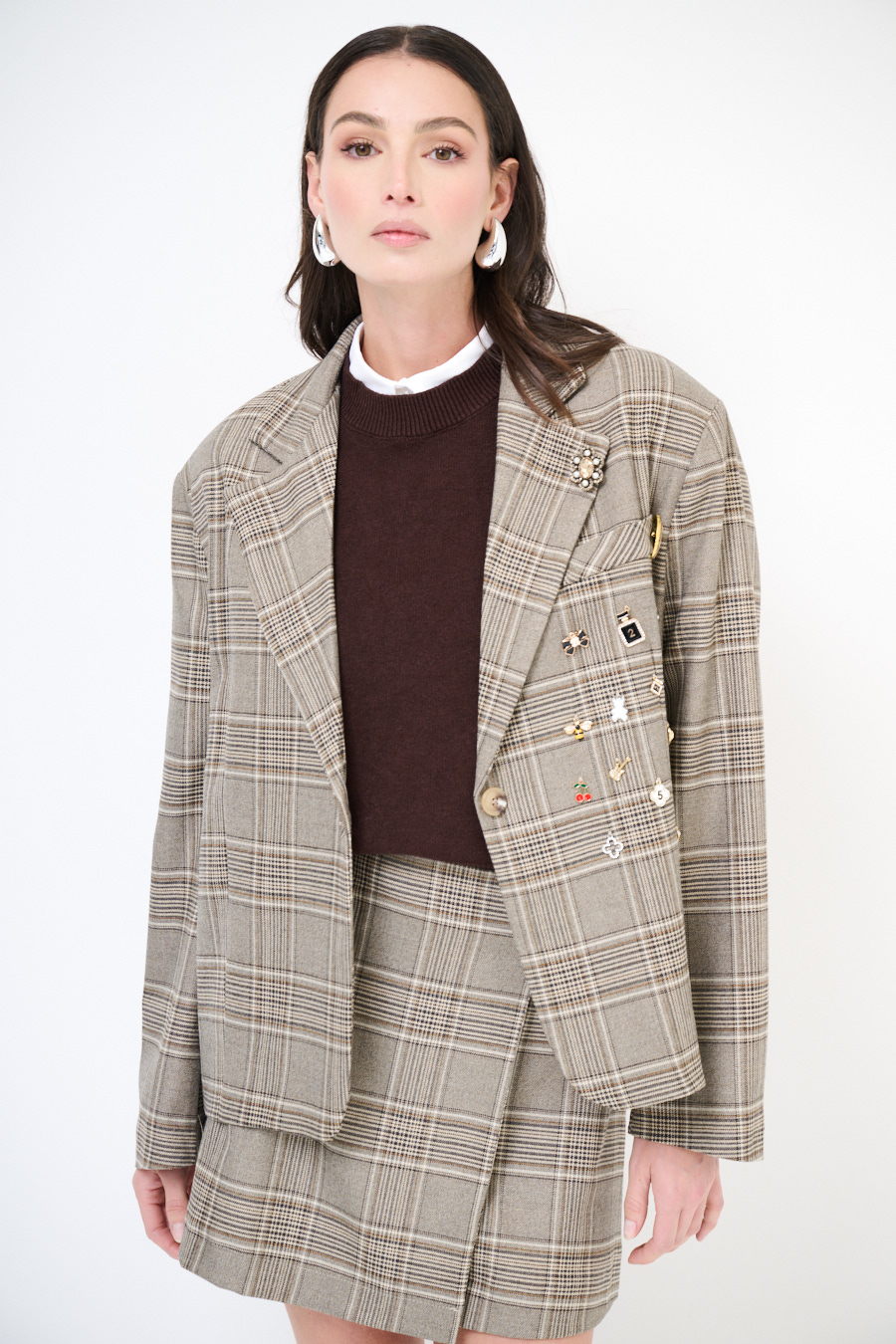 Giacca oversize scozzese a un bottone con finto taschino frontale e mix spille sul fronte, foderata internamente.