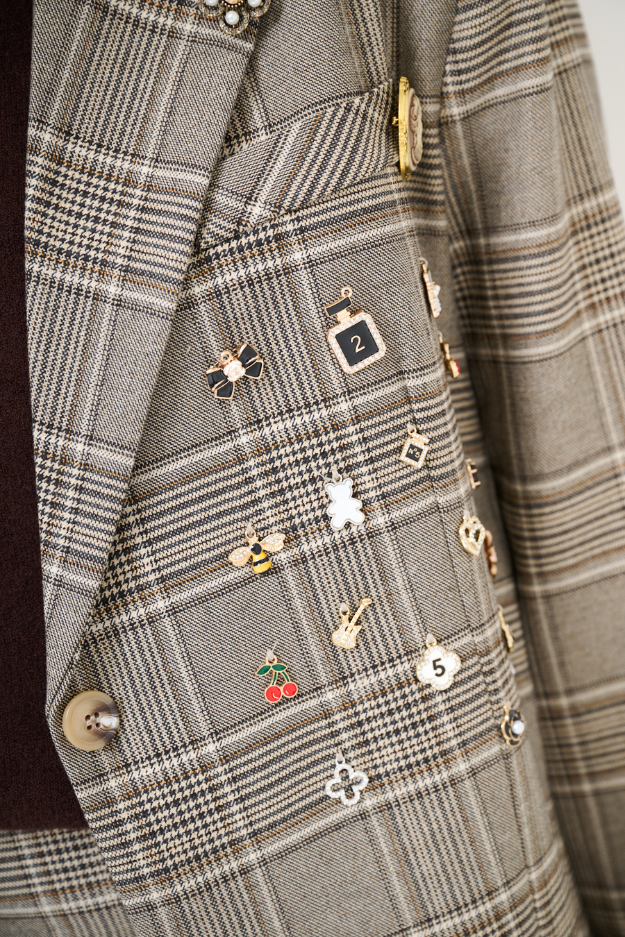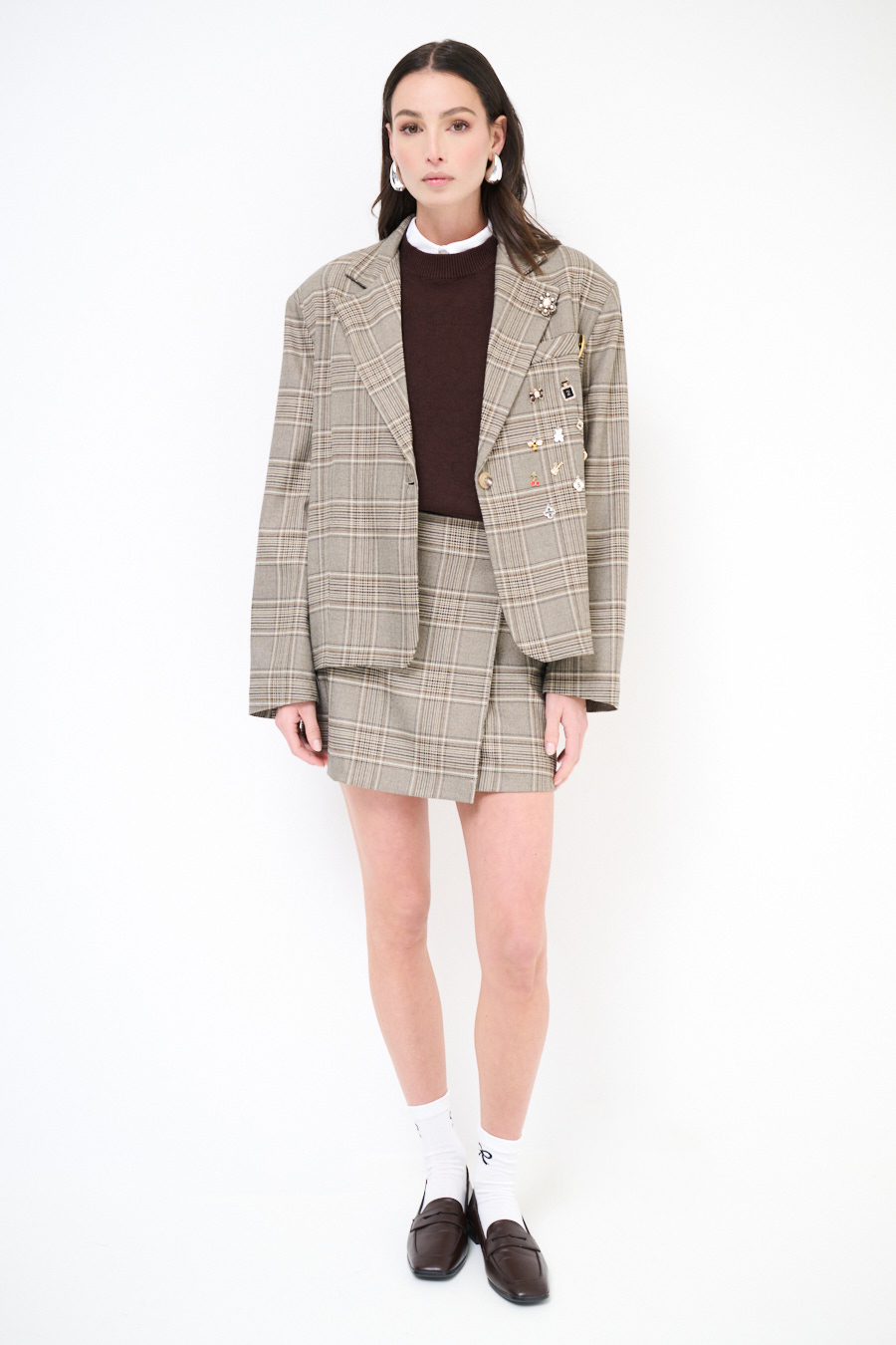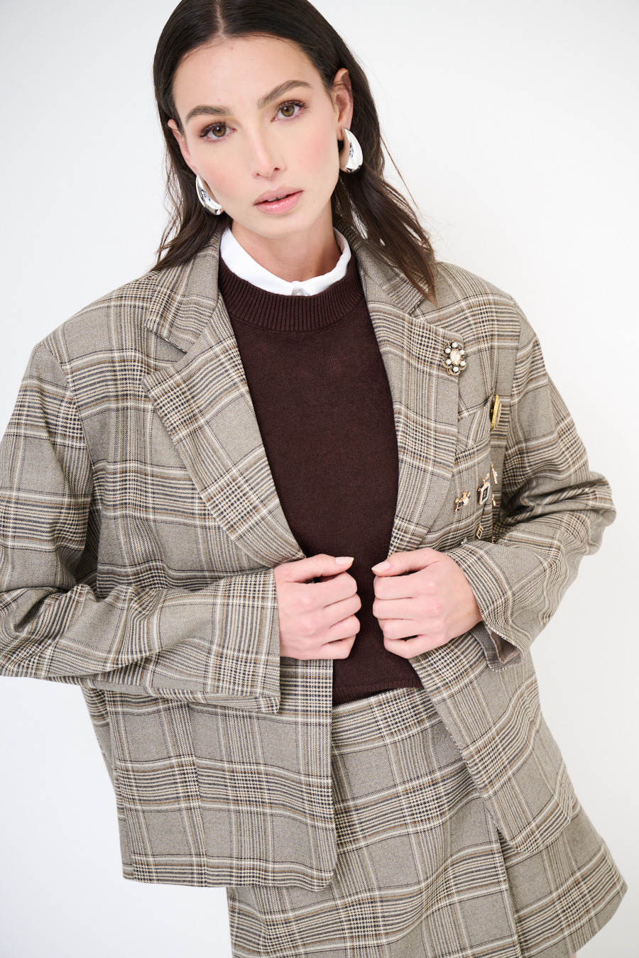 Giacca oversize scozzese a un bottone con finto taschino frontale e mix spille sul fronte, foderata internamente.