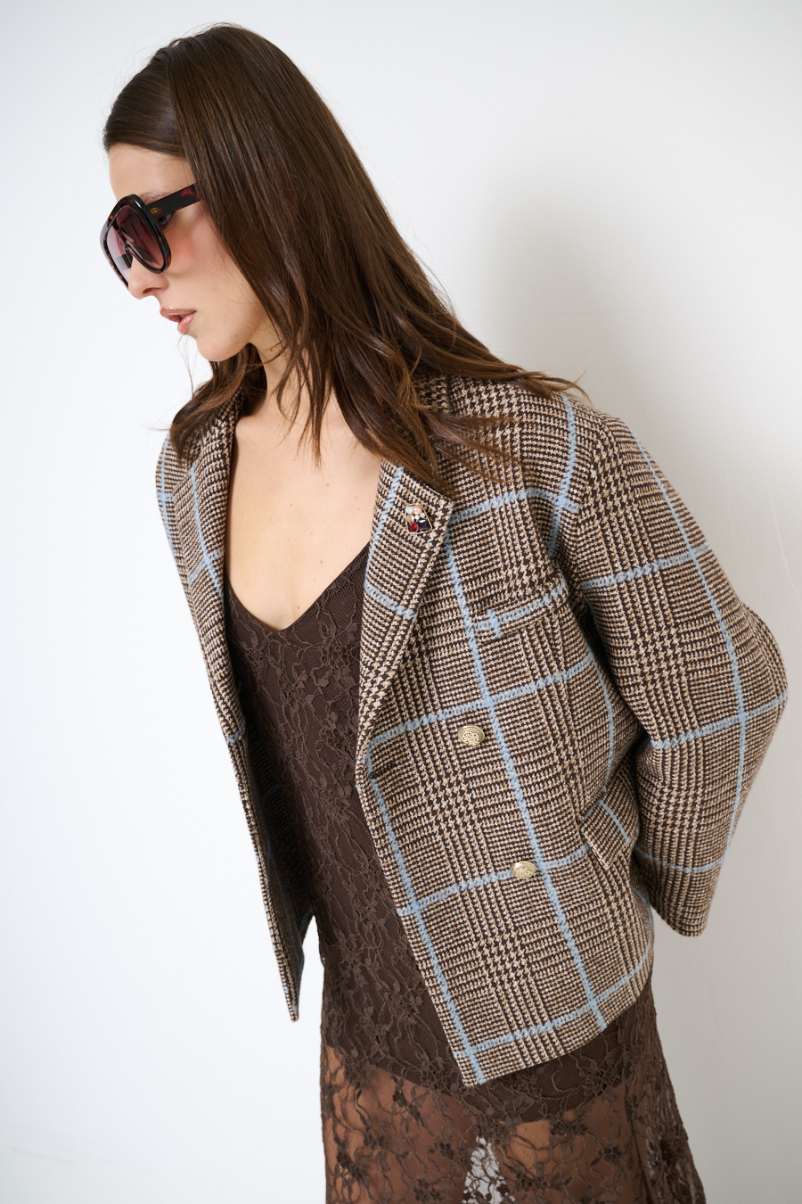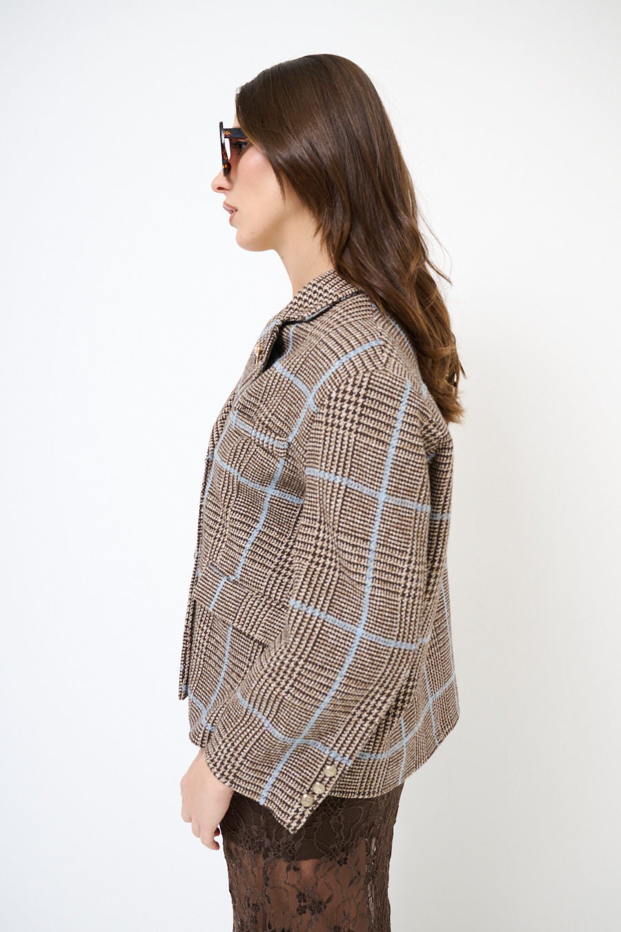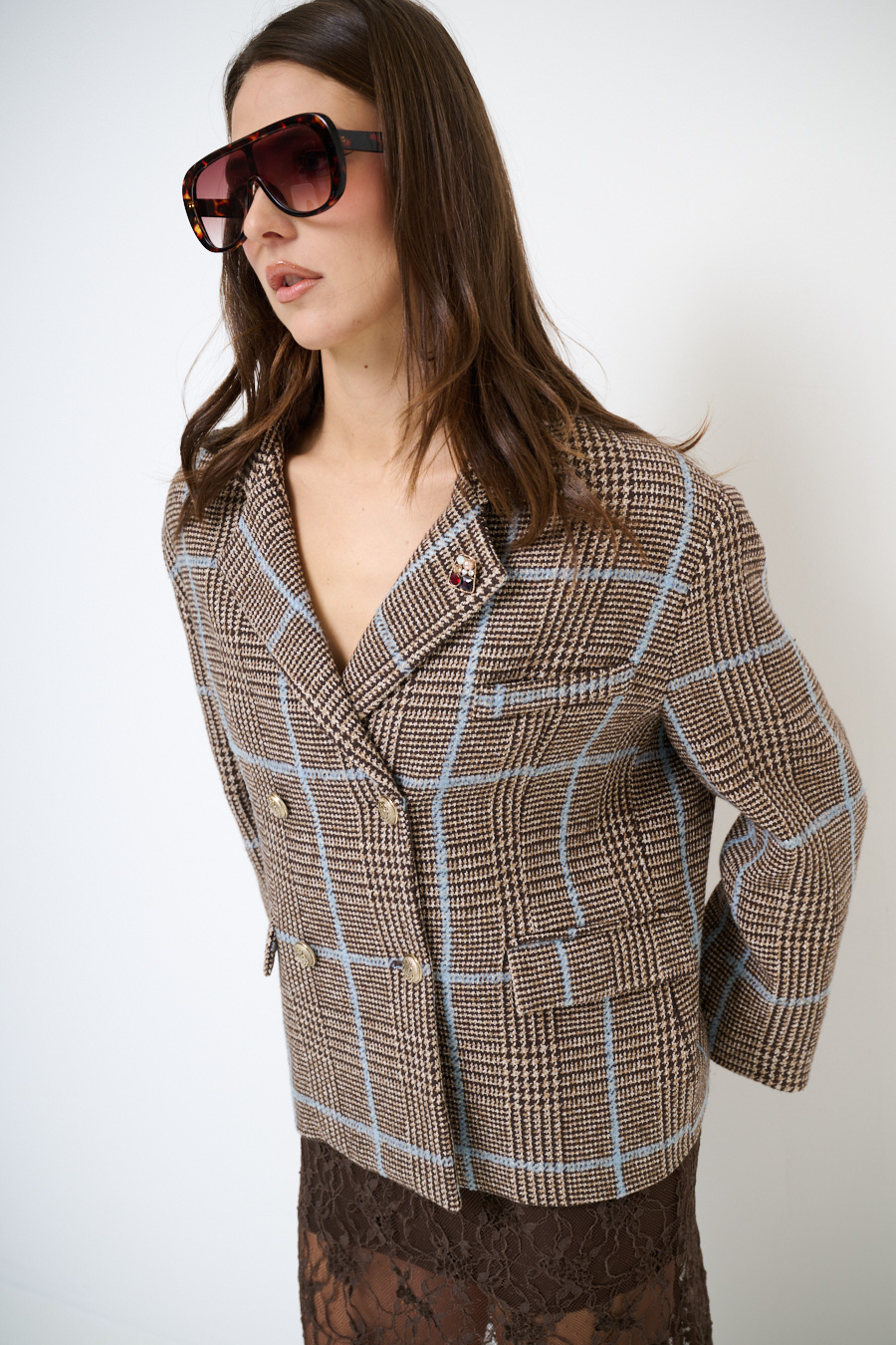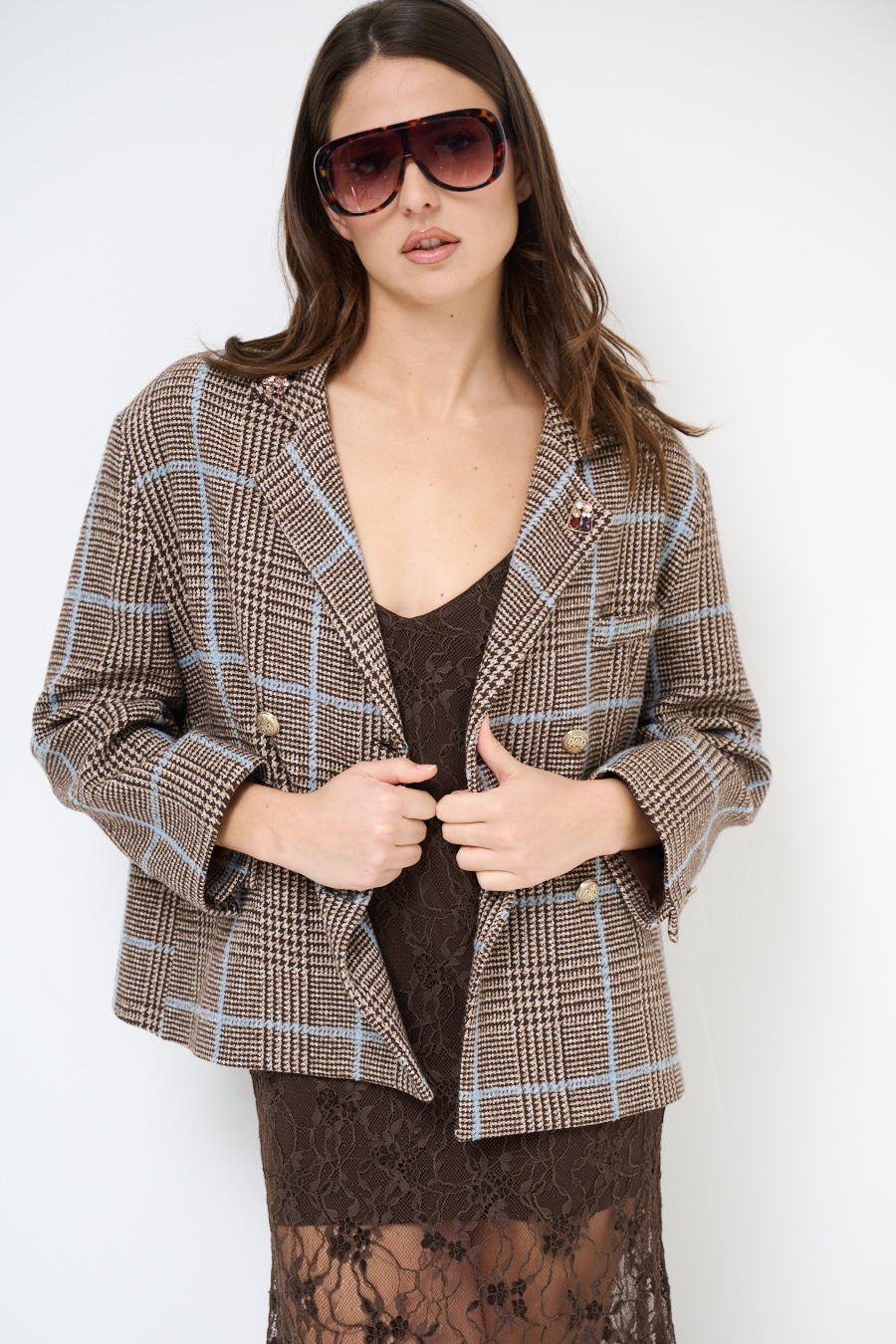 Giacca a quadri oversize con abbottonatura a doppio petto, con pattine, con spilla sul collo rever e foderata internamente.