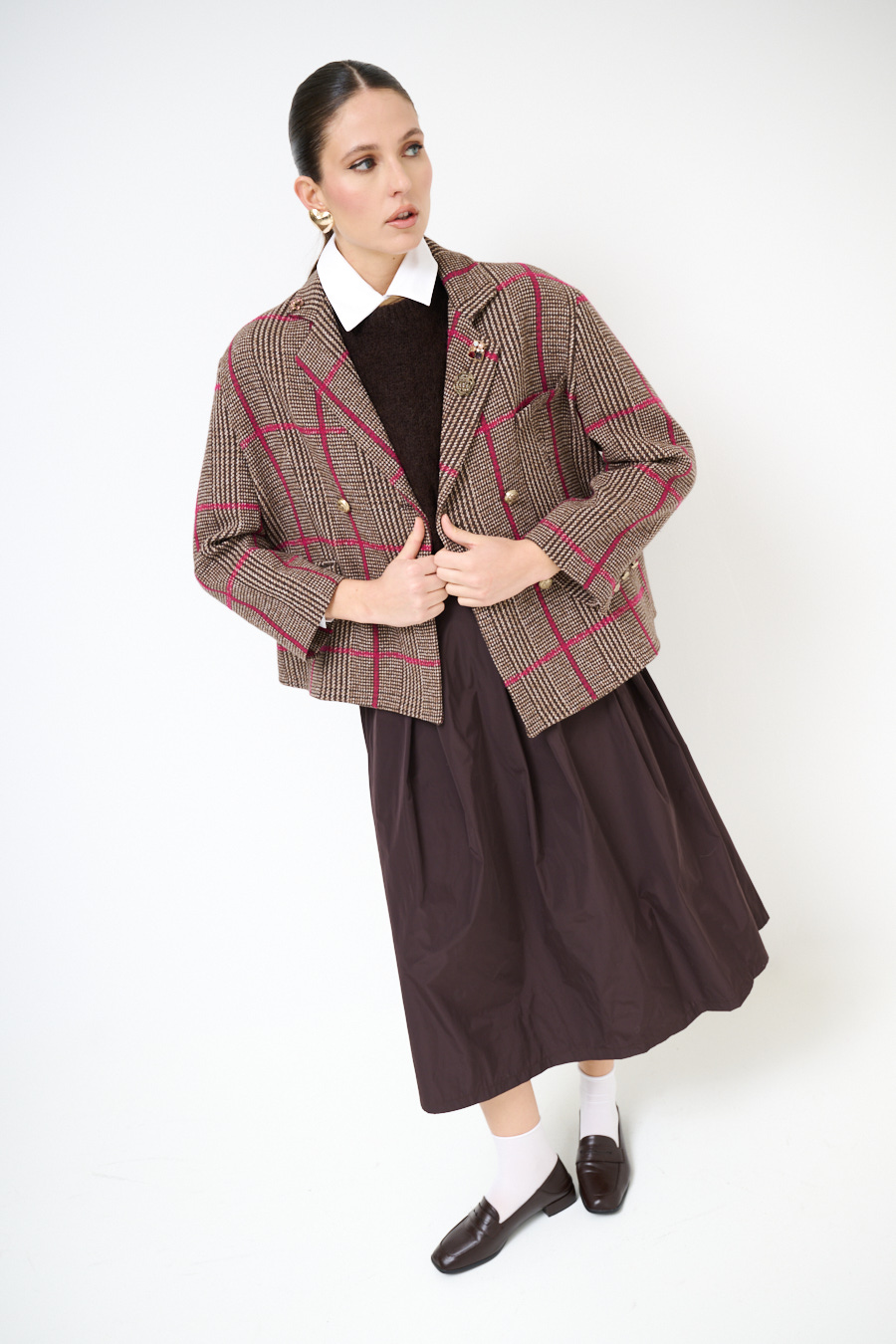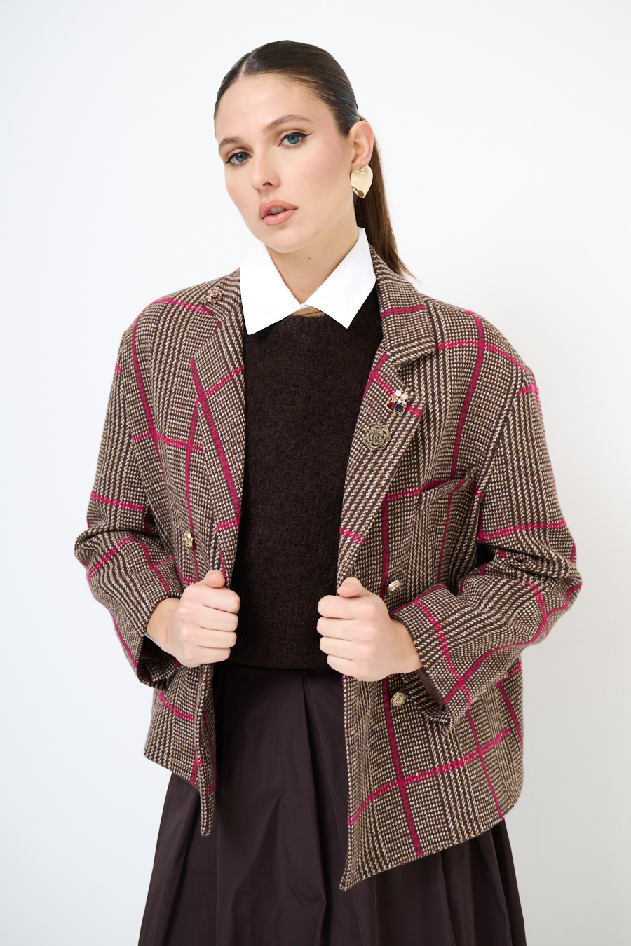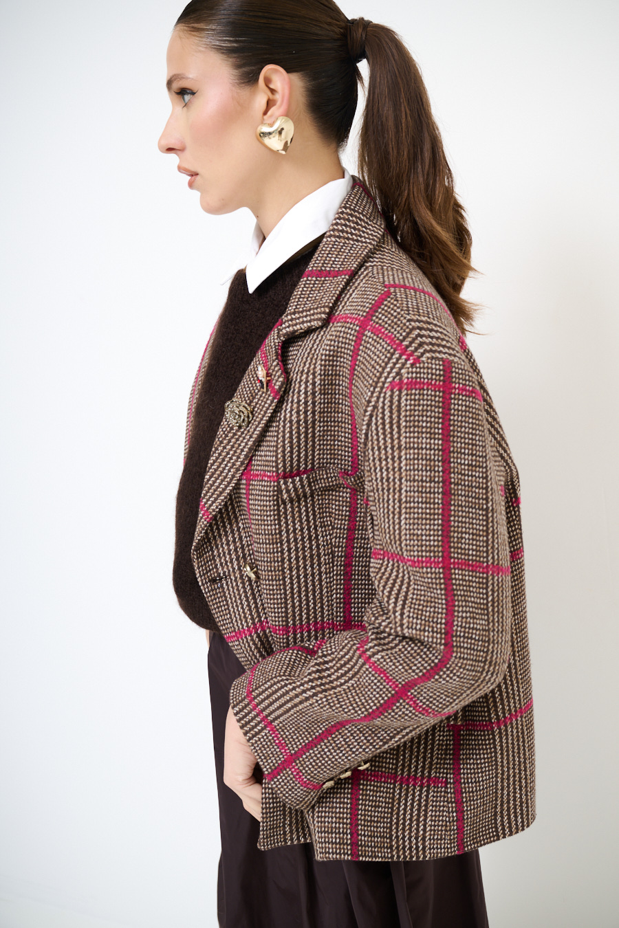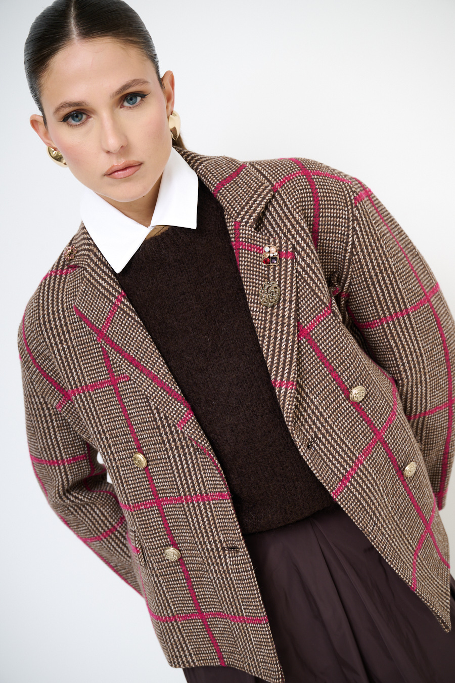 Giacca a quadri oversize con abbottonatura a doppio petto, con pattine, con spilla sul collo rever e foderata internamente.