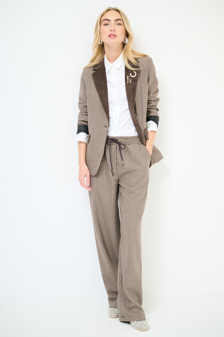 Giacca slim con pied de poule piccolo, con profilo colletto rever, taschini in velluto a coste, chiusura a un bottone e con fodera interna.