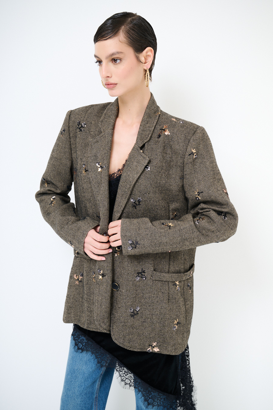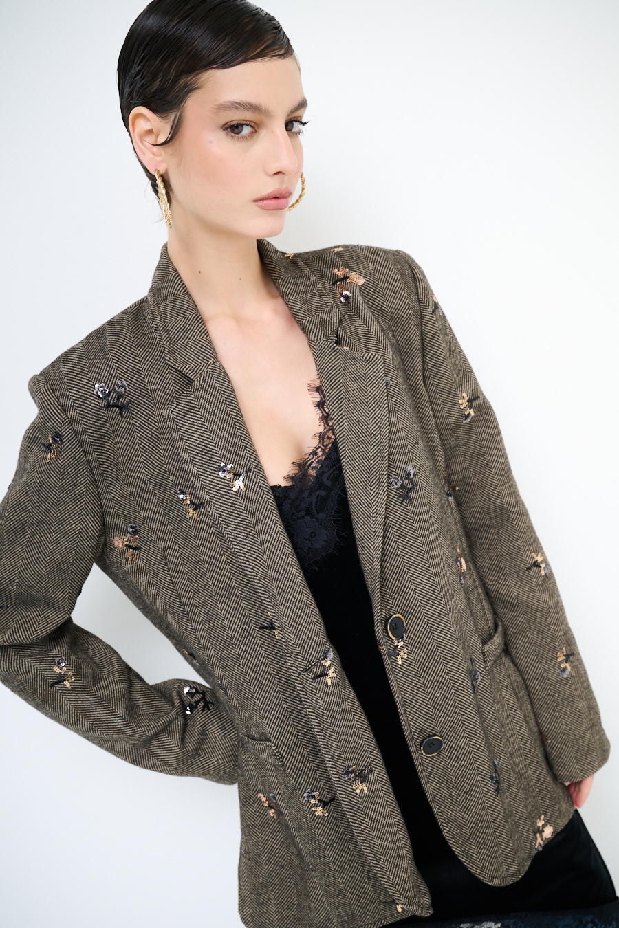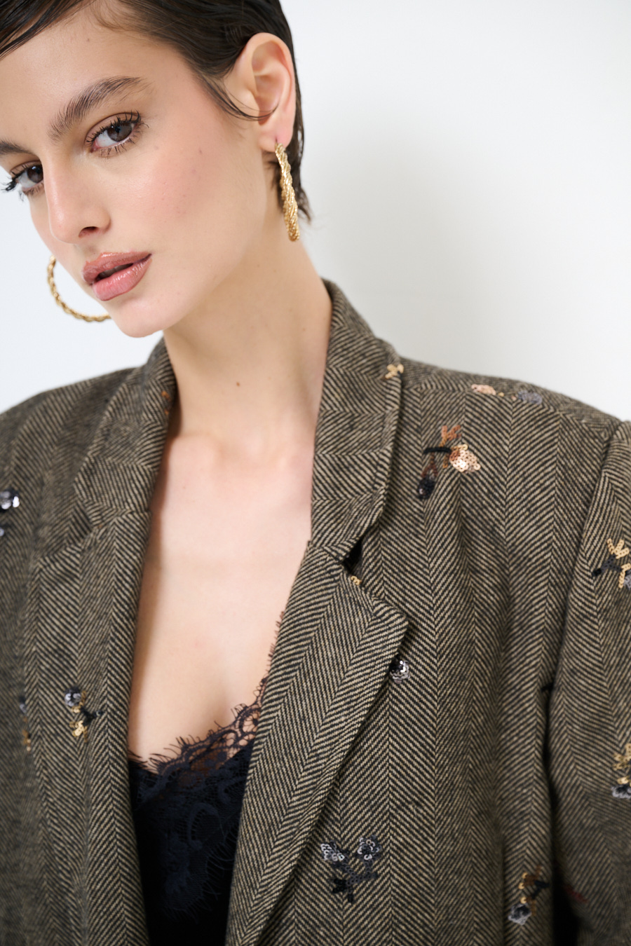 Giacca spigata a due bottoni con applicazioni paillettes, con finte tasche e foderata internamente.