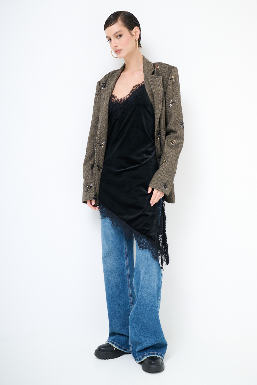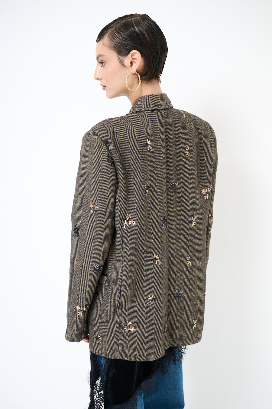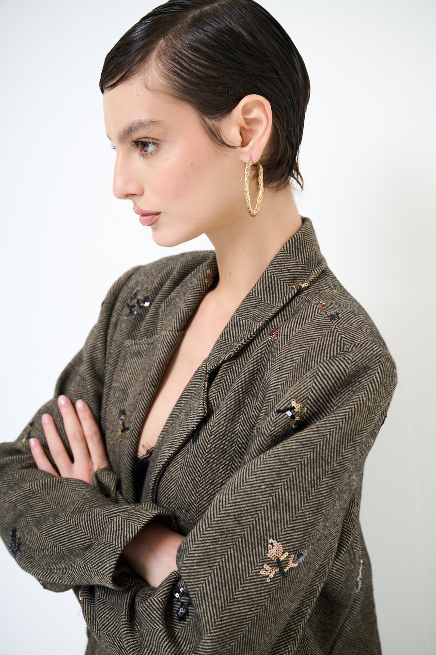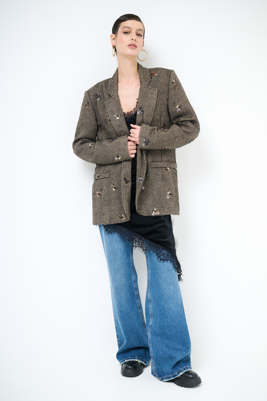 Giacca spigata a due bottoni con applicazioni paillettes, con finte tasche e foderata internamente.