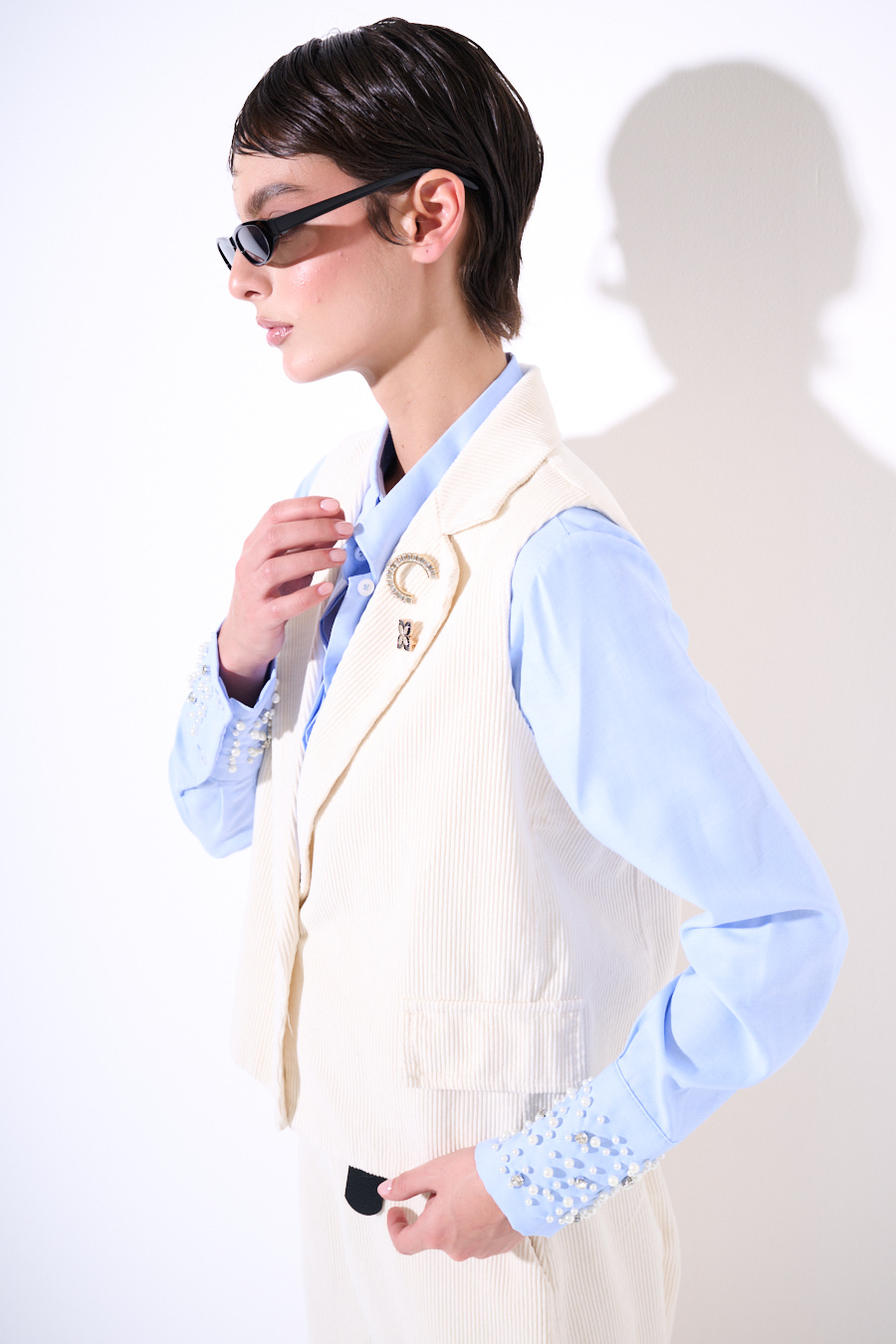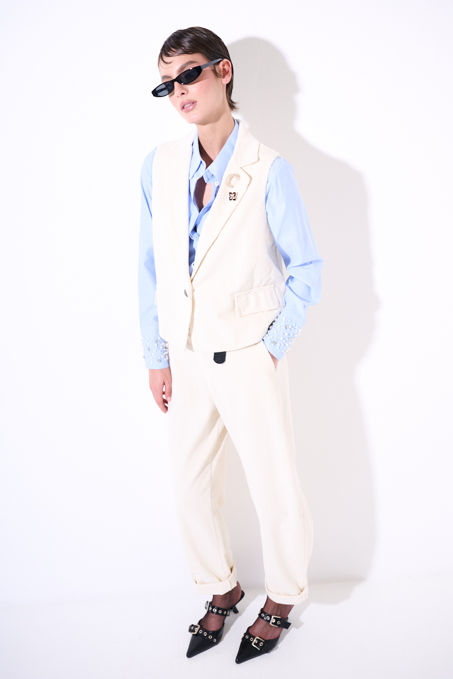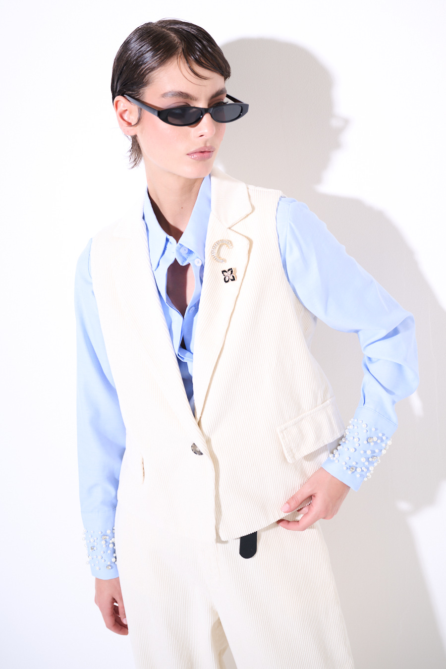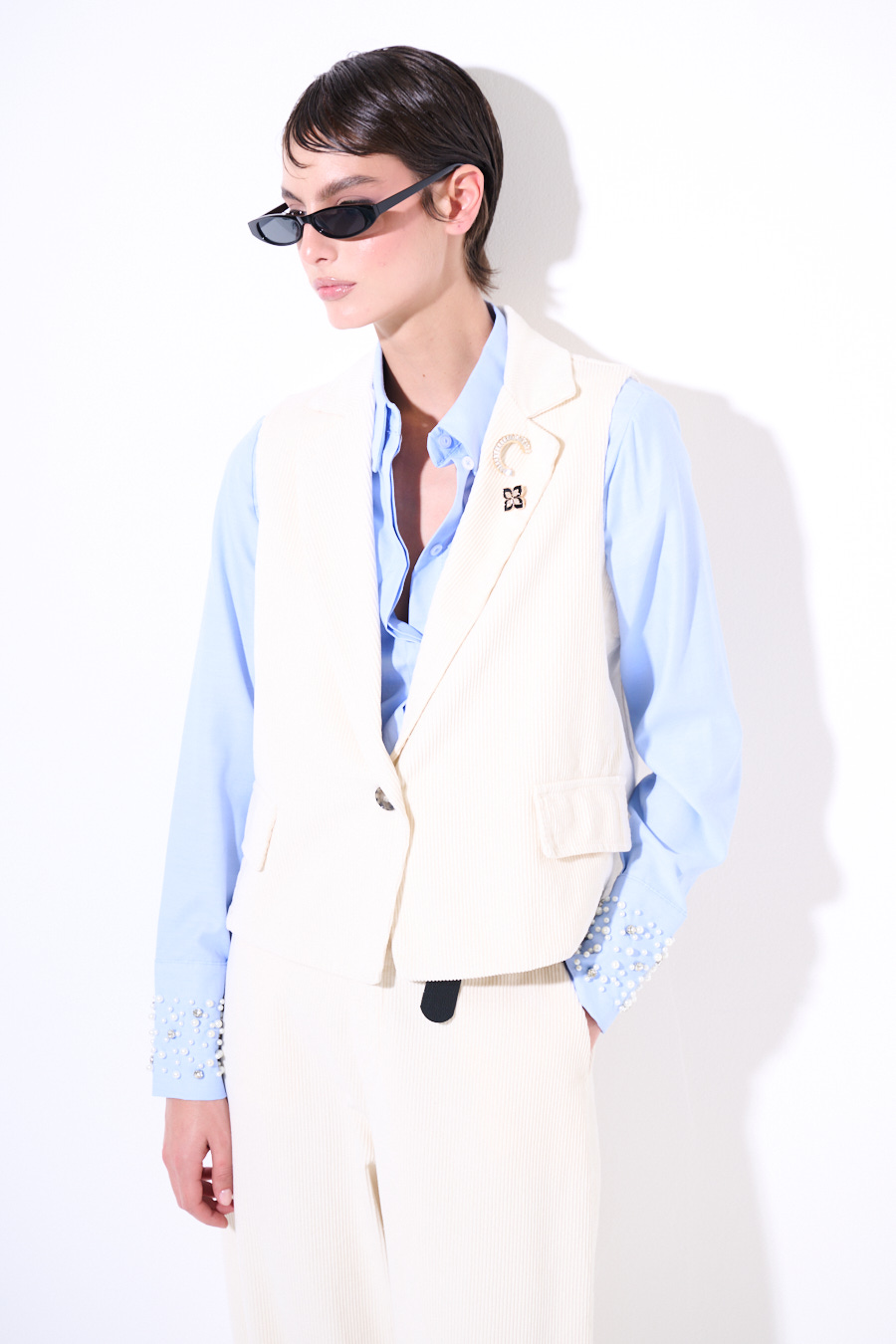 Gilet in velluto a coste a un bottone con ampio scollo e spille applicate su lcollo rever.