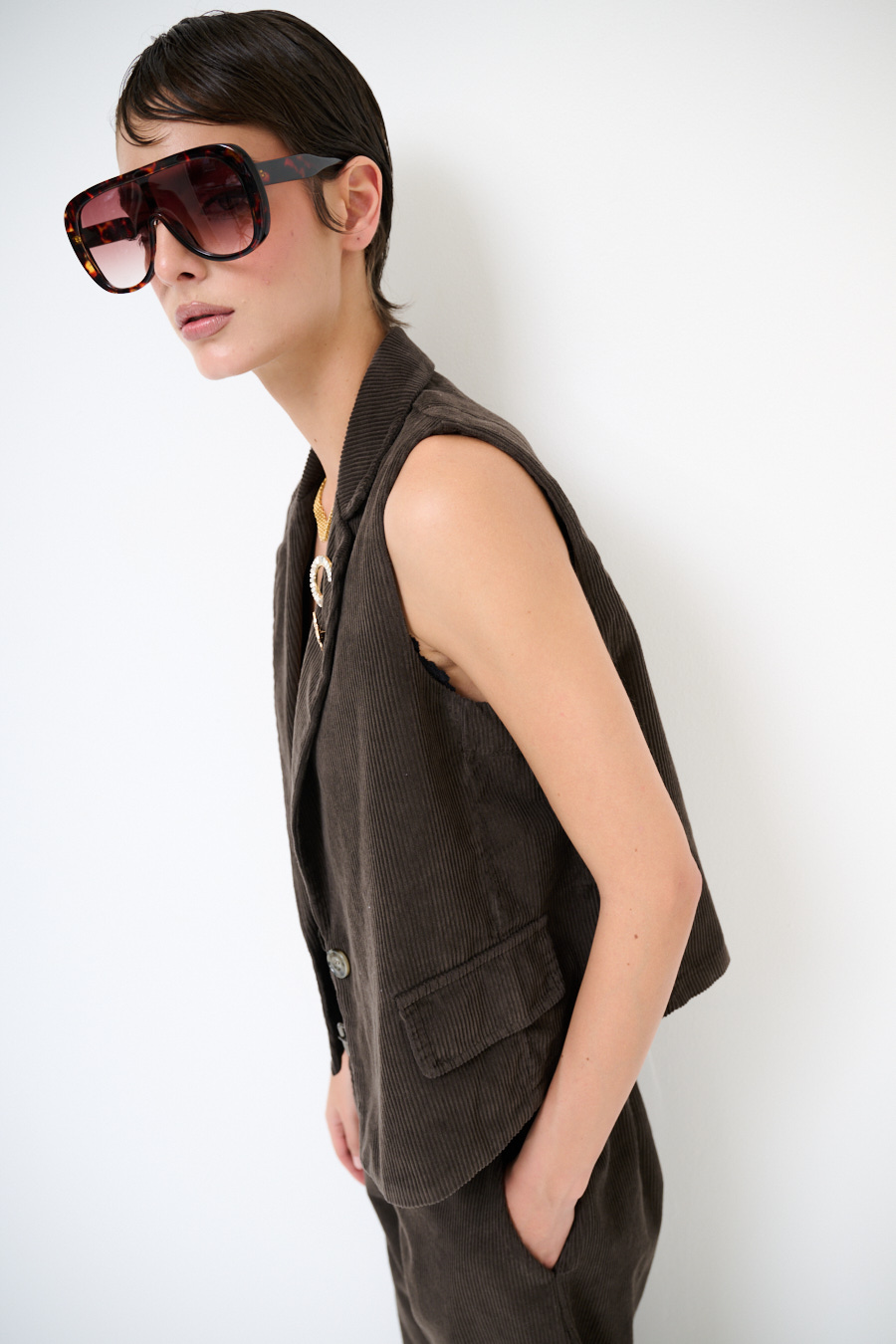 Gilet in velluto a coste a un bottone con ampio scollo e spille applicate su lcollo rever.