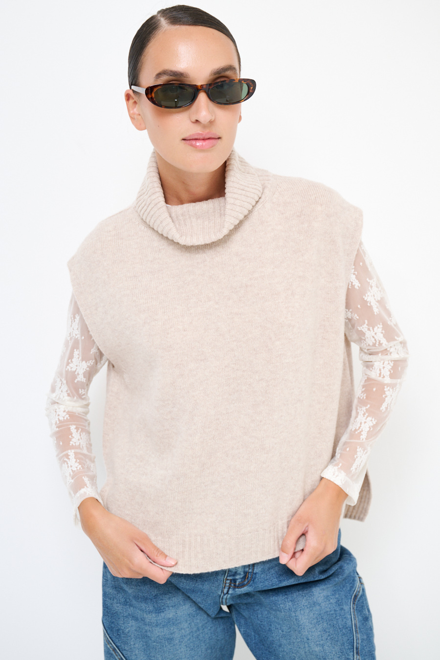 GILET COLLO ALTO CON SPACCHI LANA CACHEMIRE BEIGE