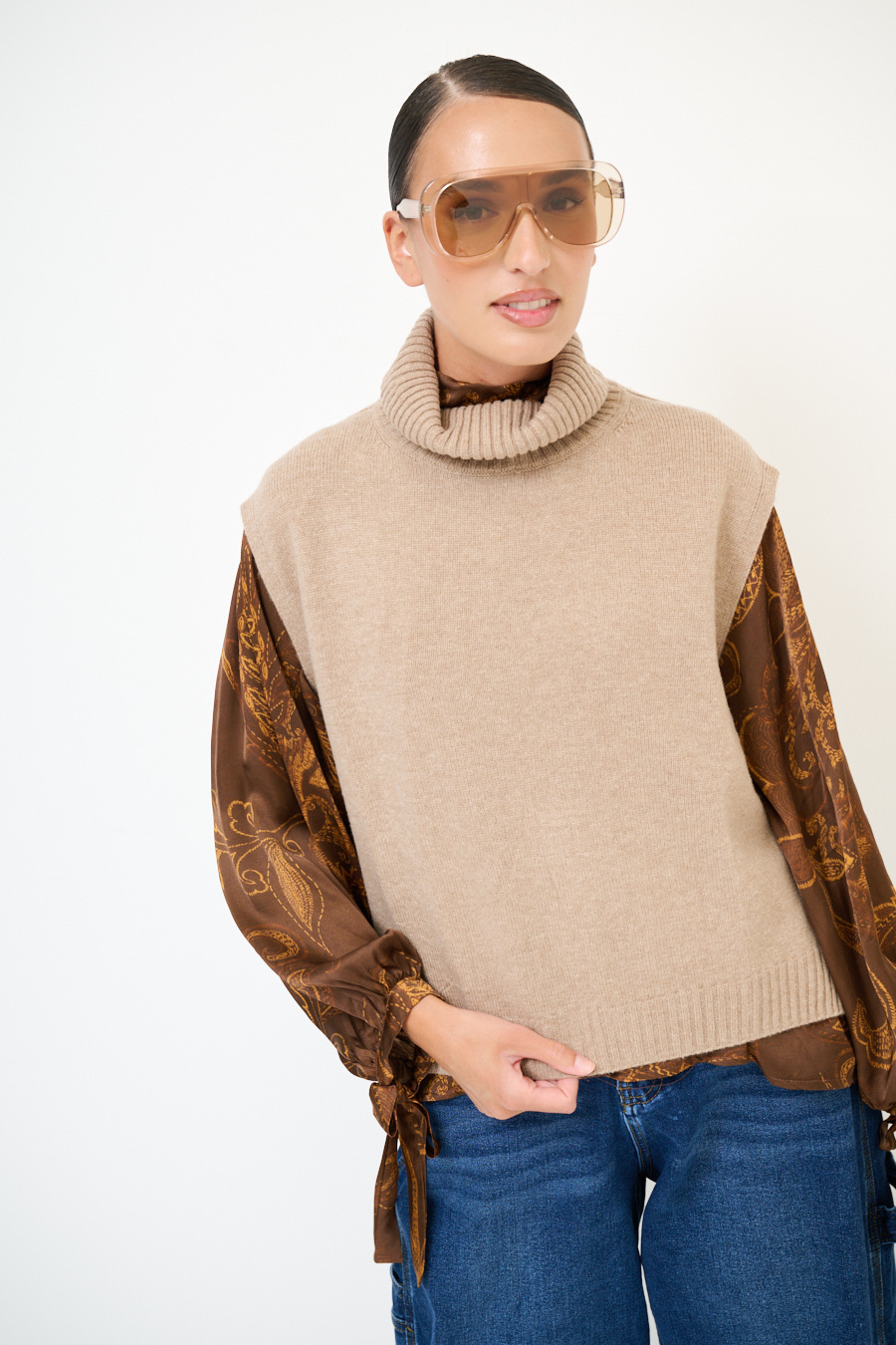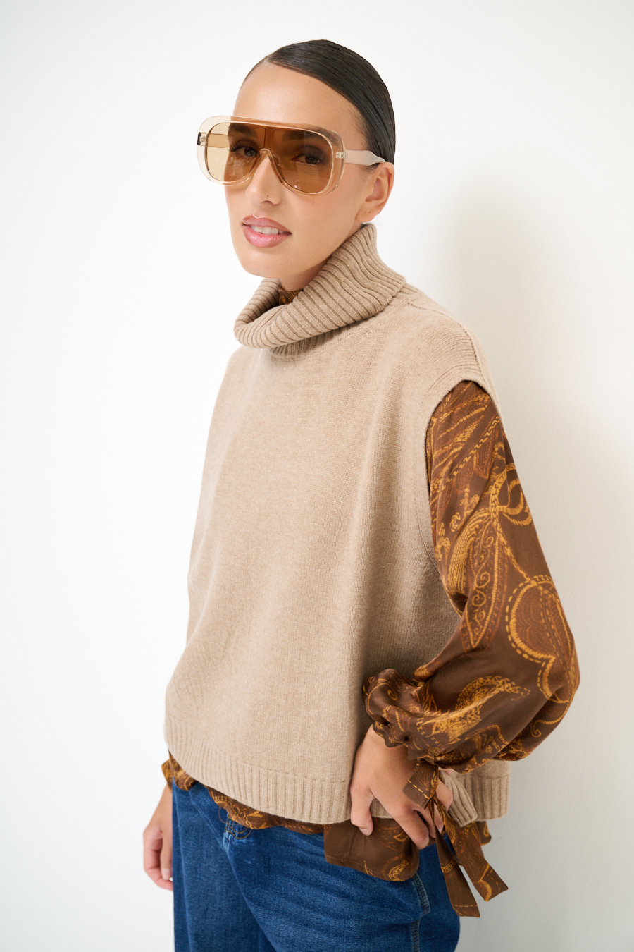 GILET COLLO ALTO CON SPACCHI LANA CACHEMIRE CAMMELLO