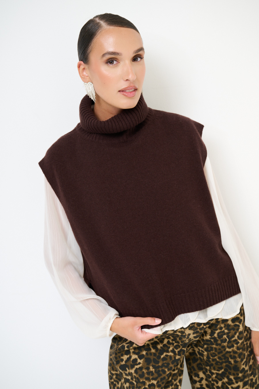 GILET COLLO ALTO CON SPACCHI LANA CACHEMIRE COFFEE