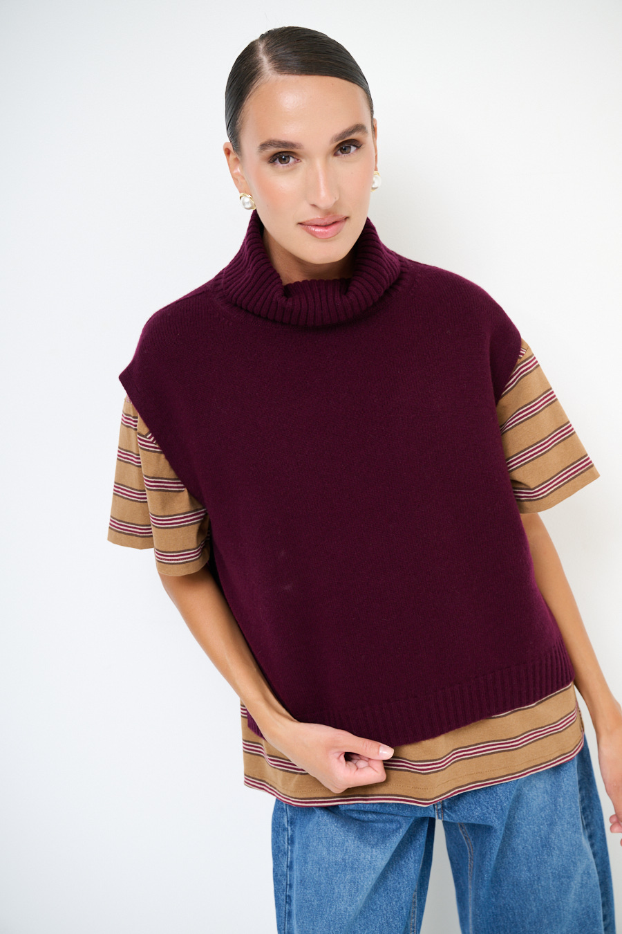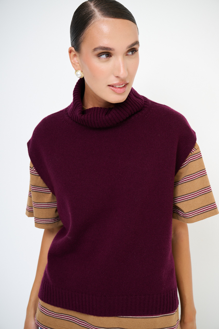 GILET COLLO ALTO CON SPACCHI LANA CACHEMIRE VINO