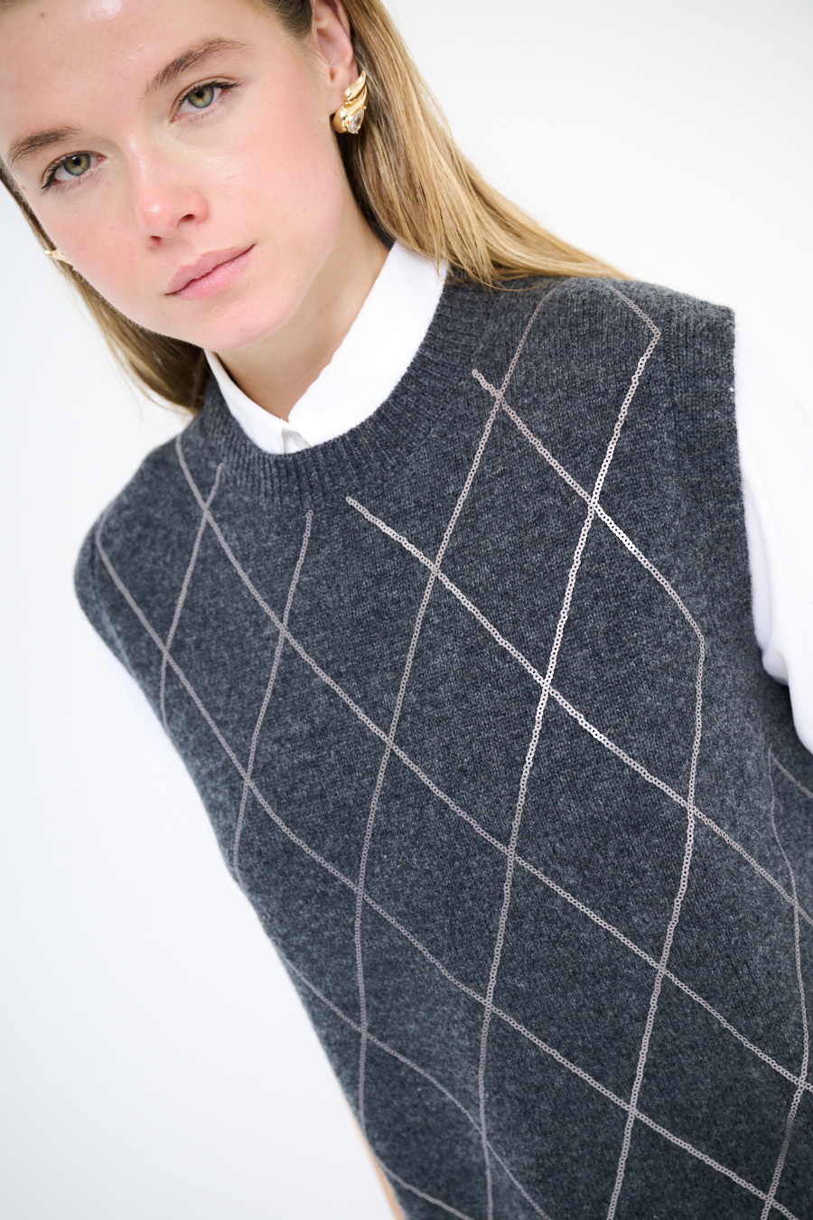 Gilet girocollo con disegno rombi in paillettes sul davanti, con spacchi laterali.