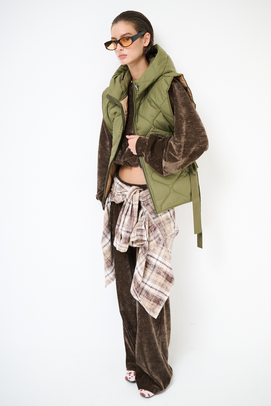 Gilet trapuntato oversize con colletto e cappuccio, chiusura con zip centrale e stondato sul fondo, con lacci laterali.