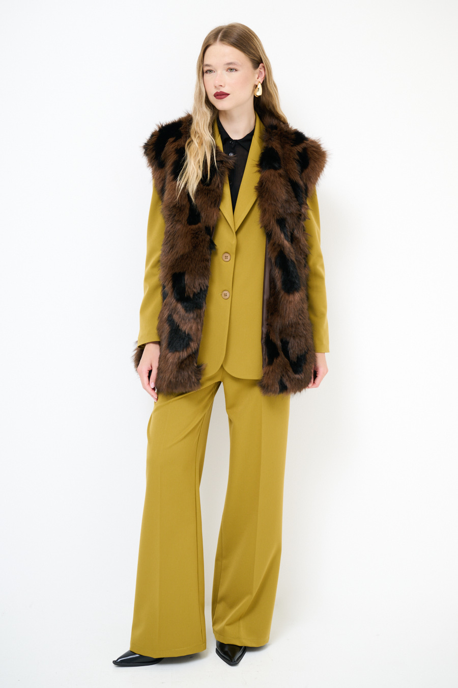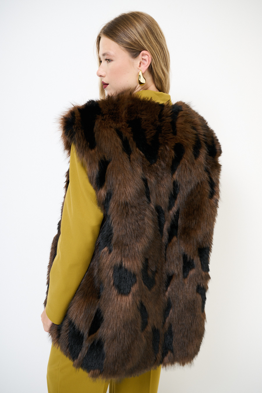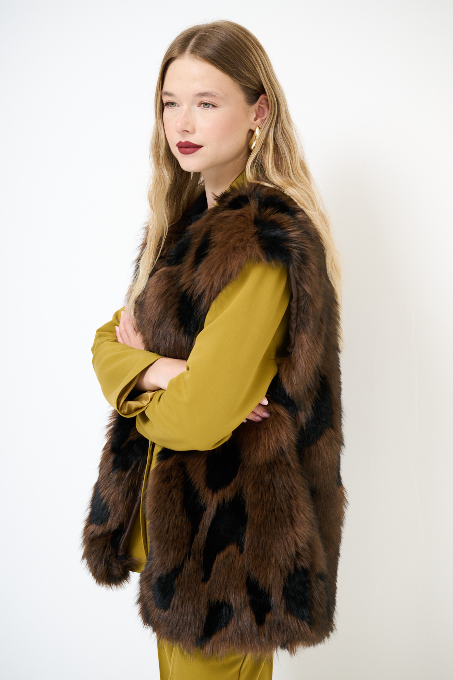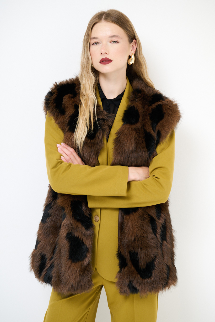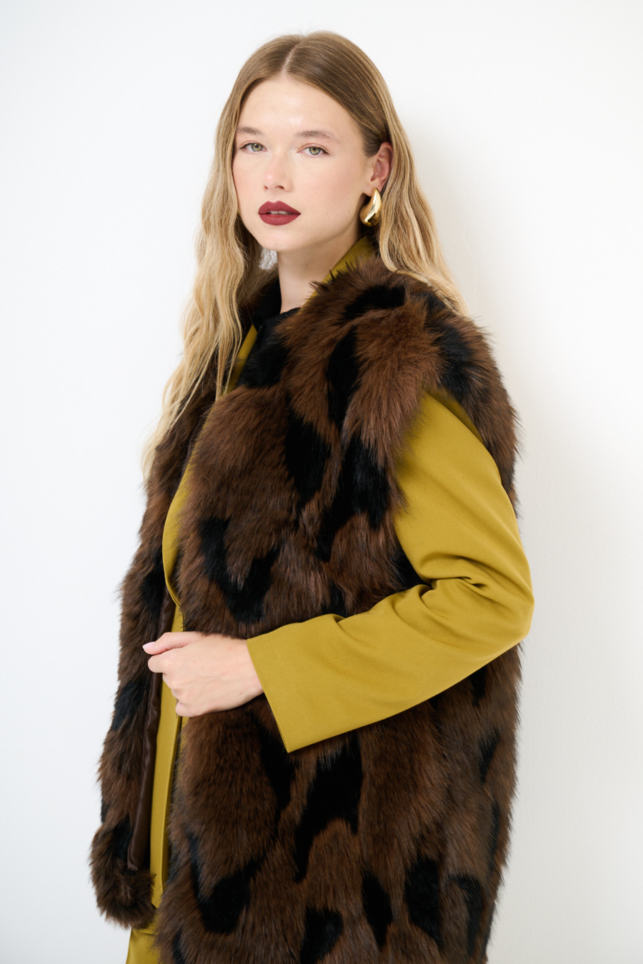 Gilet smanicato muccato lungo chiusura con unica clip in alto e interno con fodera.