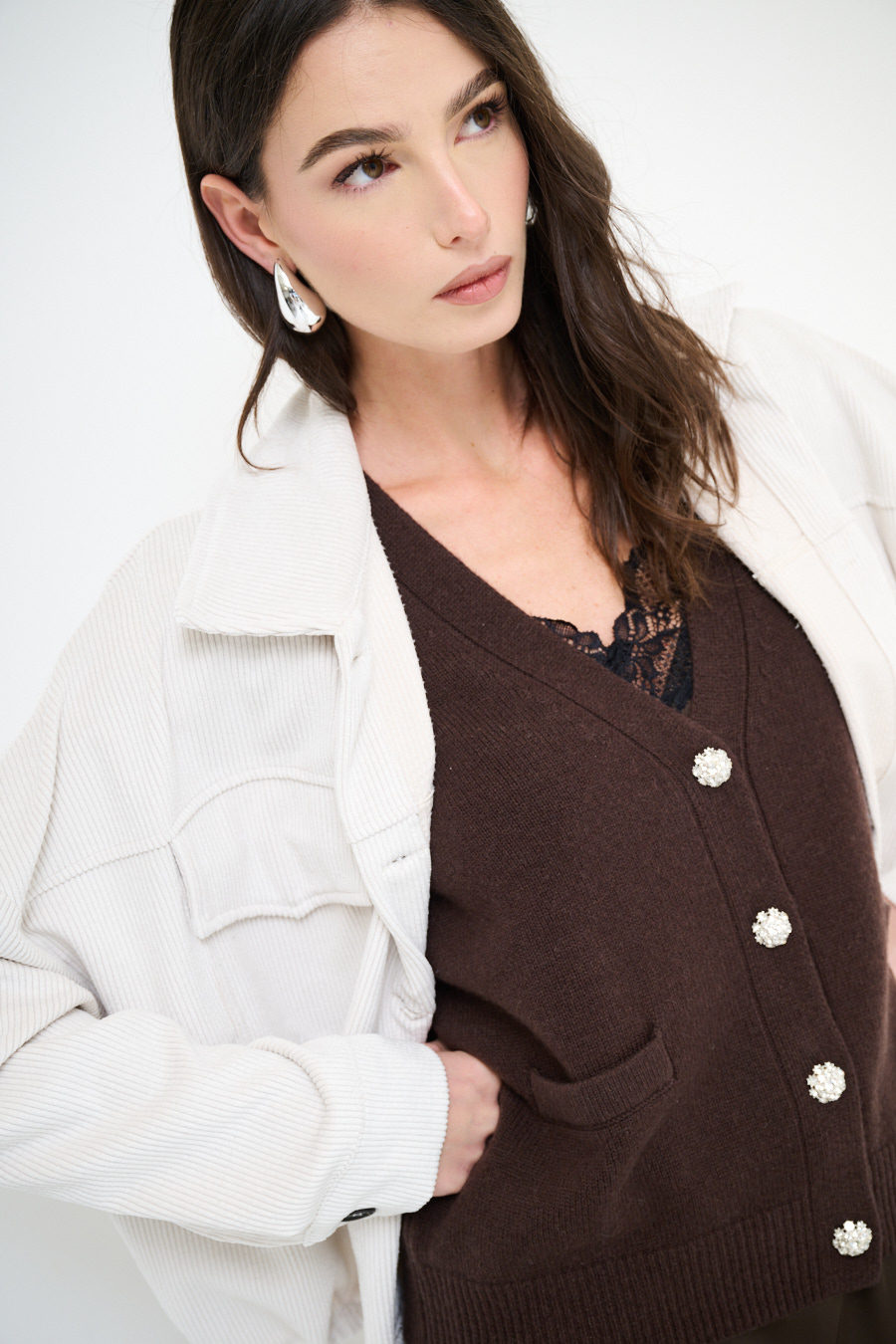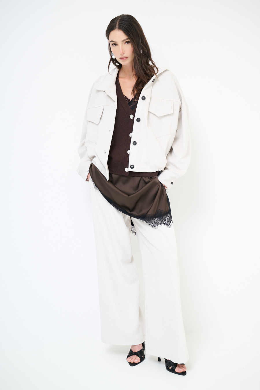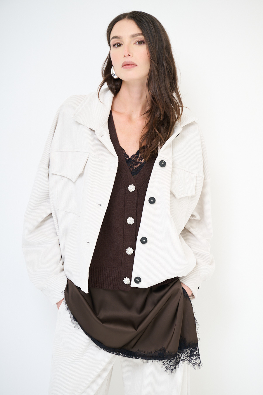 Giubbotto crop in velluto a coste, con abbottonatura frontale, elsatico sul fondo e ampie tasche frontali.