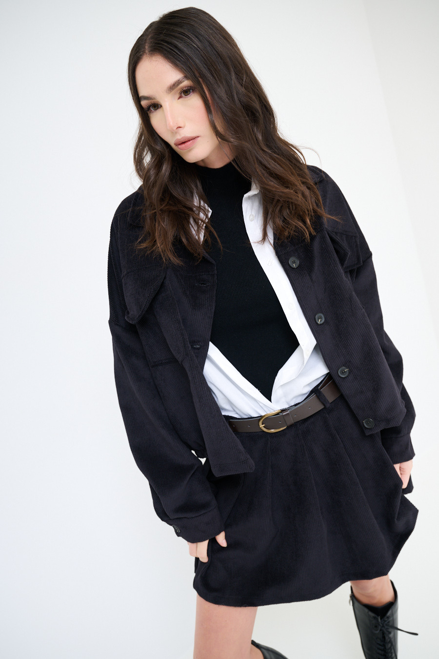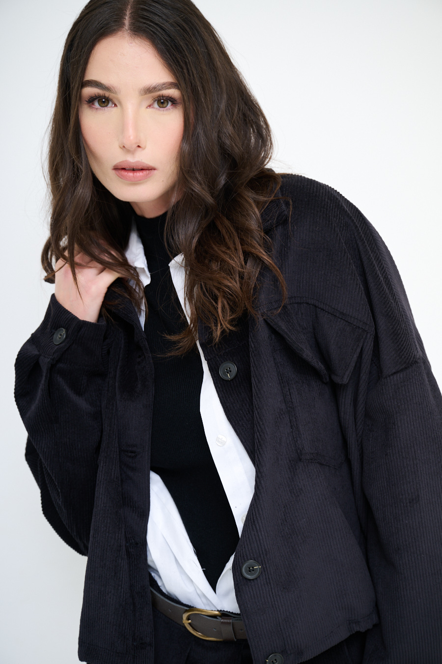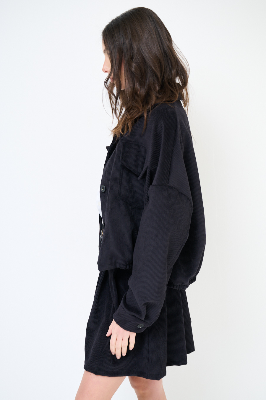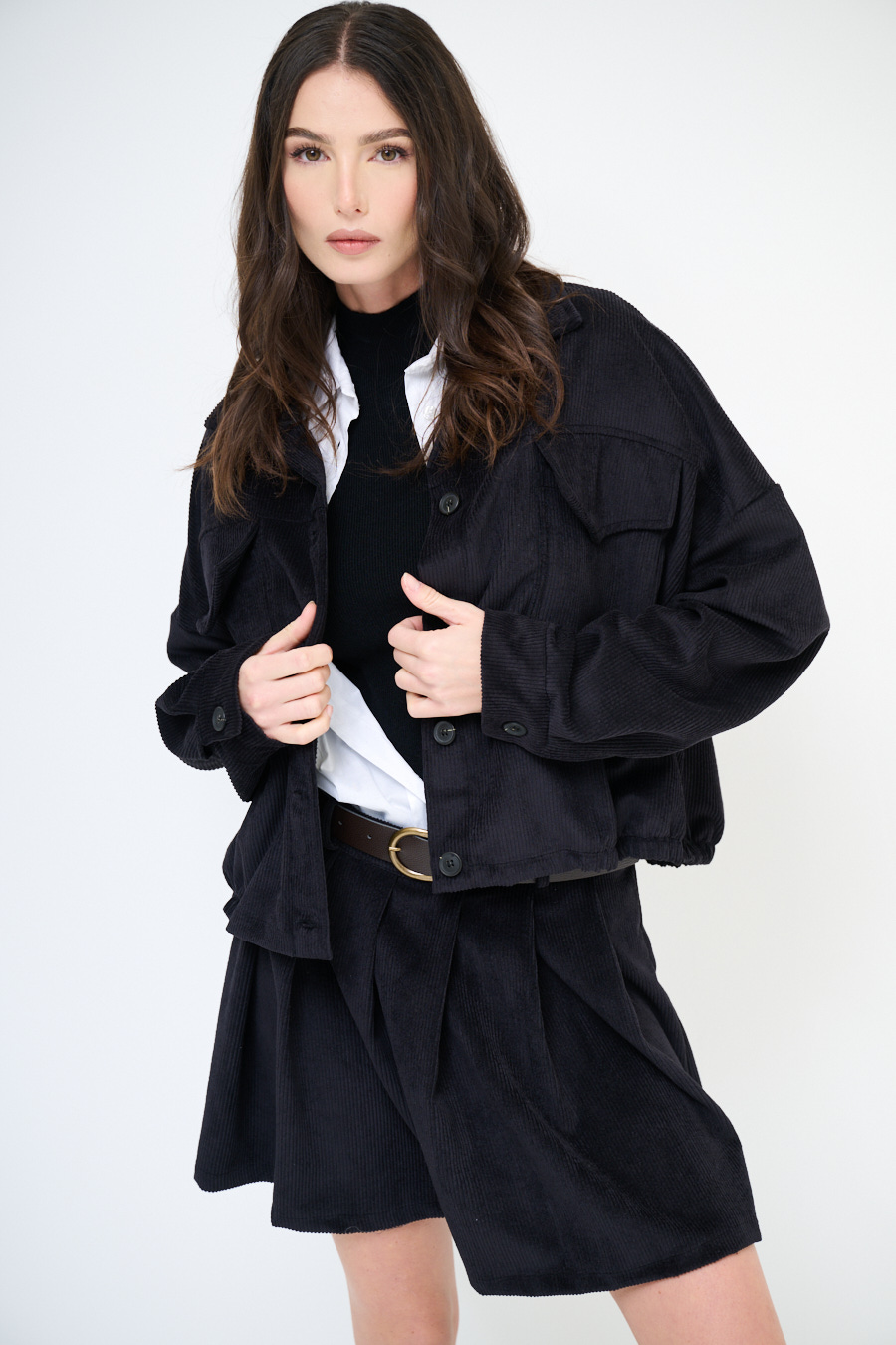 Giubbotto crop in velluto a coste, con abbottonatura frontale, elsatico sul fondo e ampie tasche frontali.