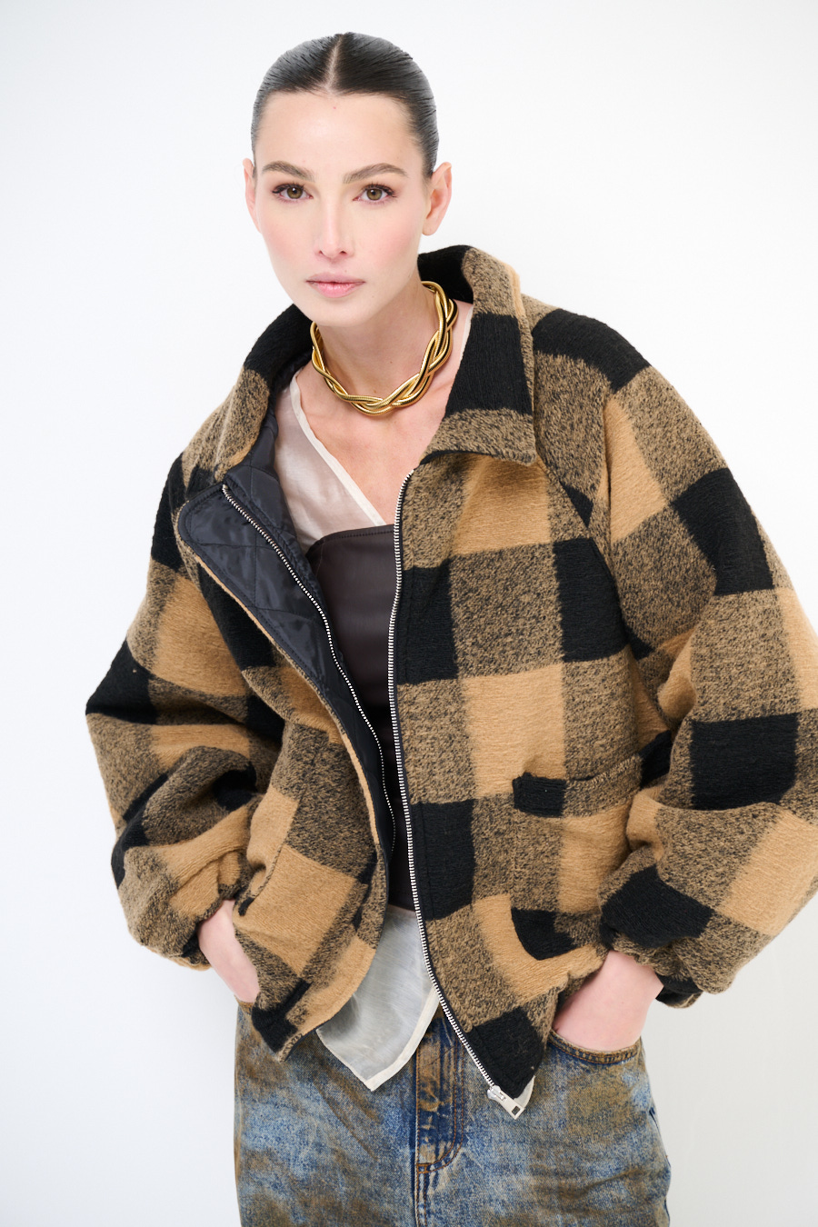 Giubbotto bomber in lana cotta a quadri, con zip coperta da patta, ampie tasche frontali e elasticizzato sul fondo, fodera interna trapuntata.