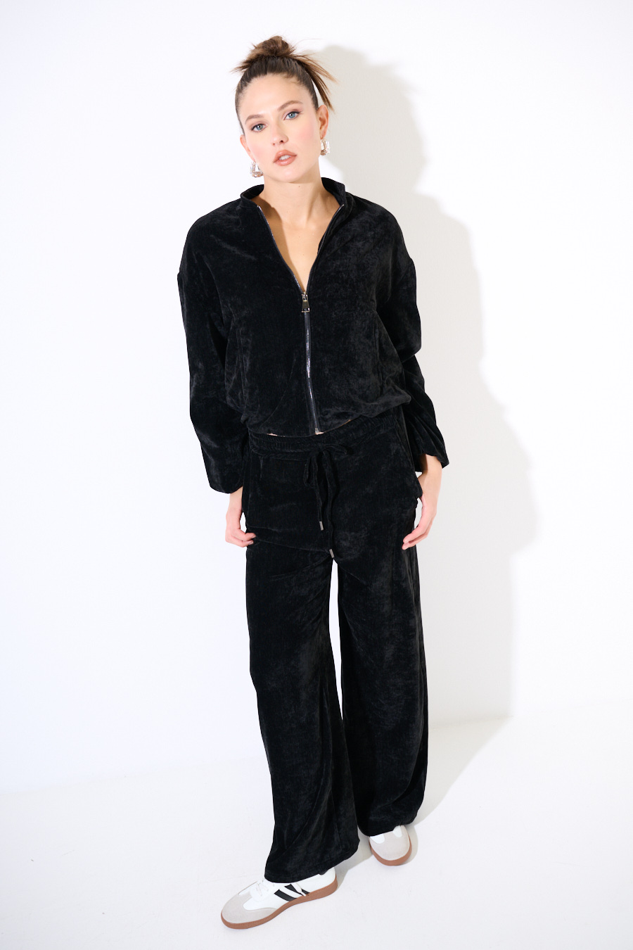 Giubbotto bomber in velluto con spalla calata, elastico sul fondo e chiusura con zip centrale, interno con fodera.