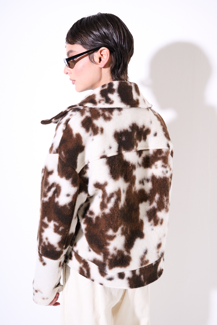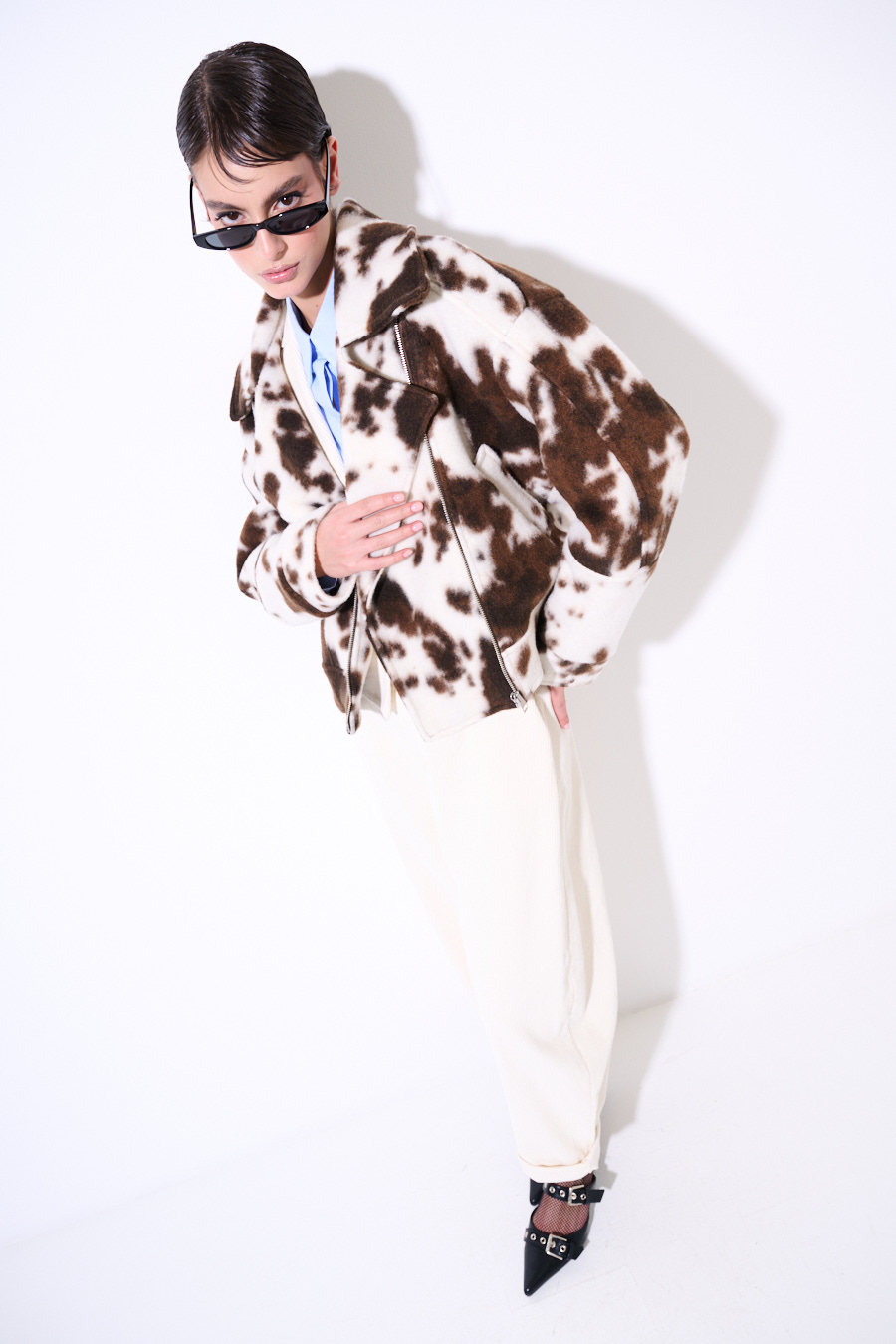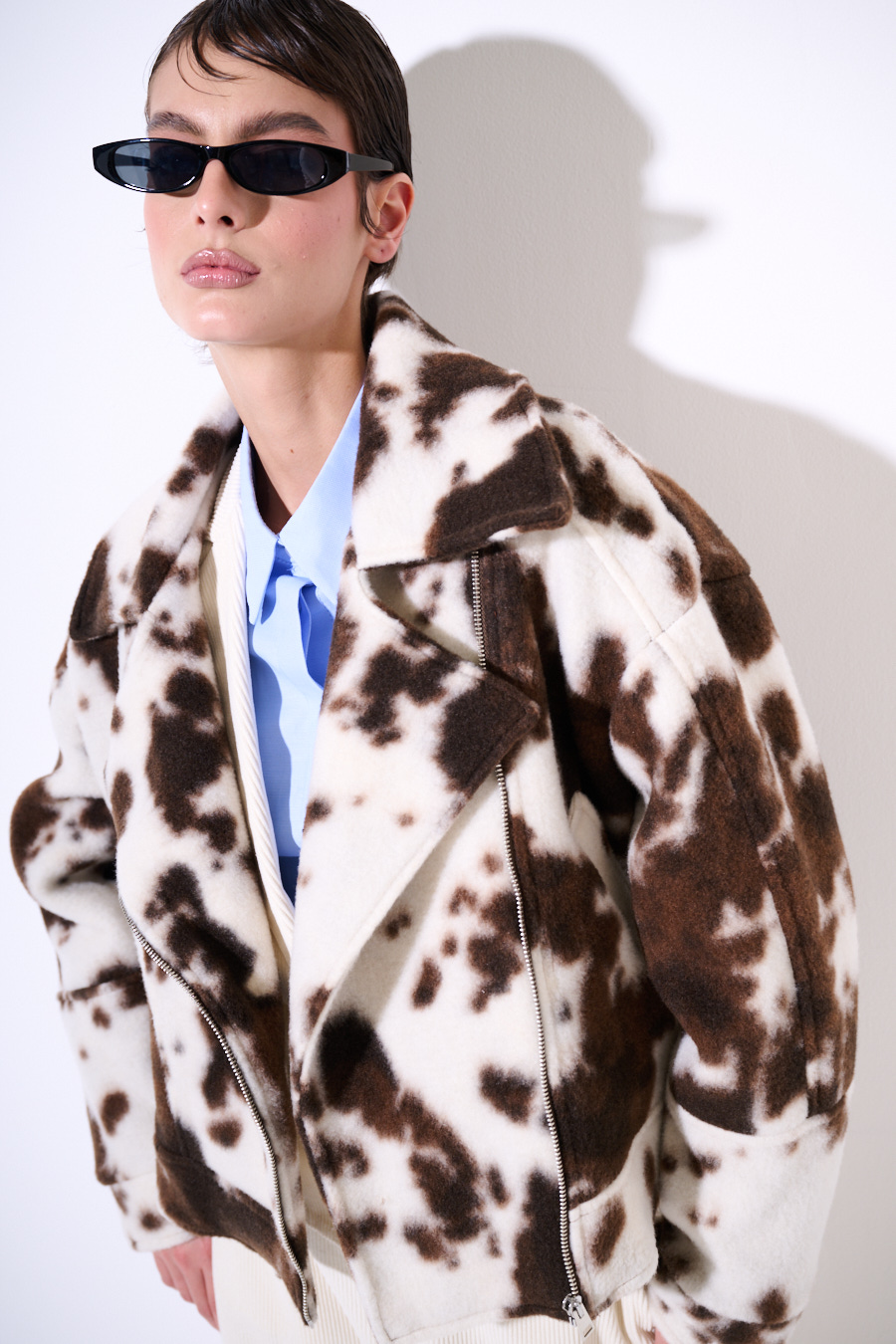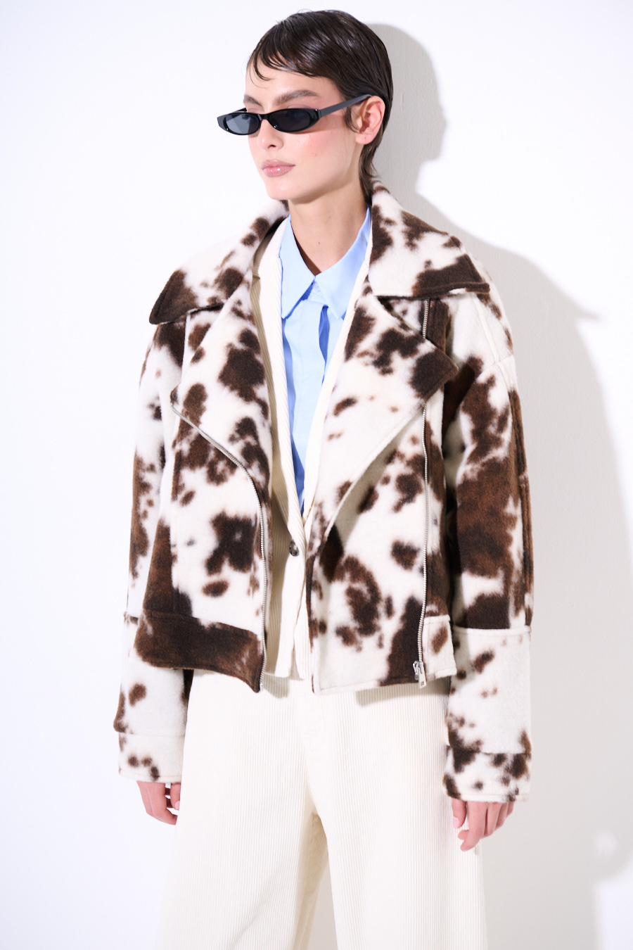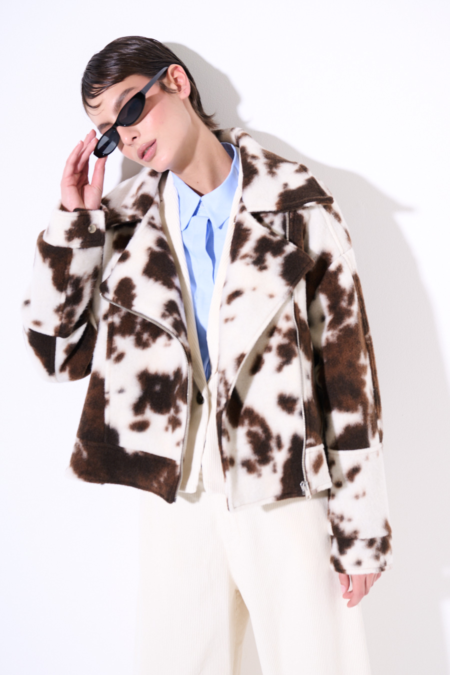 Giubbotto chiodo in lana cotta con chiusura a zip asimmetrica e spalla calata, foderato internamente.
