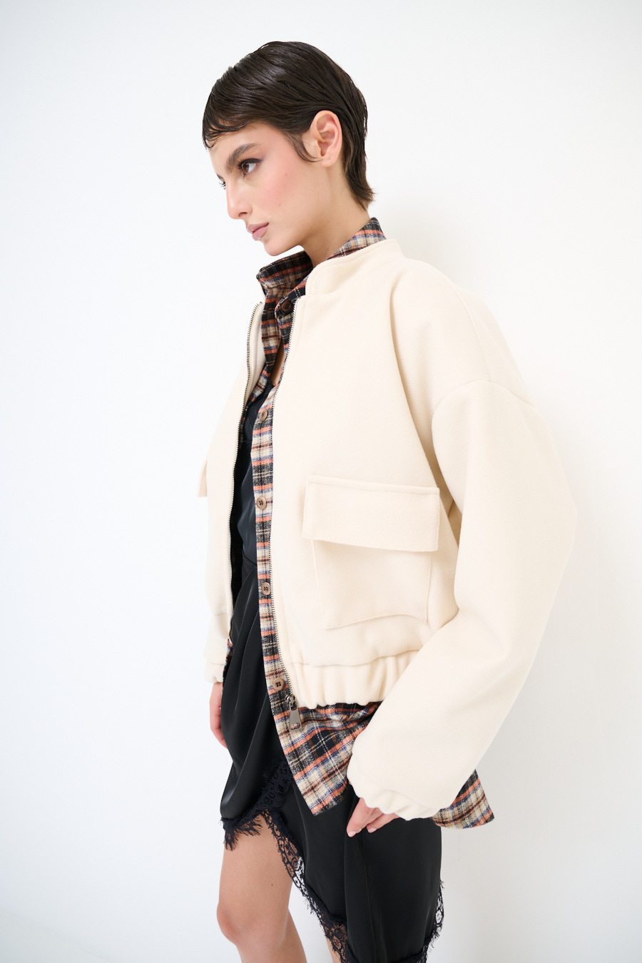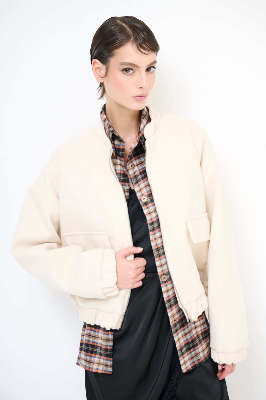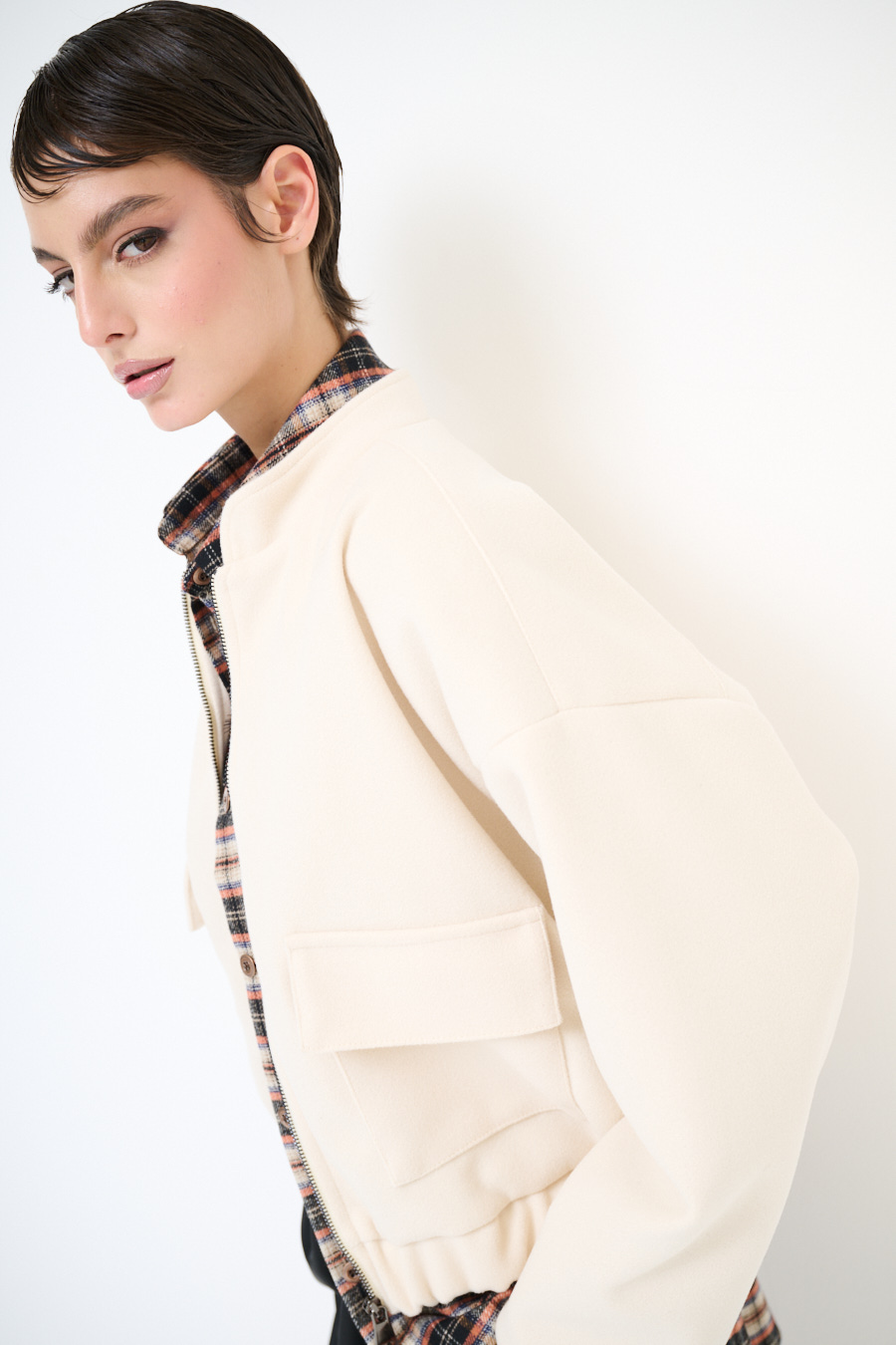 Bomber in panno pesante con tasconi frontali, chiusura con zip canna di fucile, elastico sul fondo e al polsino, spalla calata e foderato internamente.