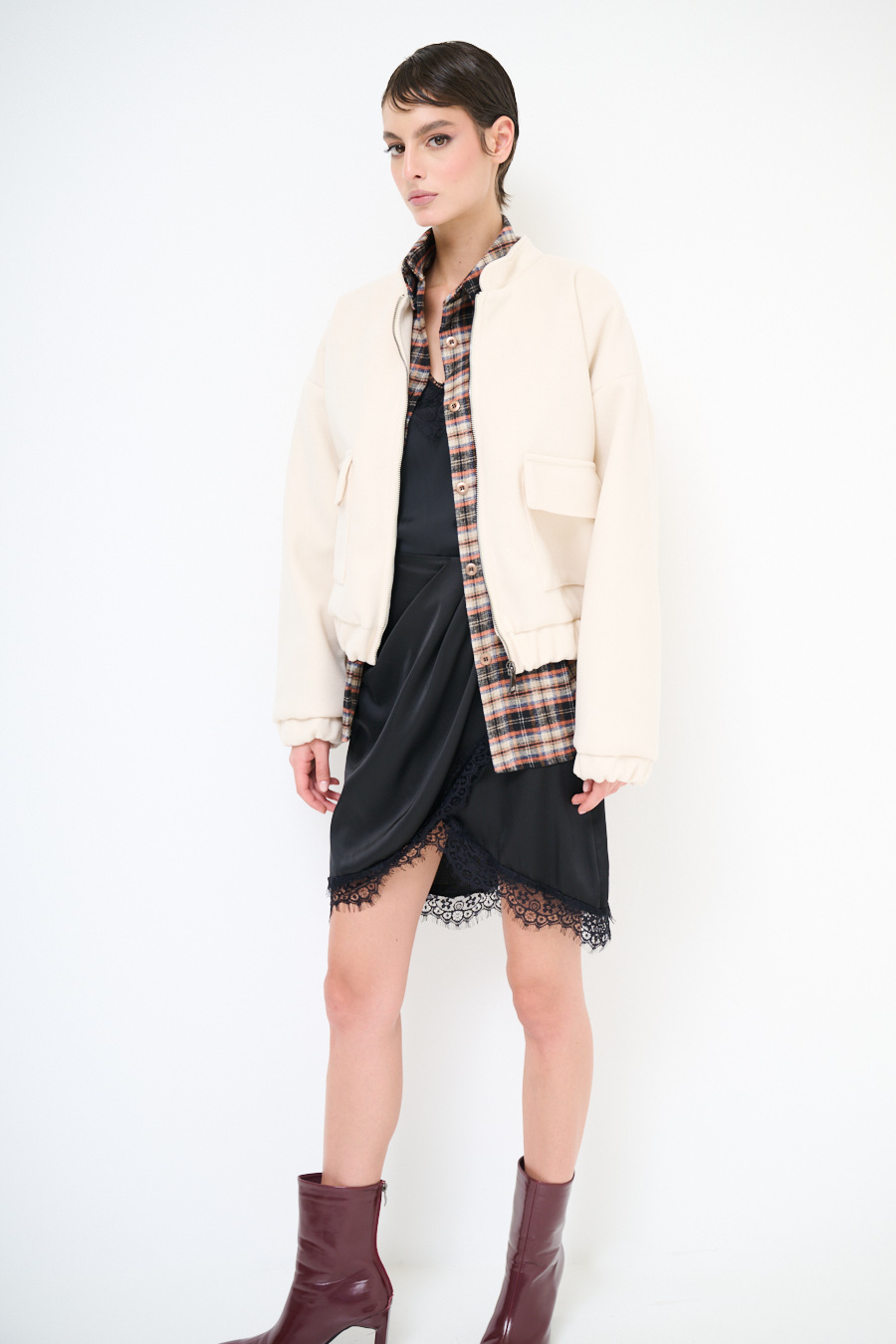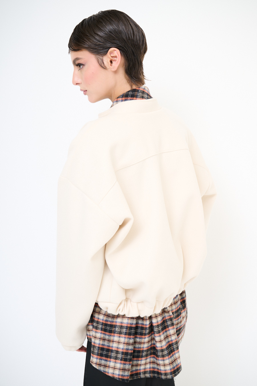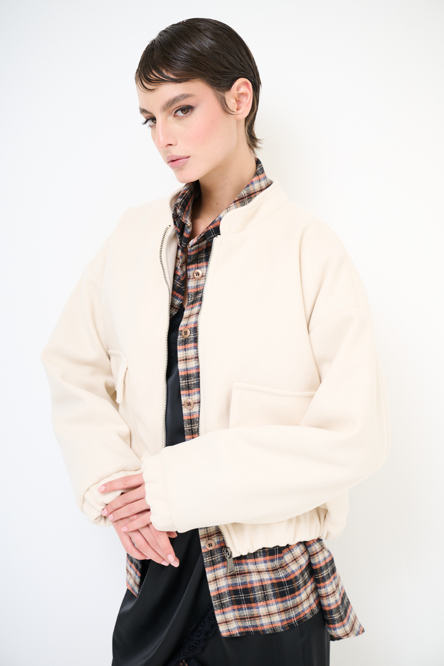 Bomber in panno pesante con tasconi frontali, chiusura con zip canna di fucile, elastico sul fondo e al polsino, spalla calata e foderato internamente.