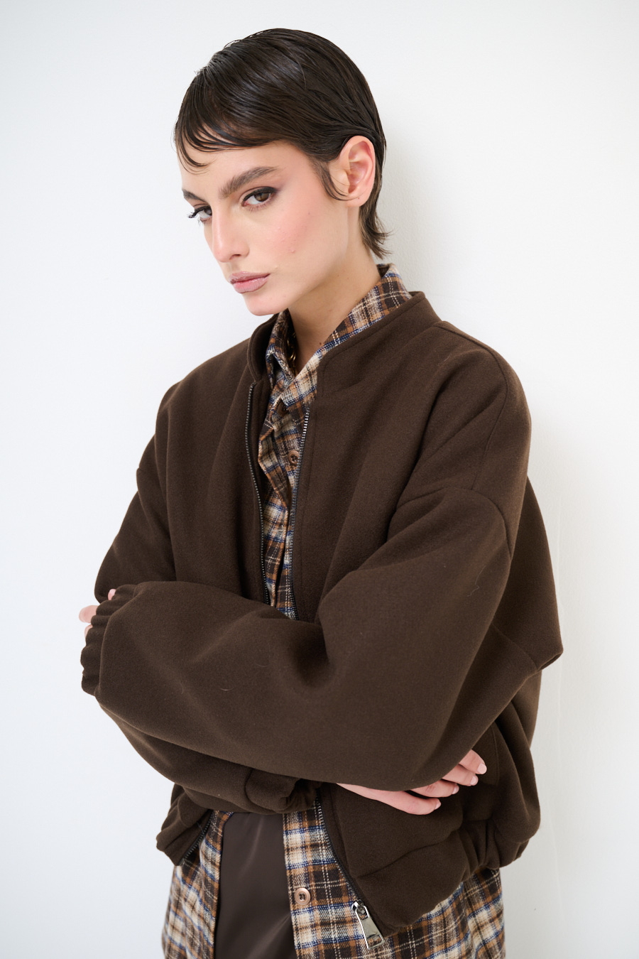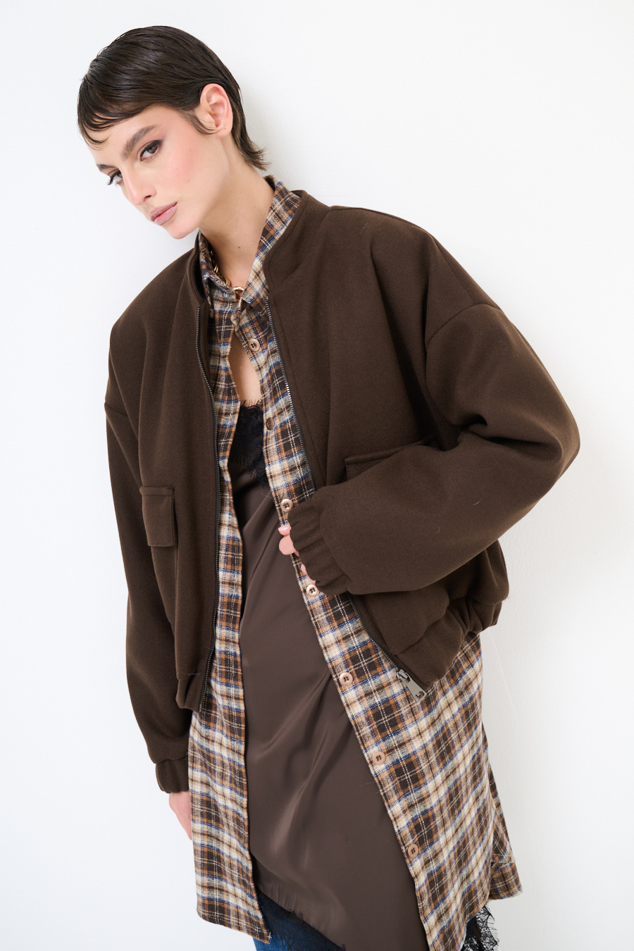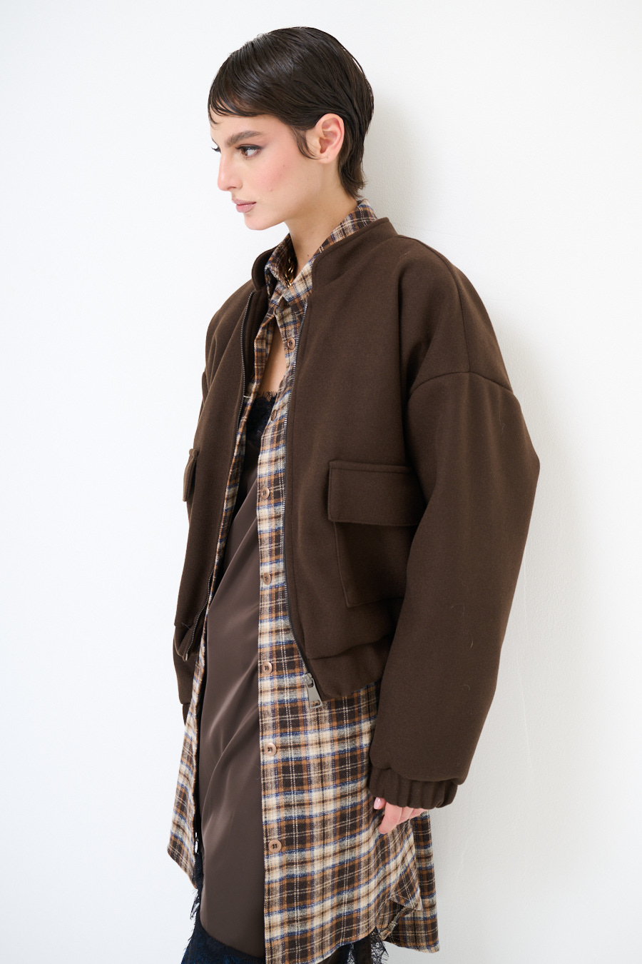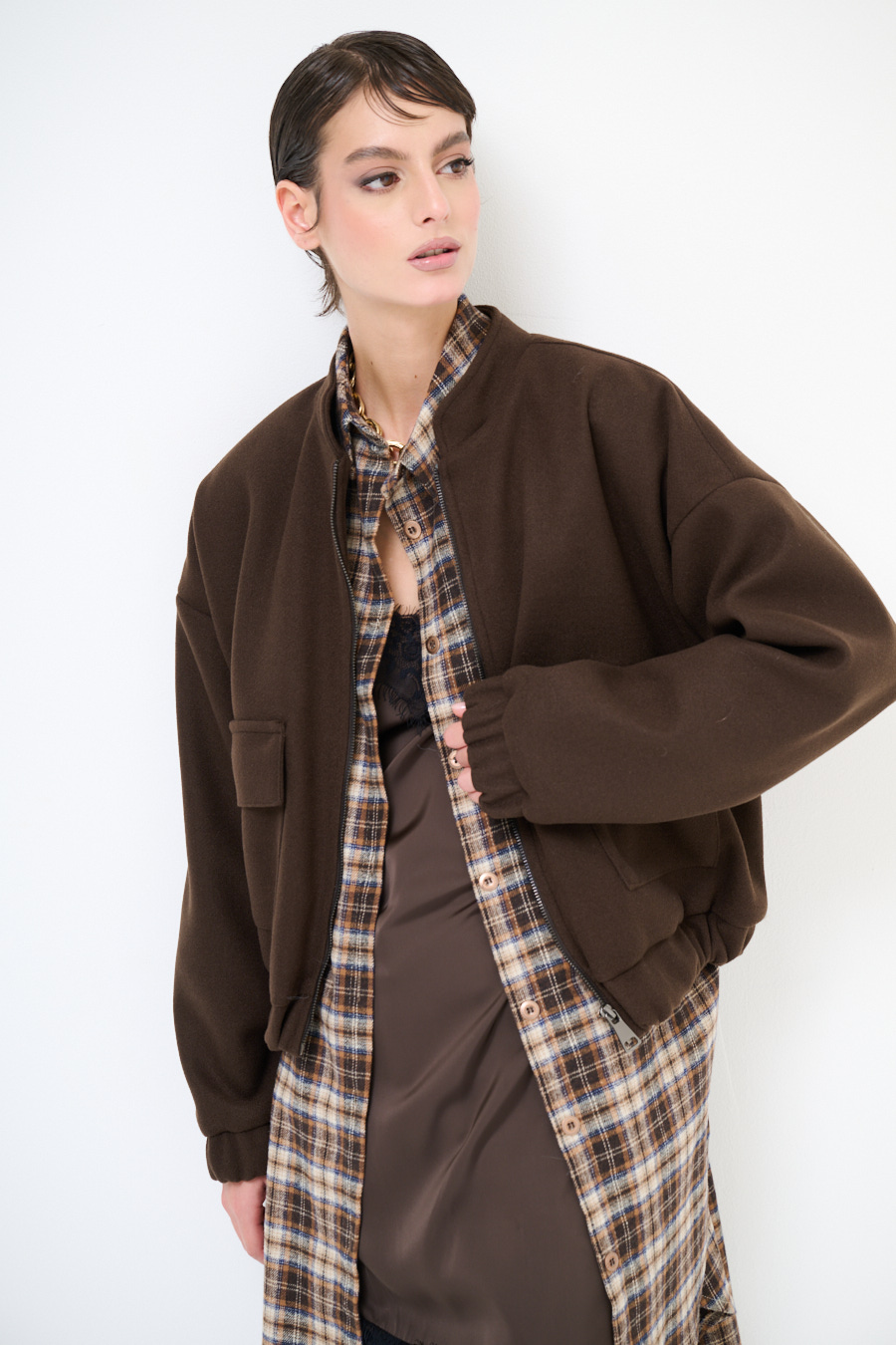 Bomber in panno pesante con tasconi frontali, chiusura con zip canna di fucile, elastico sul fondo e al polsino, spalla calata e foderato internamente.