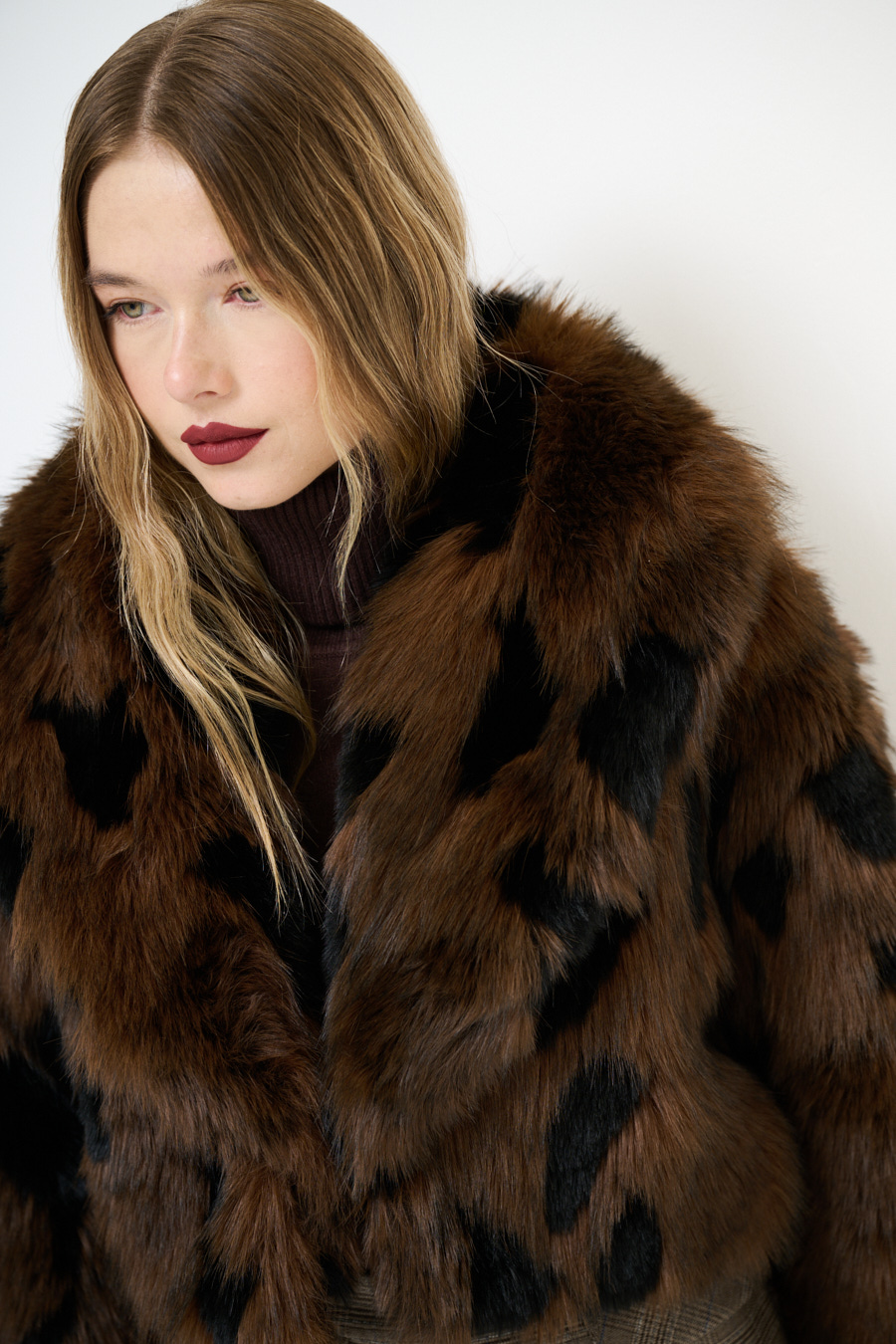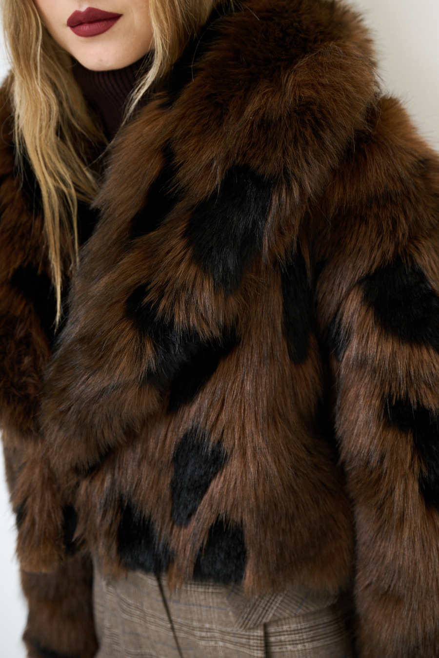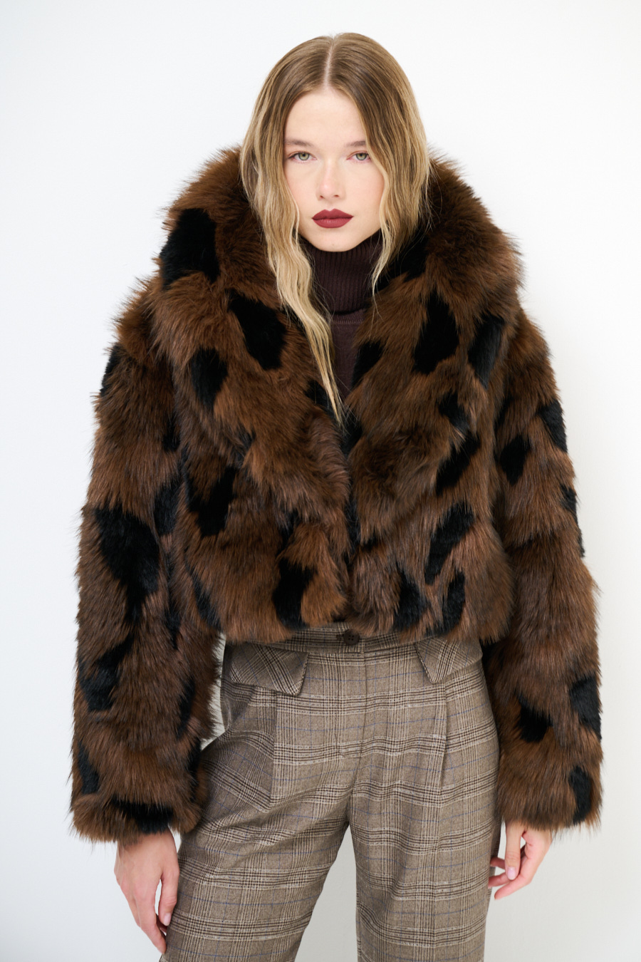 Pelliccia crop muccata con ampio collo rever, chiusura con gancetto, e interno con fodera.