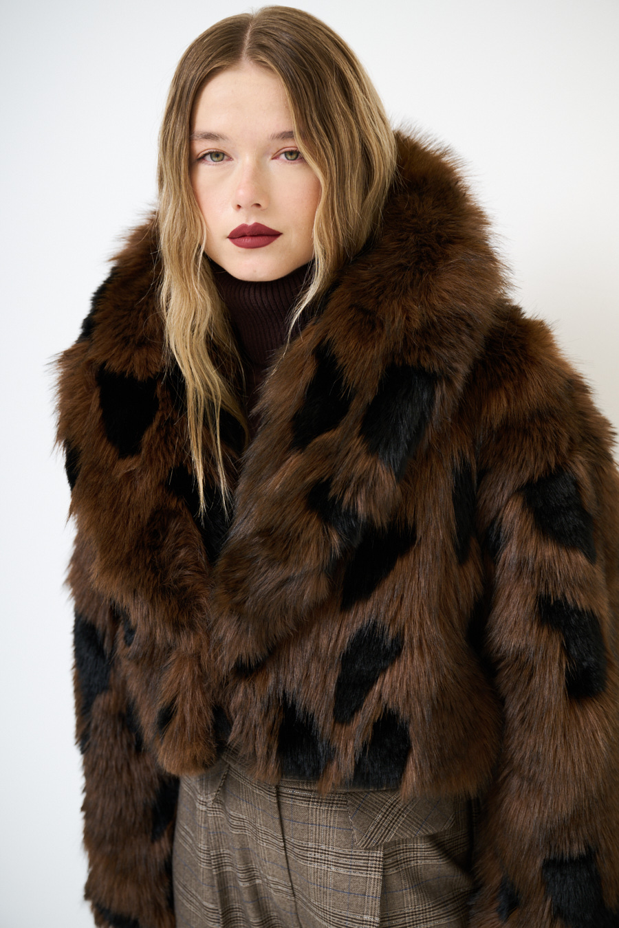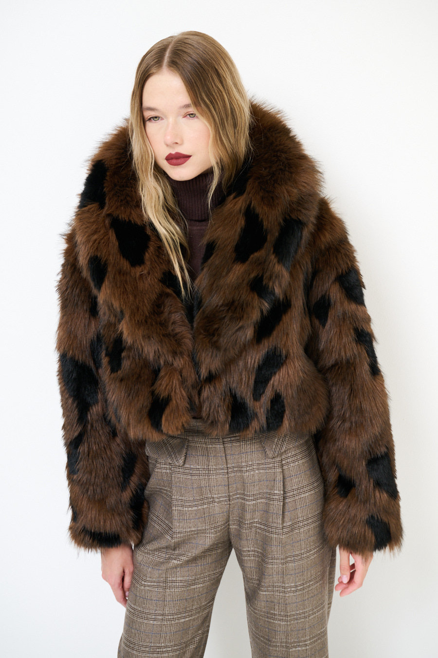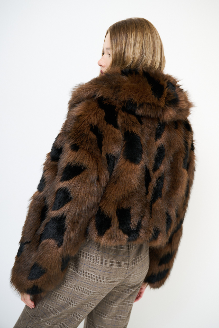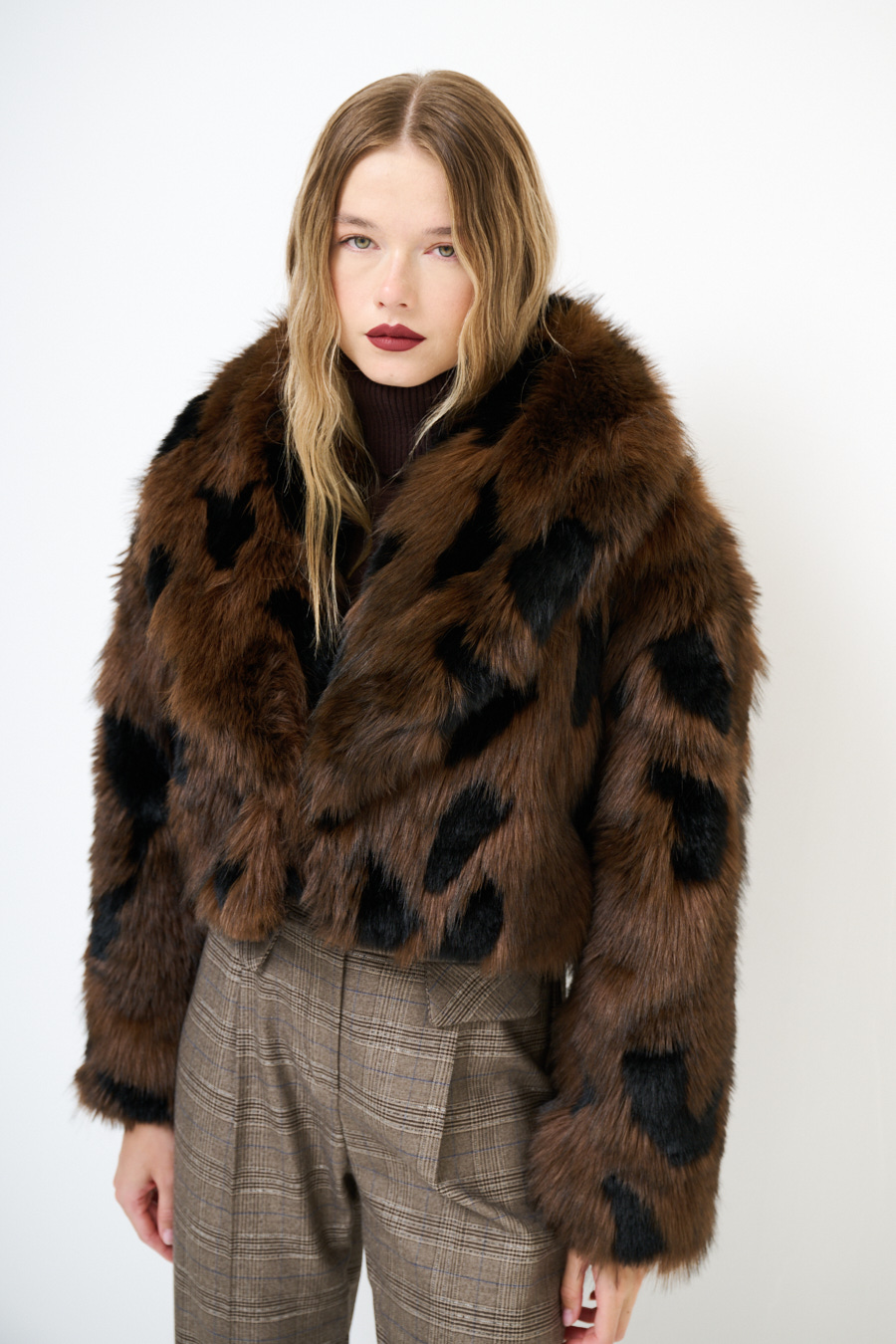 Pelliccia crop muccata con ampio collo rever, chiusura con gancetto, e interno con fodera.