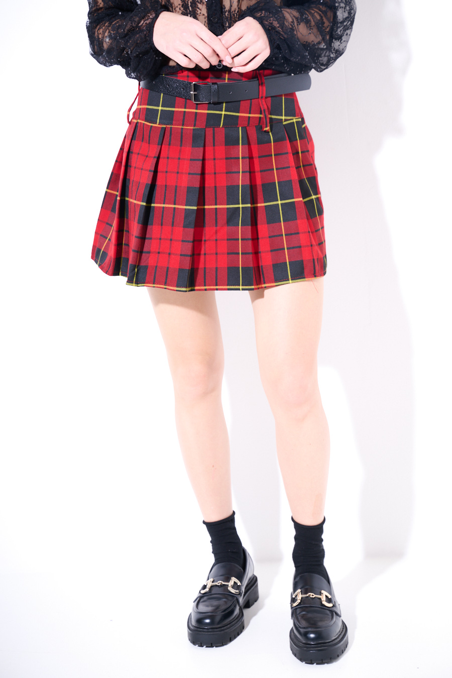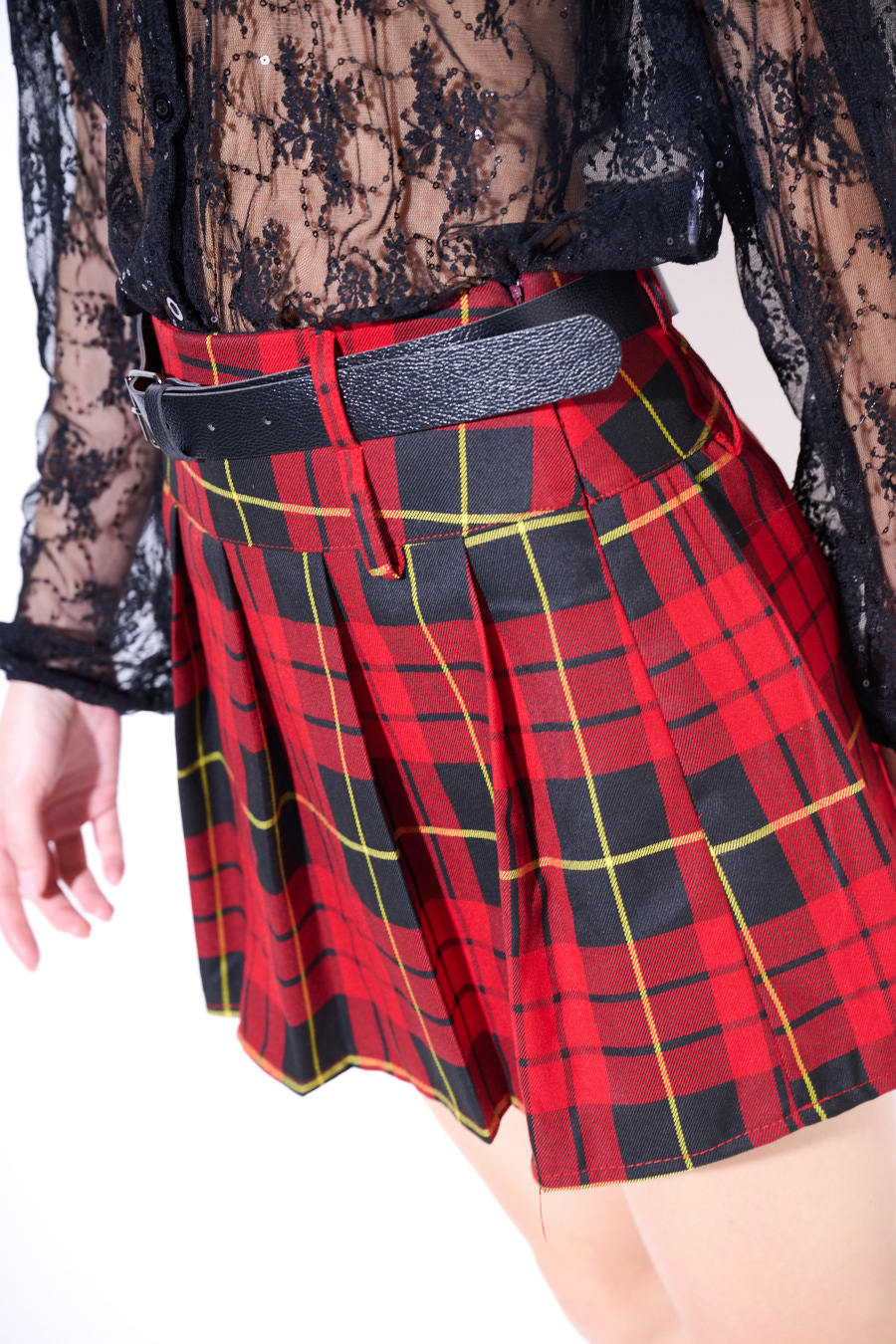 Minigonna check con pieghe, con vita alta e cintura in vita.